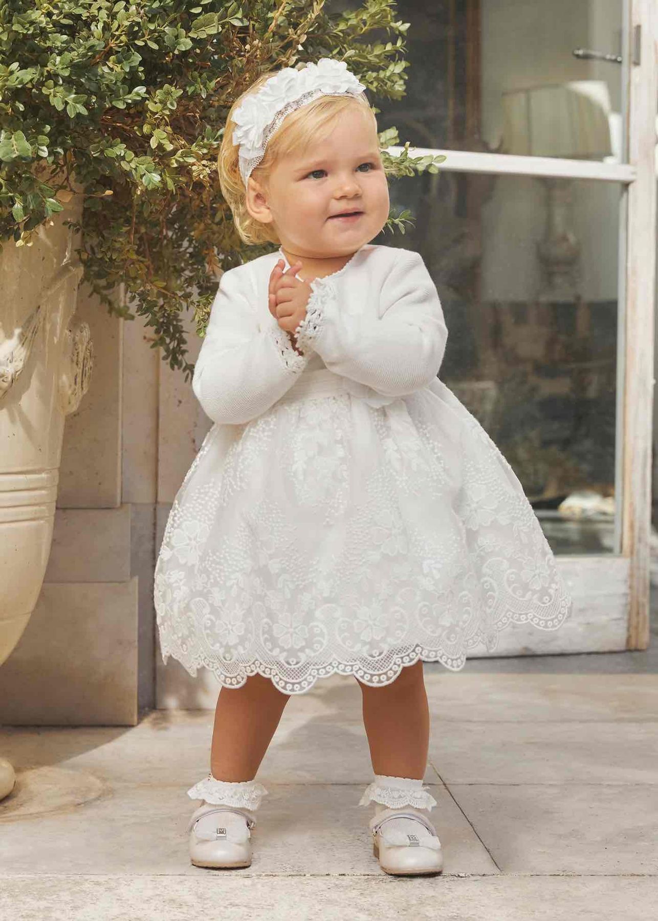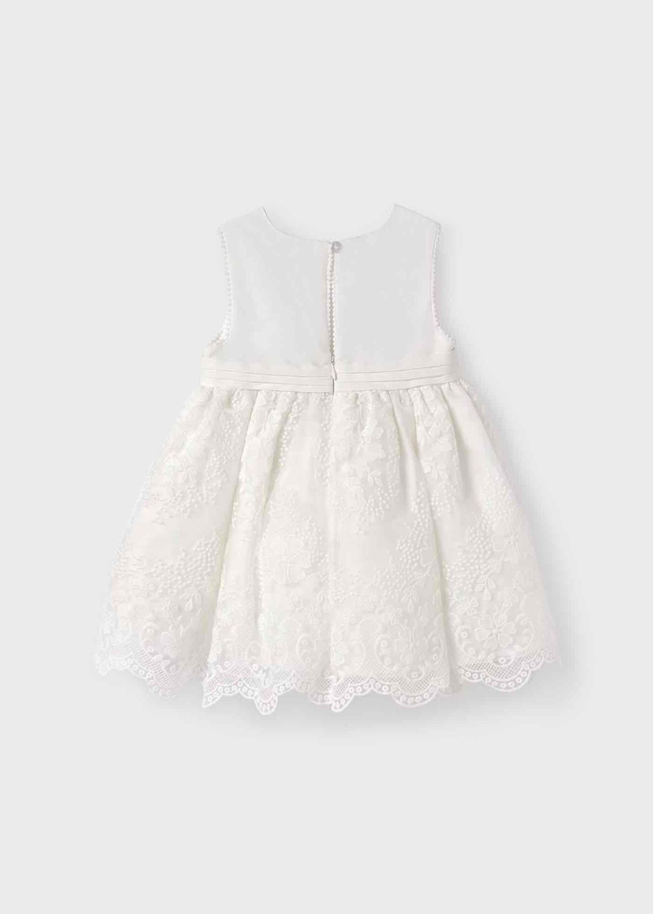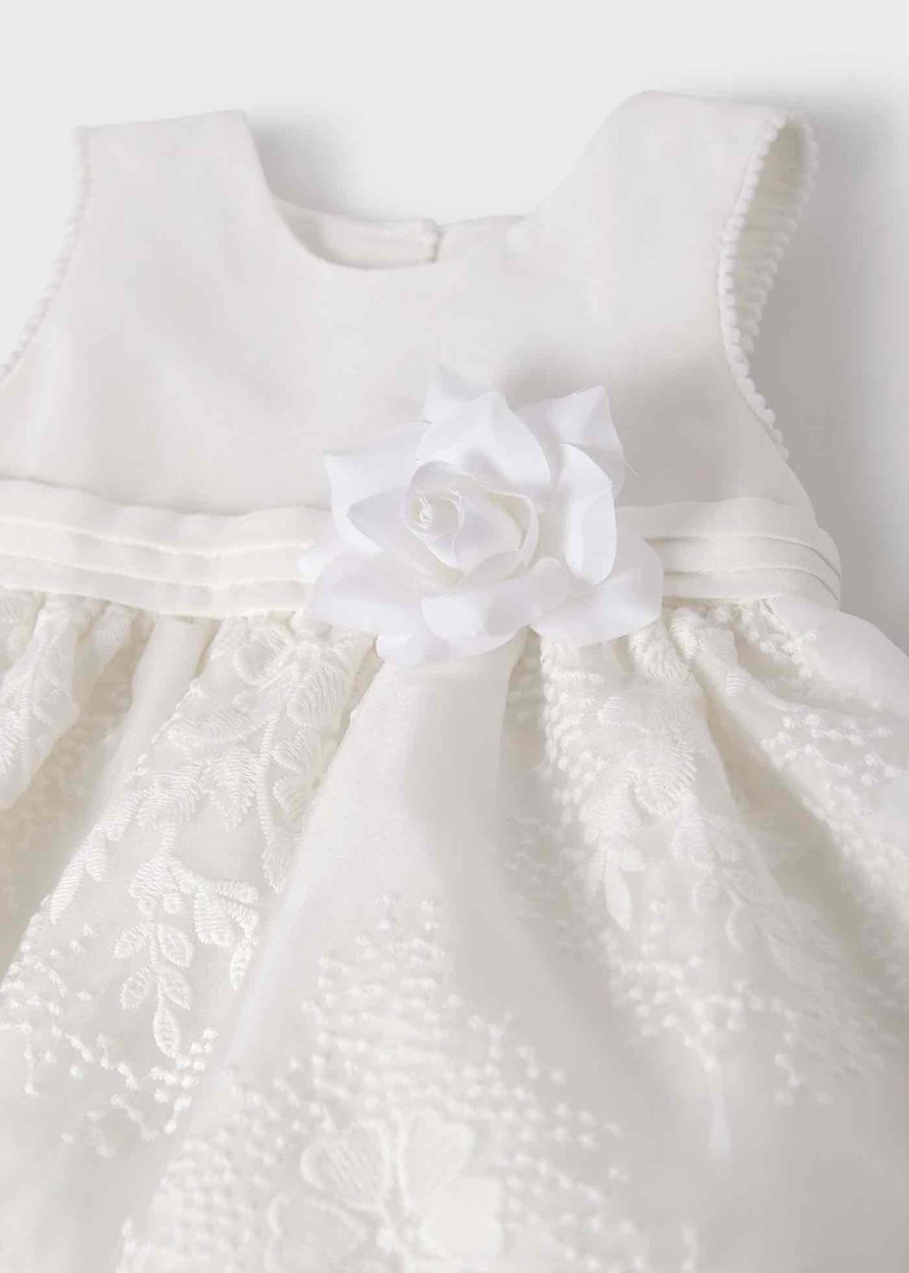 Abito organza con fiori ricamati per neonata. Fodero interno con cotone. Bordo inferiore ondulato. Fusciacca con applicazione di un fiore. Chiusura posteriore con unico bottone Look coordinato per bambina da 4 a Esterno 85% Poliestere 15% Cotone Fodera 85% Cotone 15% Poliestere