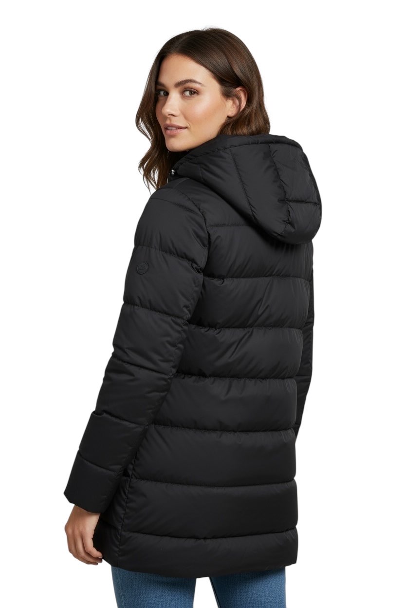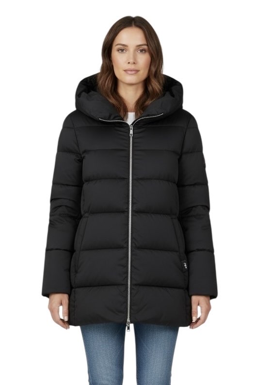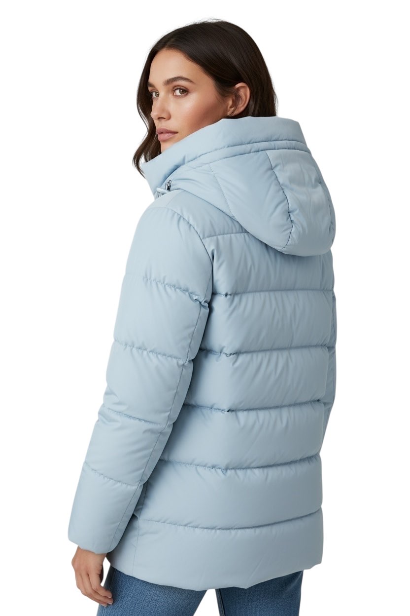 Il piumino nella tonalità NERO ,AZZURRO è l'incarnazione di una raffinata semplicità e di un'eleganza senza tempo. Il taglio classico, leggermente svasato, che termina sui fianchi, accentua sottilmente la silhouette femminile, mentre la superficie liscia e uniforme con cuciture orizzontali riflette una magistrale attenzione ai dettagli.