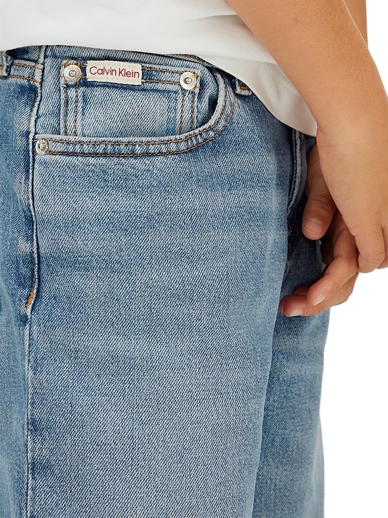 • denim elasticizzato in cotone • cintura regolabile in vita • patta con cerniera • stile cinque tasche • leggere baffature sui fianchi • effetto scolorito su ginocchia, cosce e cavallo • lavaggio cloudy blu • rivetti con logo Calvin Klein e targhetta