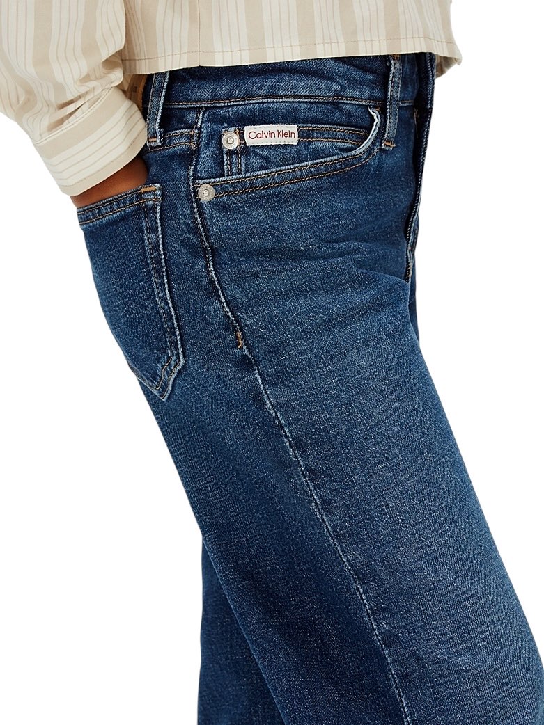 • denim elasticizzato in cotone • cintura regolabile in vita • patta con cerniera • stile cinque tasche • baffature sui fianchi • effetto scolorito sulle ginocchia • lavaggio blu scuro originale • rivetti con logo Calvin Klein e targhetta