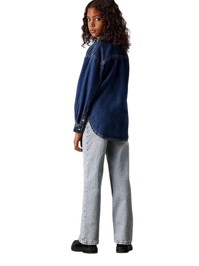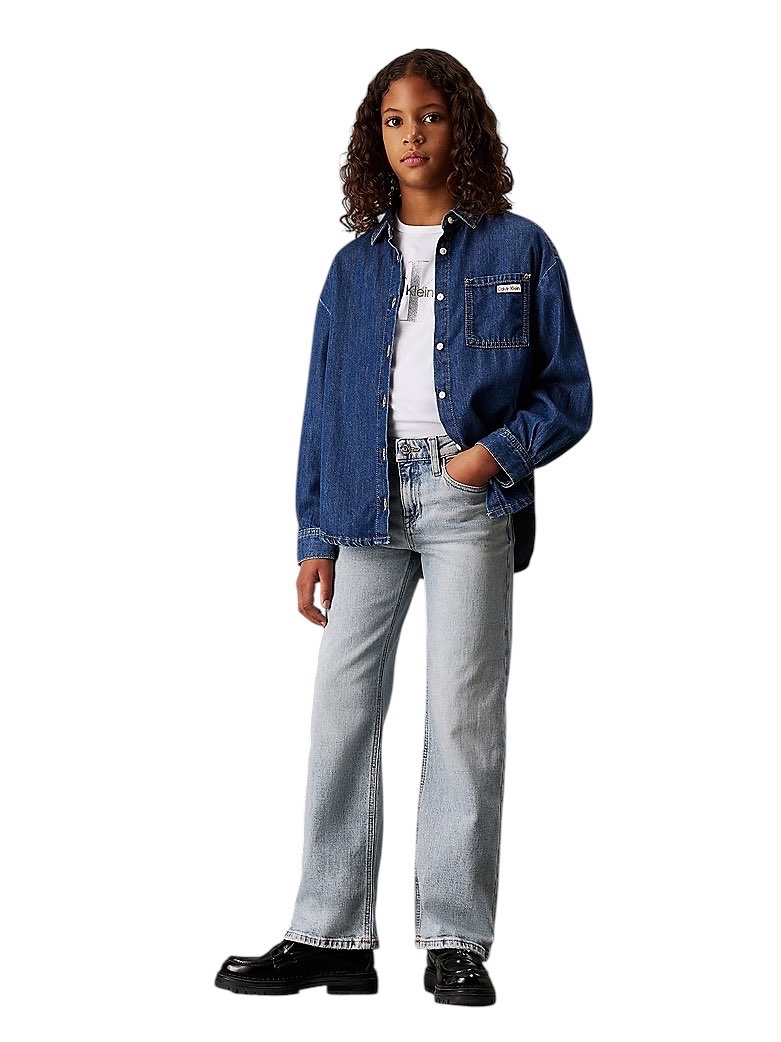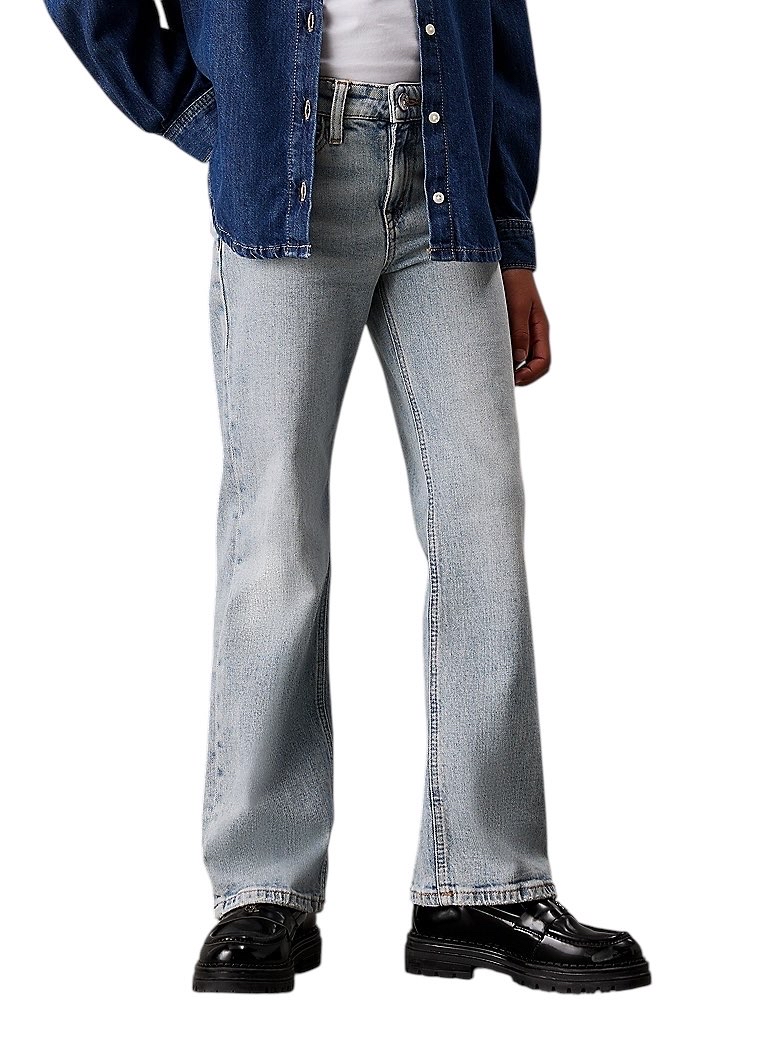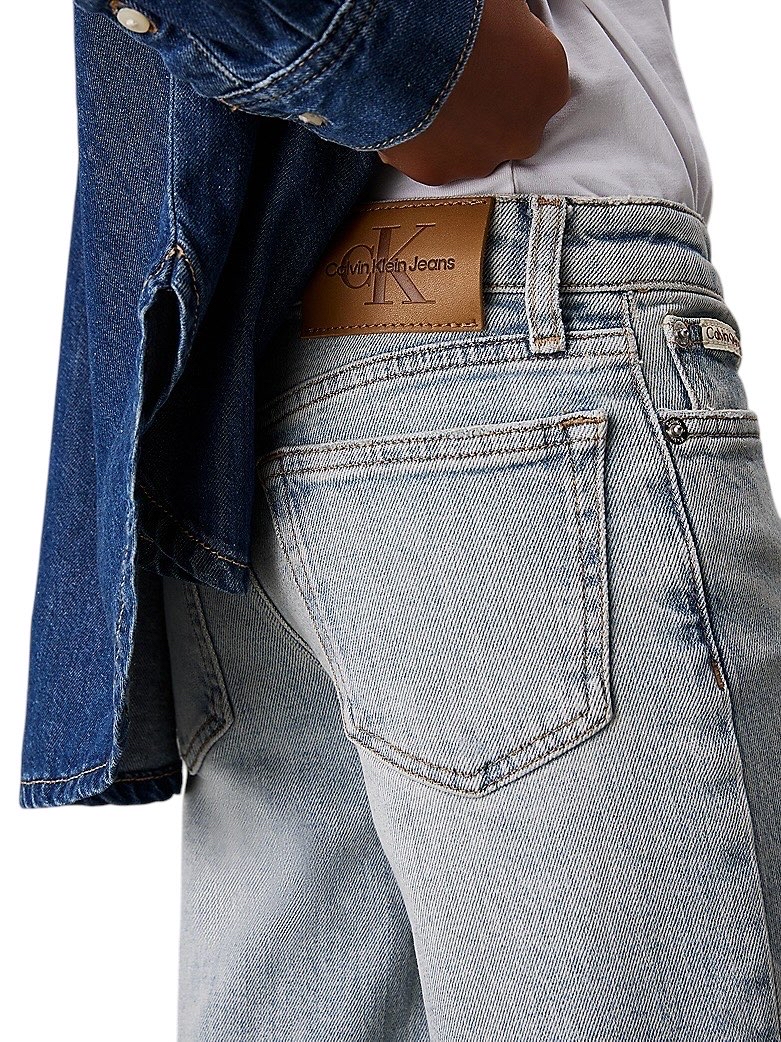 • denim di cotone elasticizzato • vestibilità ampia con gamba larga • a vita alta • cintura regolabile in vita • patta con cerniera • stile cinque tasche • lavaggio azzurro • rivetti con logo Calvin Klein ed etichetta logata
