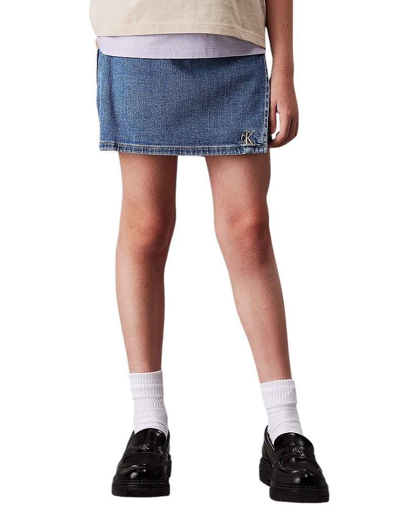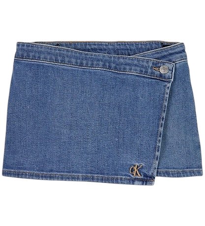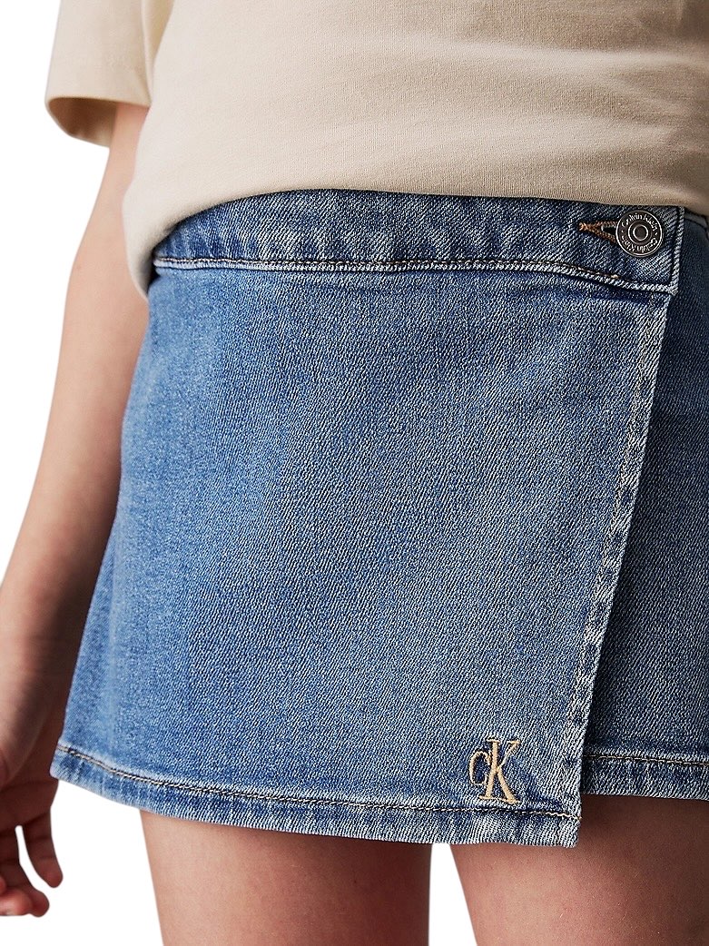 • denim di cotone elasticizzato • taglio regolare • vita media • design avvolgente sul davanti • chiusura a un bottone • tasche applicate sul retro • lavaggio blu morbido • logo monogramma Calvin Klein ricamato sul risvolto anteriore • rivetti con logo Calvin Klein e targhetta