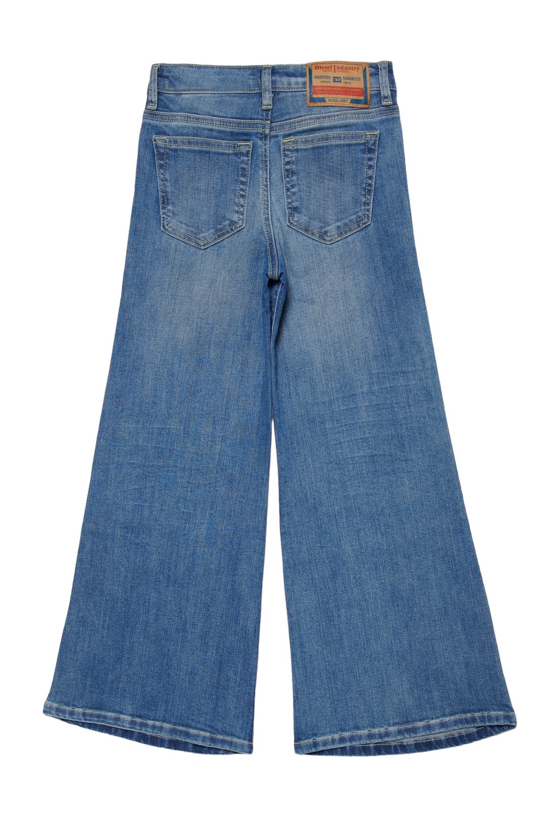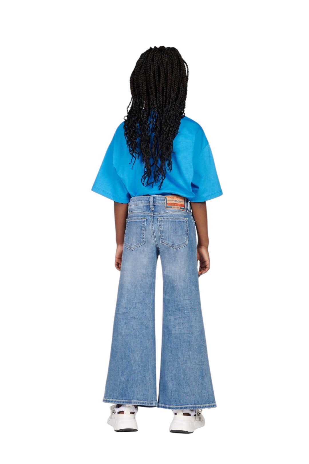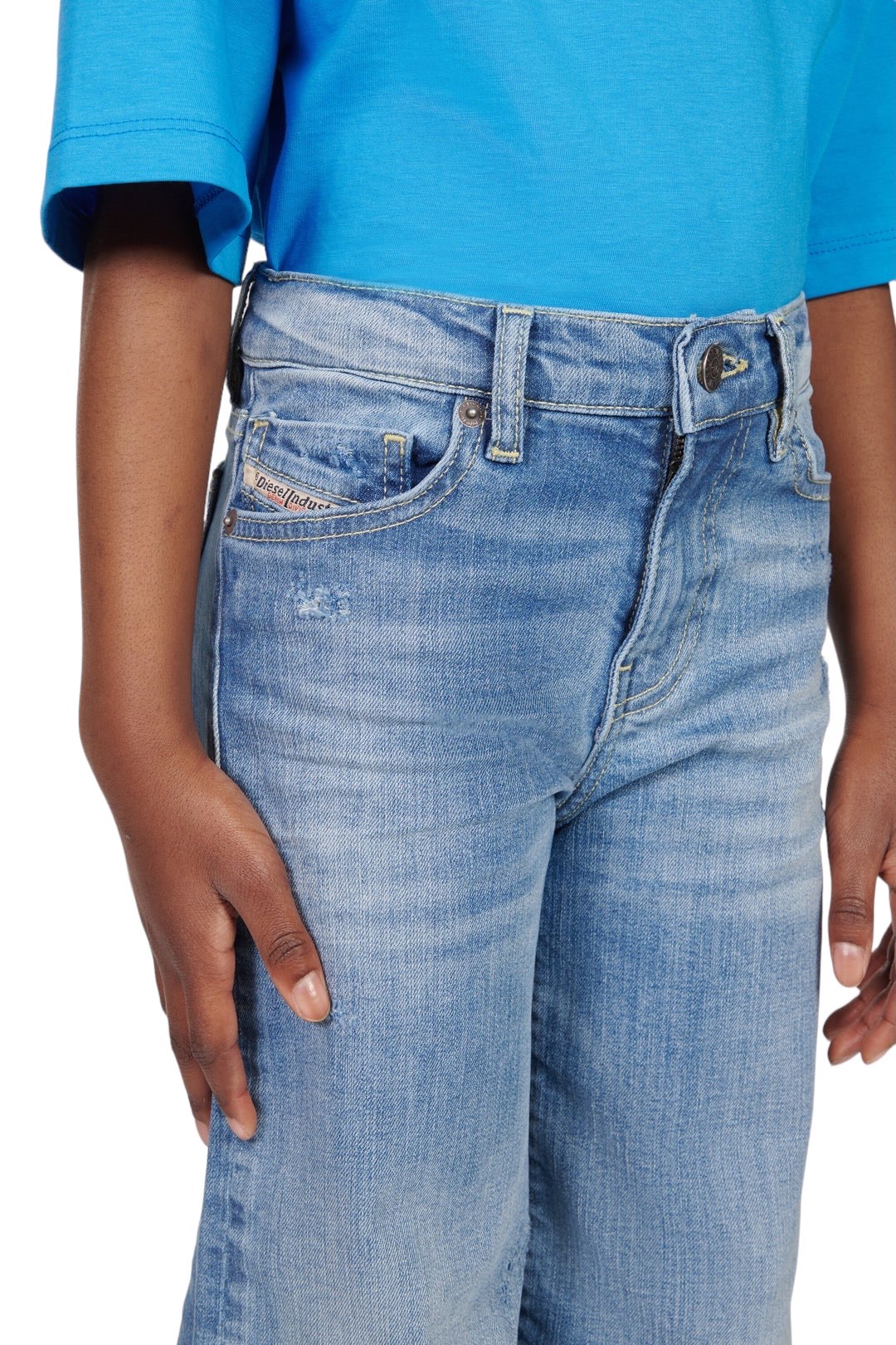 Jeans a cinque tasche dal fit flare e attitude disco. A vita media. Realizzato in denim blu chiaro, contraddistinto da sfumature e cuciture a contrasto cromatico, baffature e piccole abrasioni rammendate. Il design è caratterizzato dalla vita regolabile e chiusura con elastico.