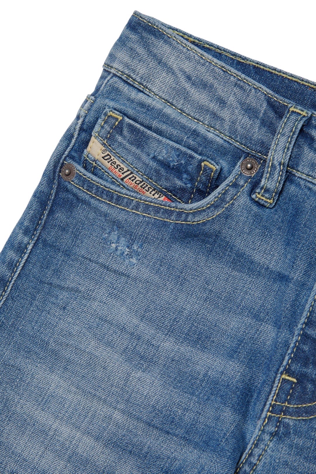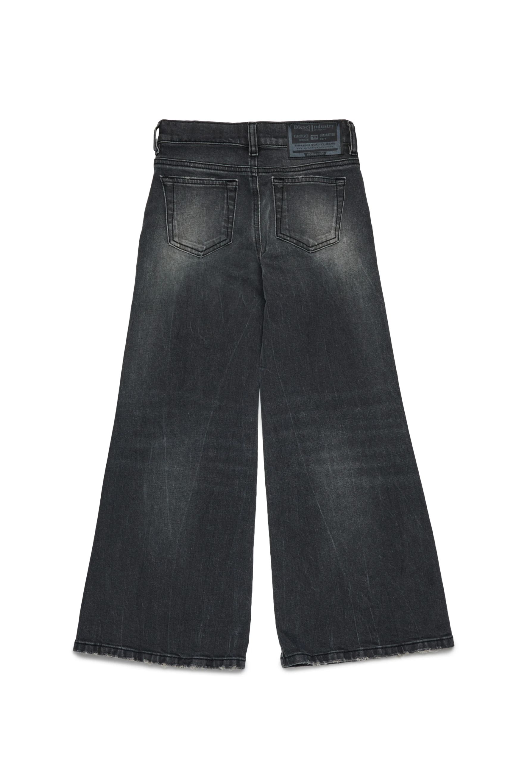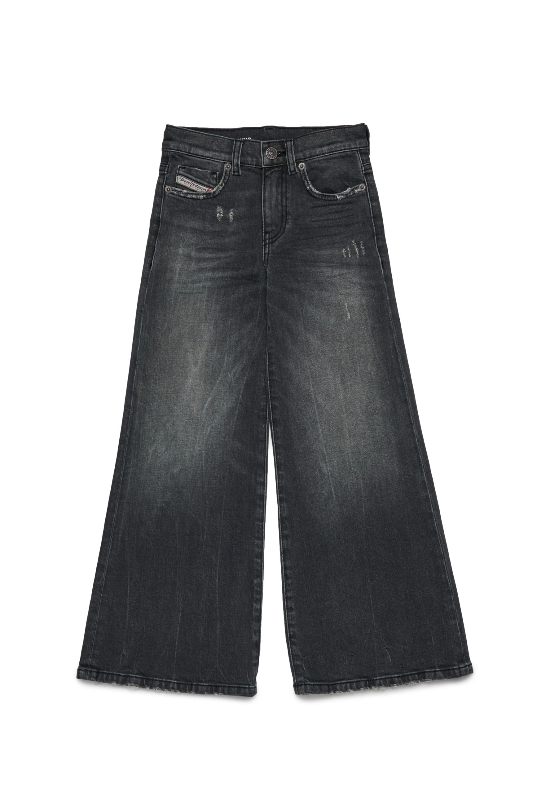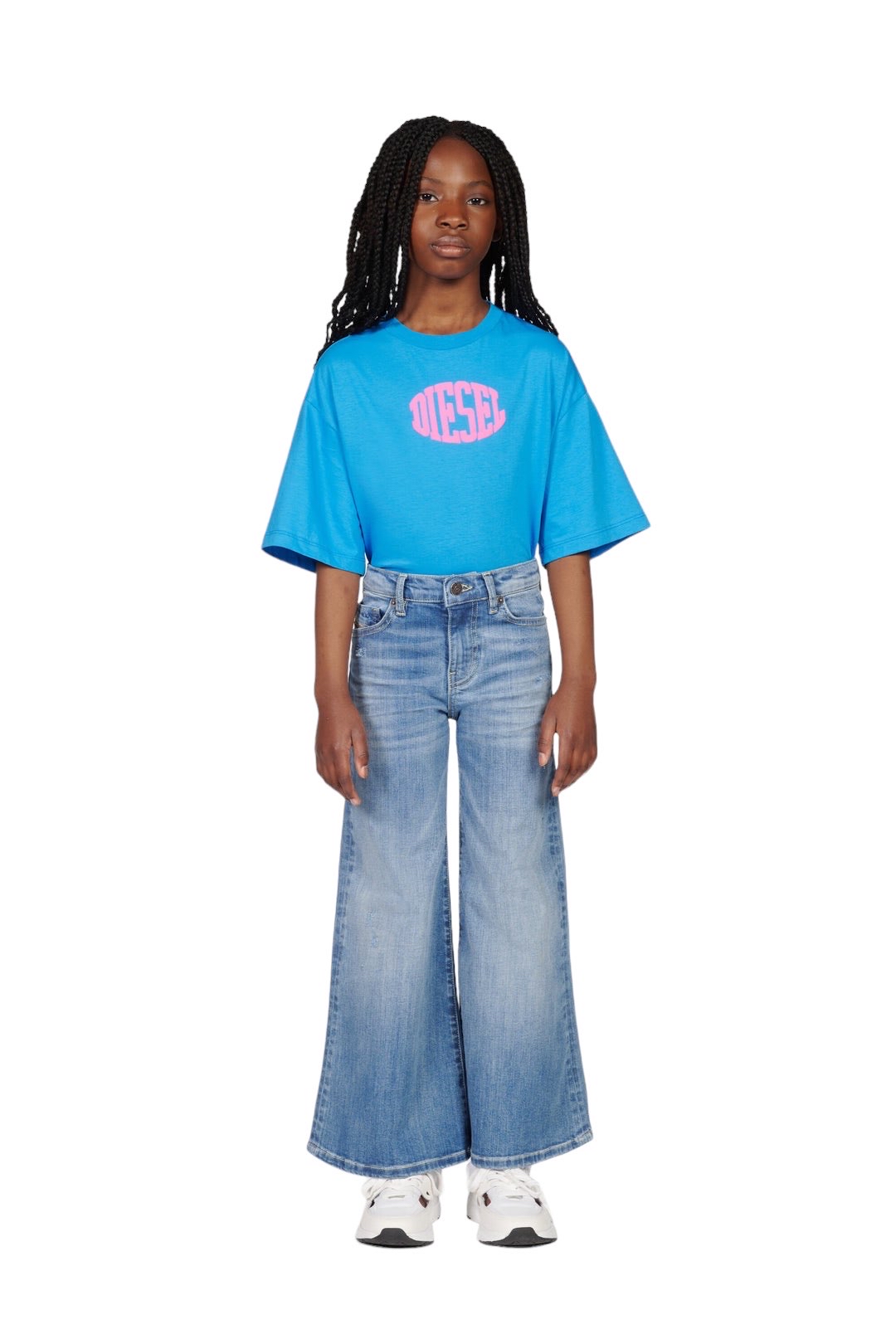Jeans a cinque tasche dal fit flare e attitude disco. A vita media. Realizzato in denim blu chiaro, contraddistinto da sfumature e cuciture a contrasto cromatico, baffature e piccole abrasioni rammendate. Il design è caratterizzato dalla vita regolabile e chiusura con elastico.