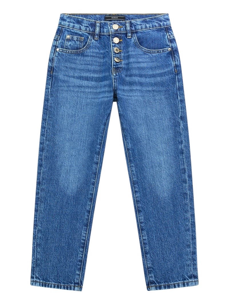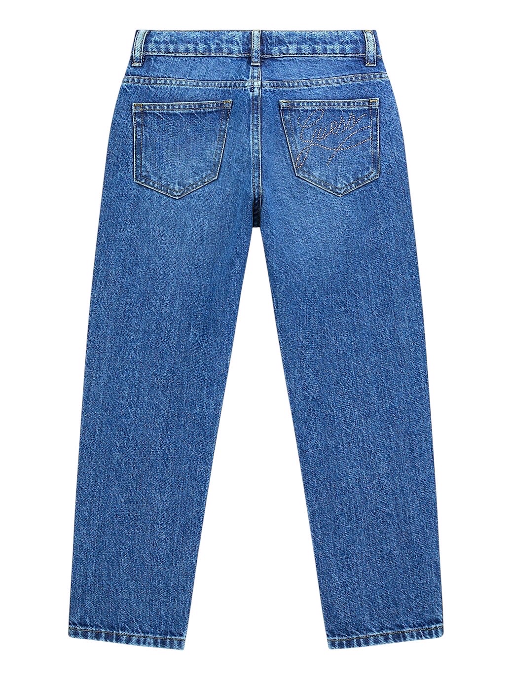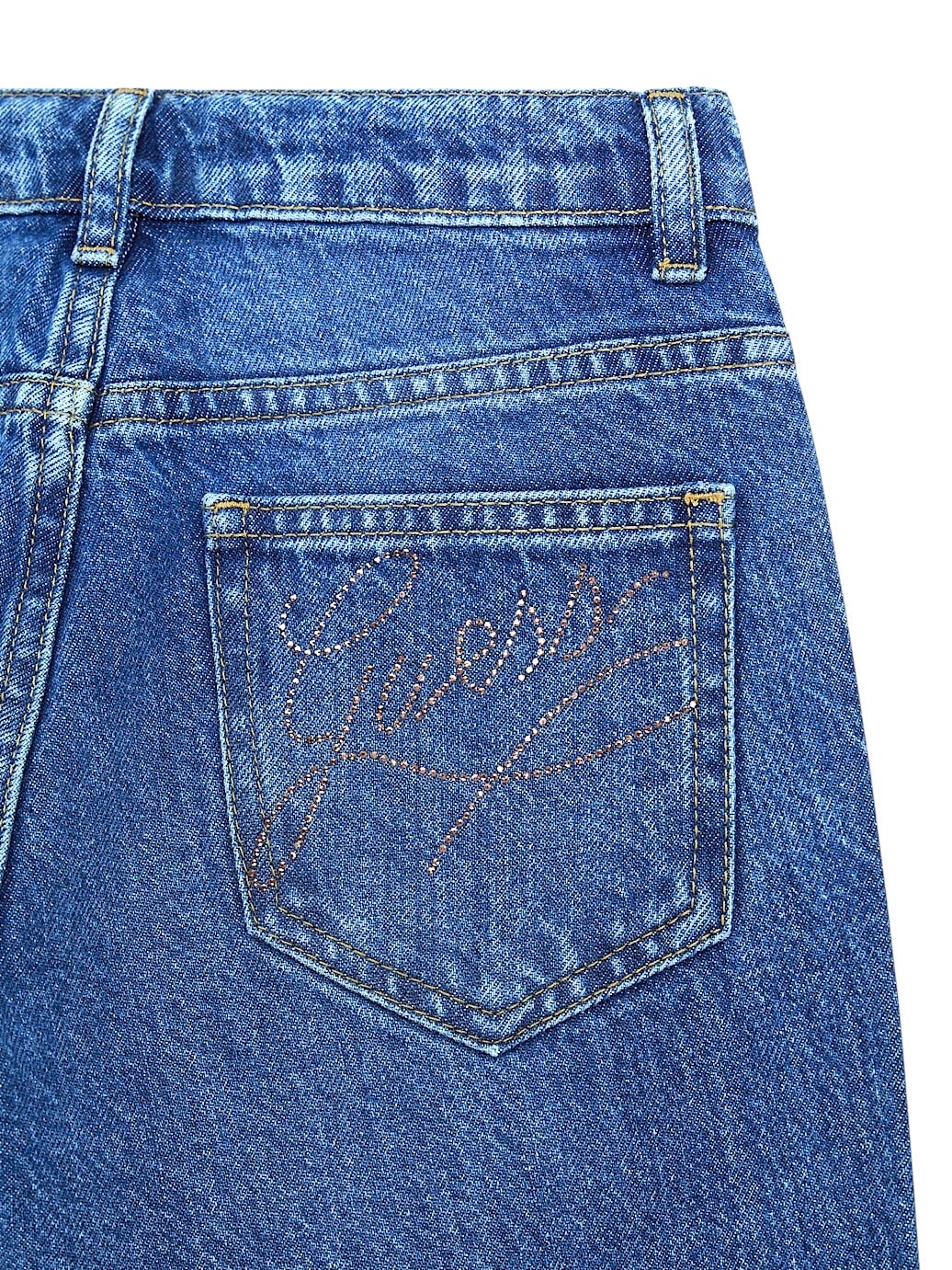 Jeans rigidi con vestibilità regular. Modello a cinque tasche. Gamba dritta e vita media. Logo con strass sulla tasca posteriore. Chiusura con bottoni.