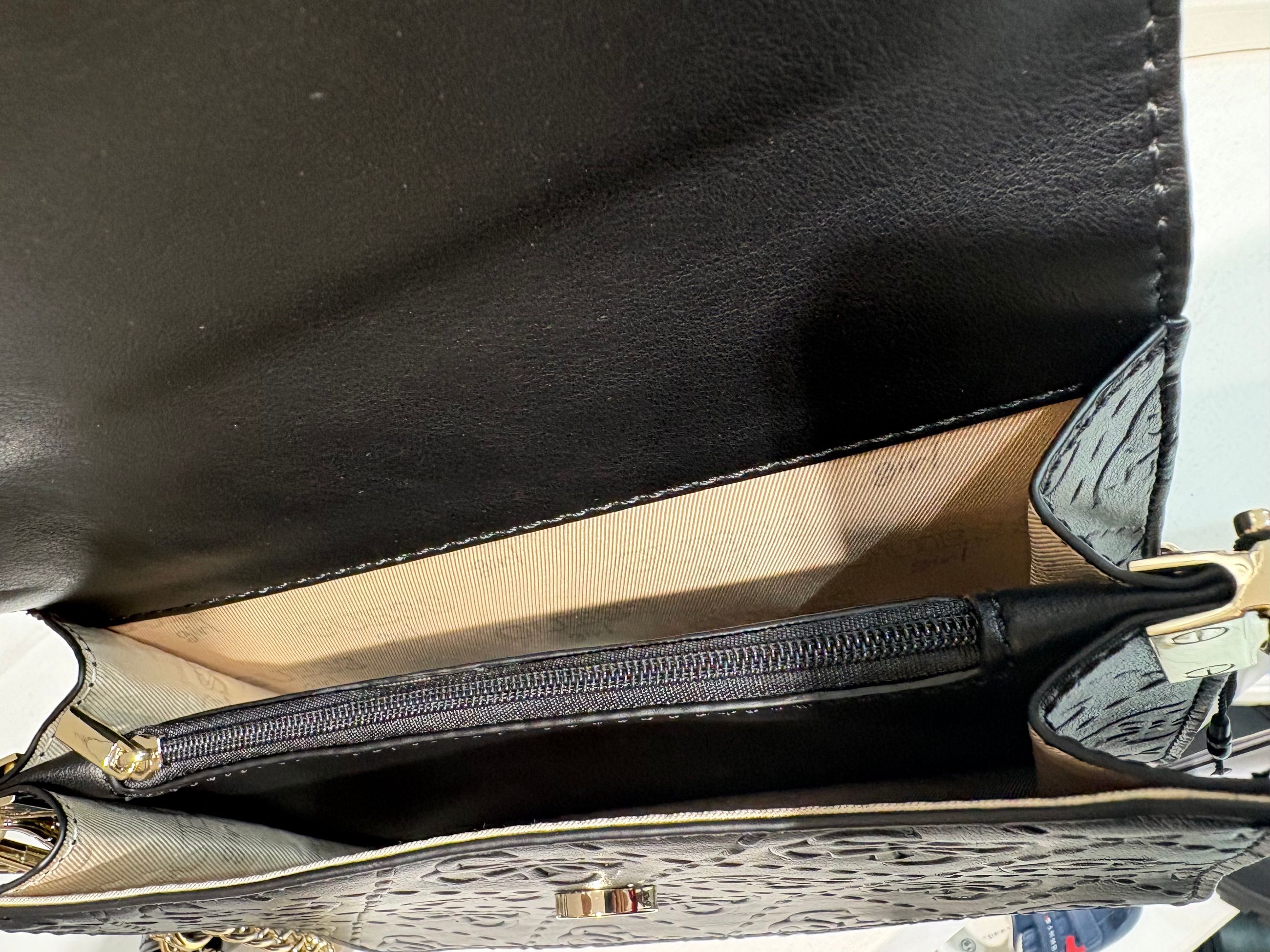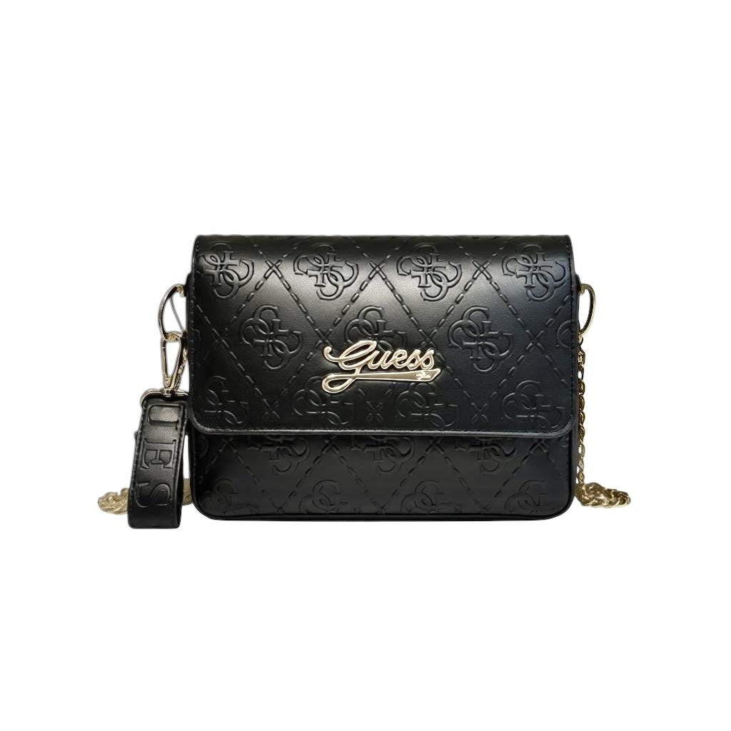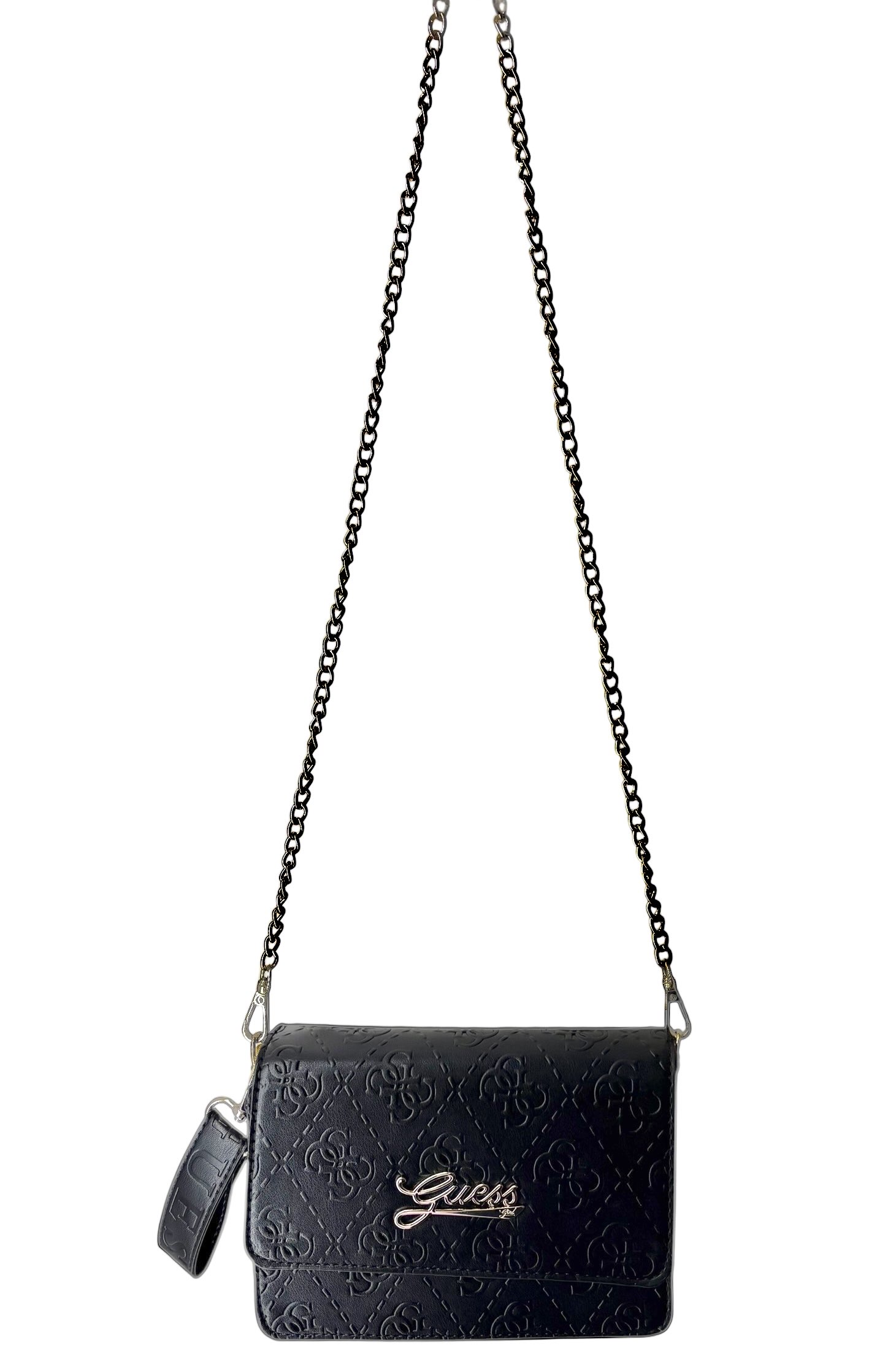 Elegante borsa a tracolla da bambina di Guess, realizzata in similpelle bianco perla e dotata di tracolla a catena dorata, presenta inoltre un logo dorato sul davanti ed è corredata da una borsetta coordinata bianco perla.