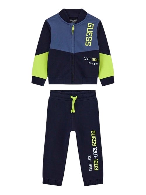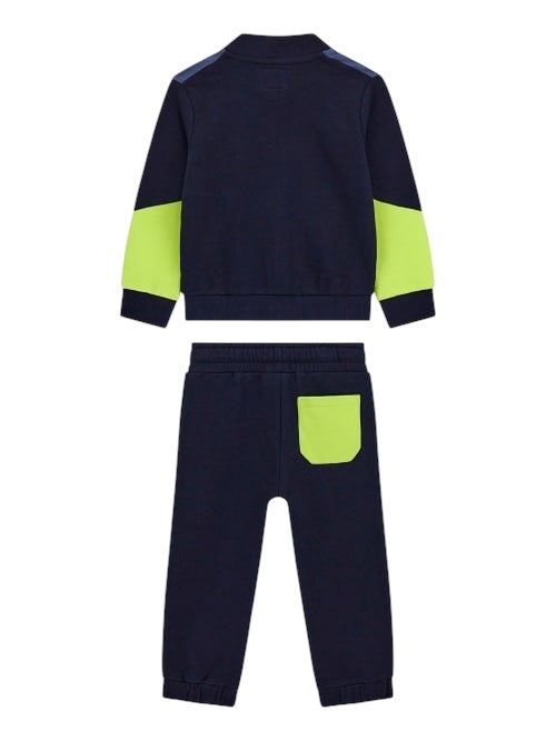 Set in cotone color block. Felpa: colletto a bomber, maniche lunghe con polsino e chiusura con cerniera lampo. Pantaloni: gamba con elastico al fondo e fascia elastica in vita. Stampa logo.