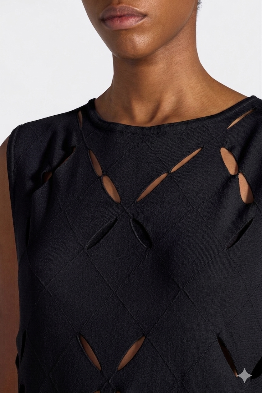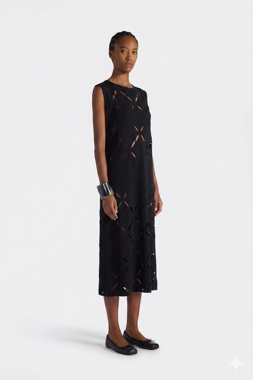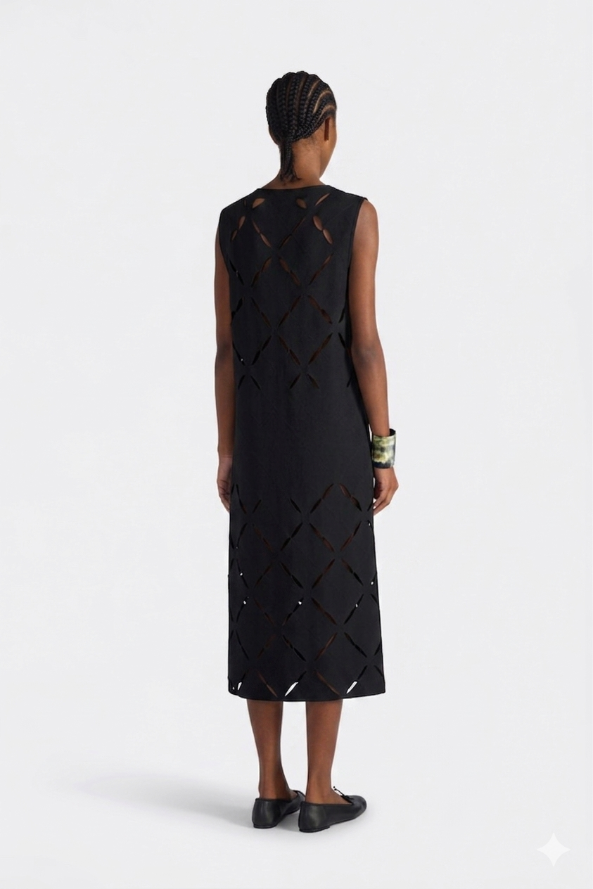 ABITO MIDI ROMBI INTAGLIATI IN VISCOSA STRETCH, SMANICATO, SCOLLO TONDO. LINEA DRITTA.