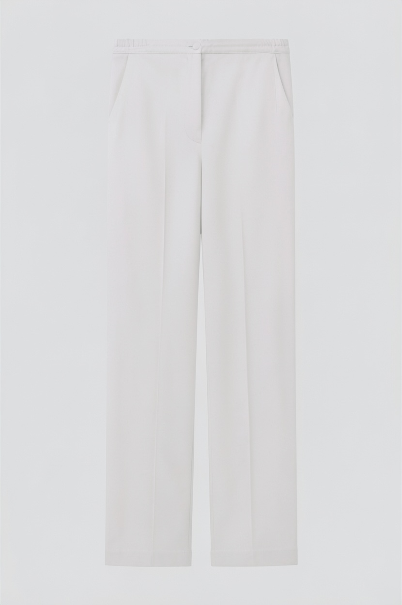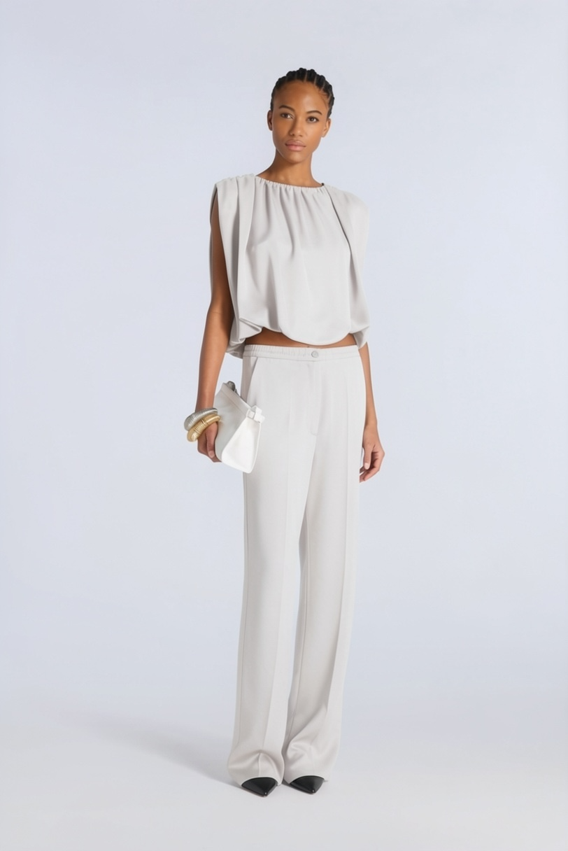 PANTALONI A PALAZZO IN LIQUID SATIN CON ELASTICO IN VITA. CHIUSURA CENTRALE CON BOTTONE E ZIP NASCOSTA. TASCHE LATERALI NASCOSTE, PIEGA STIRATA DAVANTI E DIETRO.