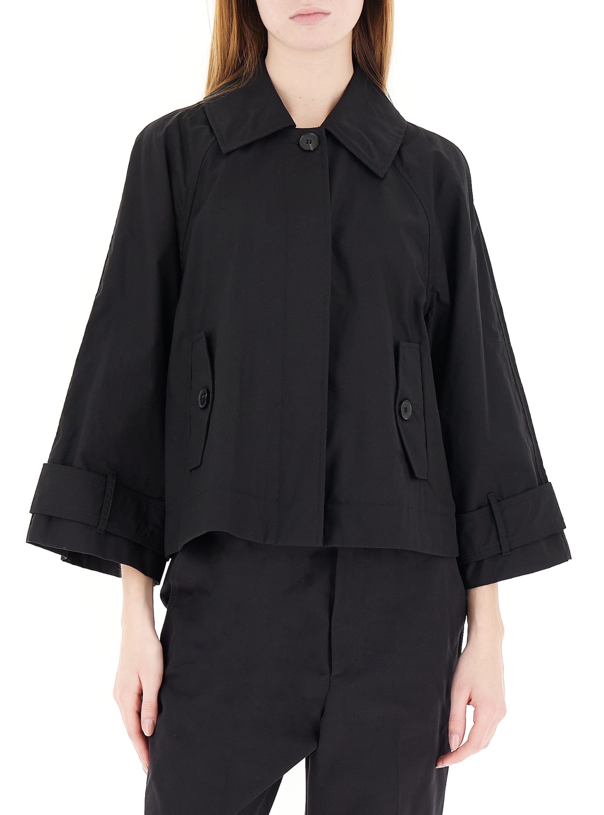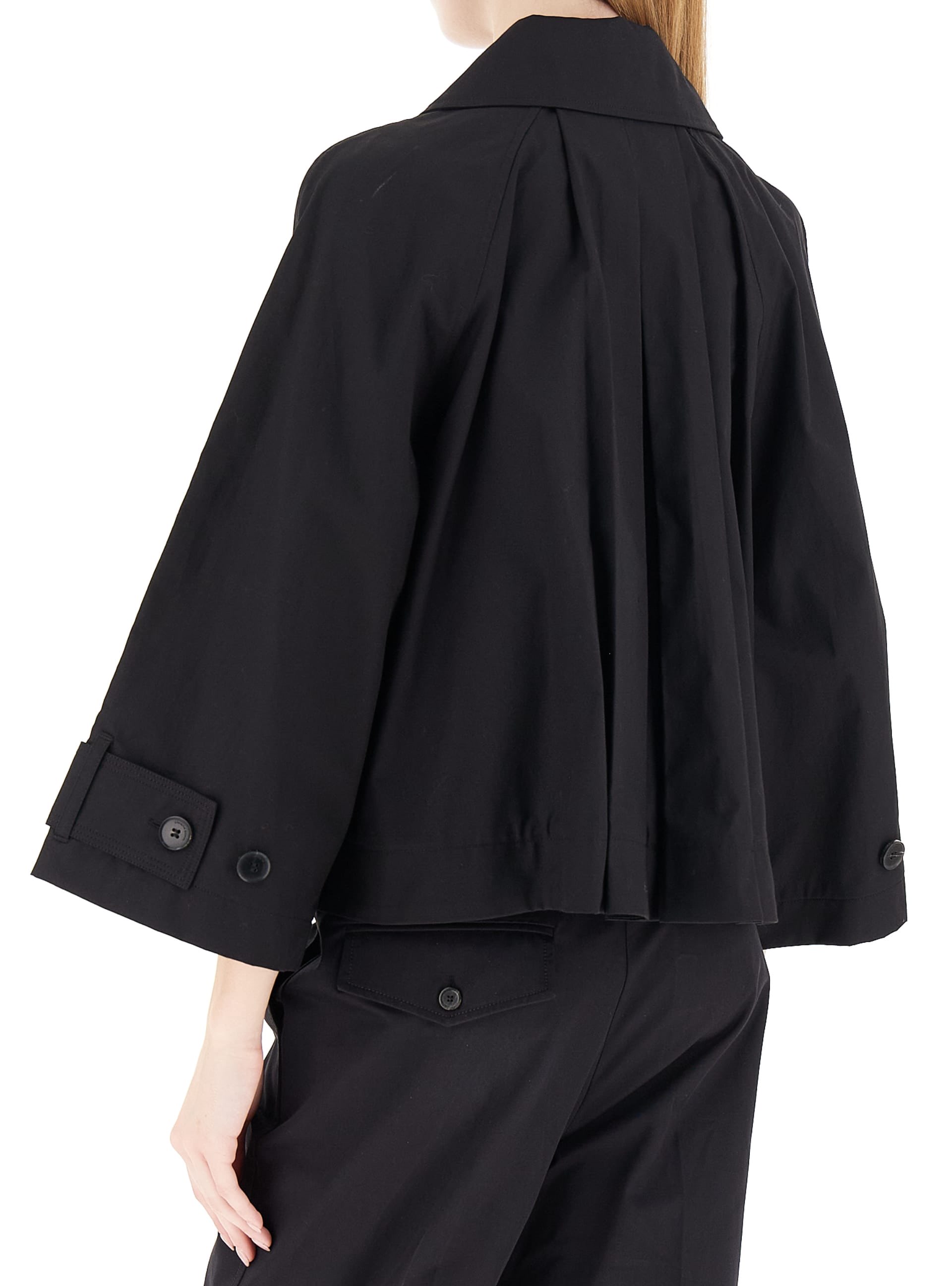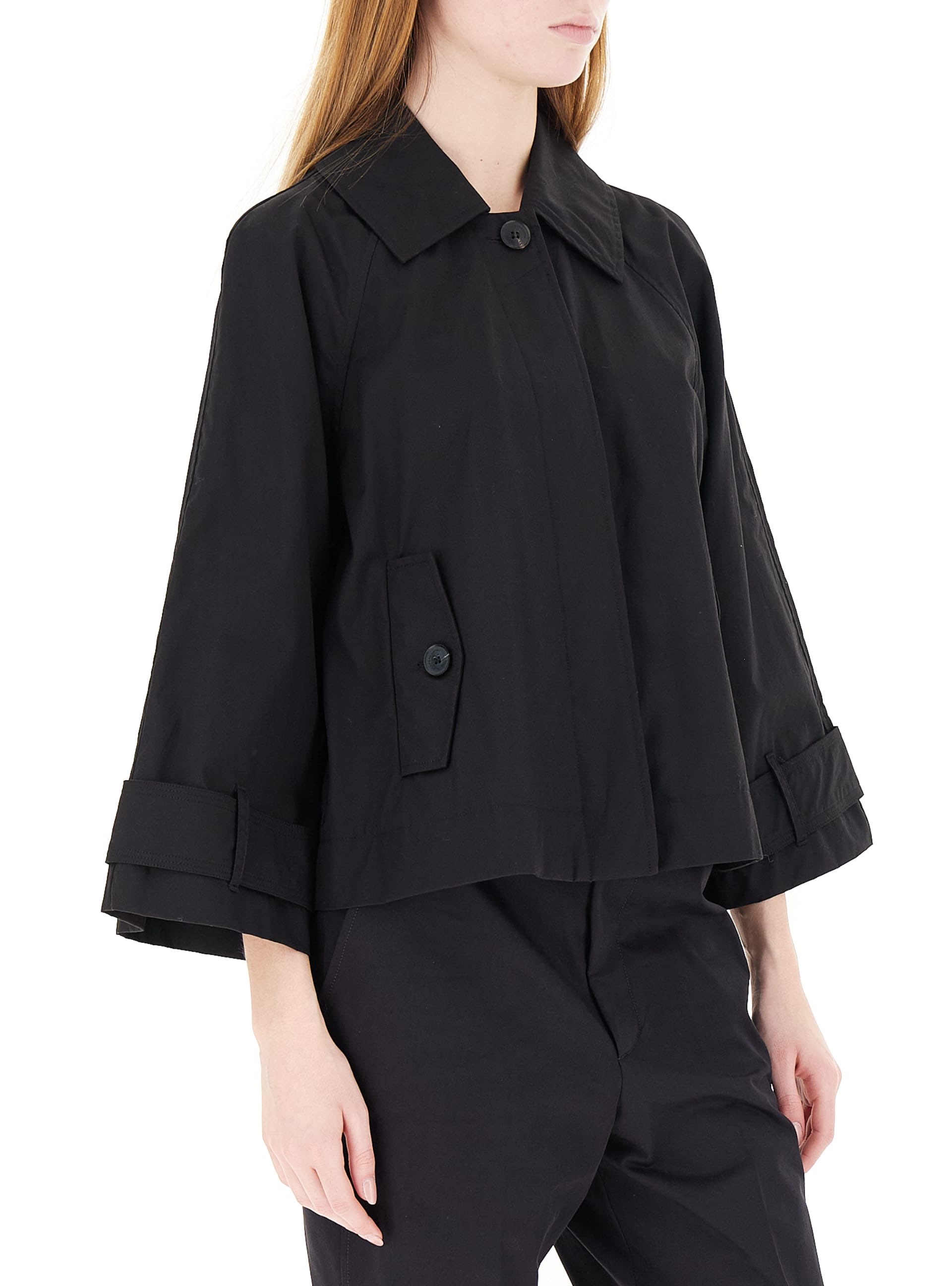 GIACCA IN 100% COTONE IMPERMEABILE MODELLO TRENCH CORTO CON COLLETTO E CHIUSURA CENTRALE NASCOSTA CON BOTTONE SCURO A VISTA. MANICHE AI POLSI CON PASSANTI E CINTURINI, TASCHE LATERALI CON PATTINE E BOTTONI. PIEGHE SUL DIETRO PER CREARE UNA LINEA AD A.