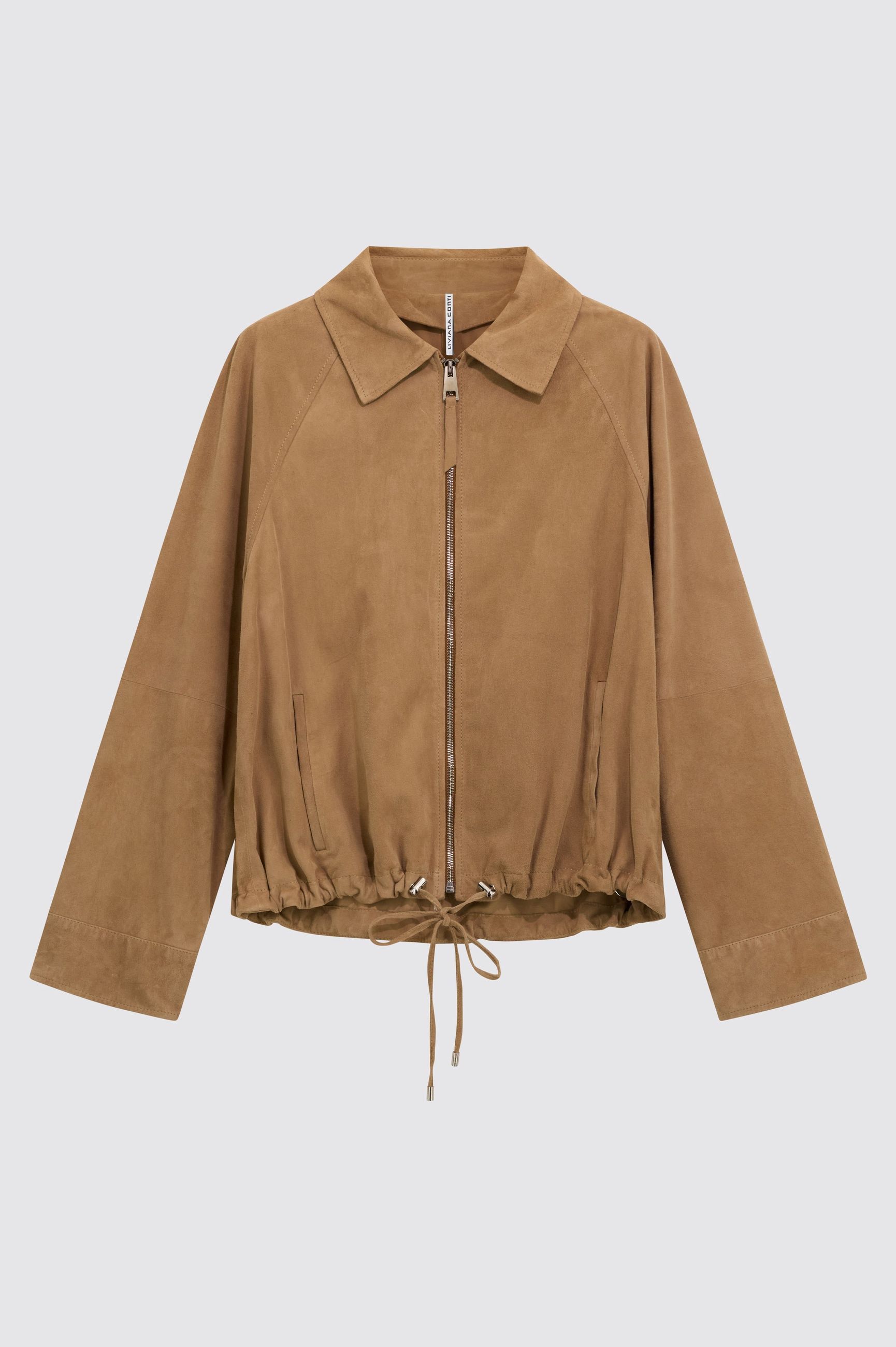 GIACCA IN CAMOSCIO CON COLLETTO A CAMICIA, CHIUSURA CENTRALE CON ZIP METALLIZZATA ARGENTO E CURSORE CON INSERTO. MANICHE LUNGHE LEGGERMENTE SVASATE CON POLSINI AL FONDO. COULISSE AL FONDO CON CORDINI IN TONO E FERMACORDA METALLIZZATI ARGENTO.