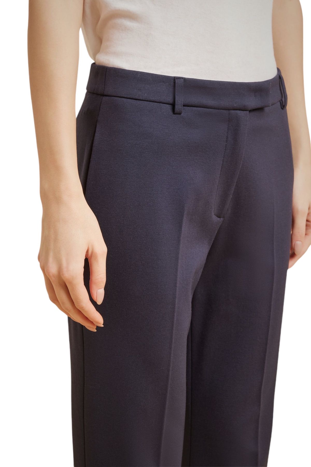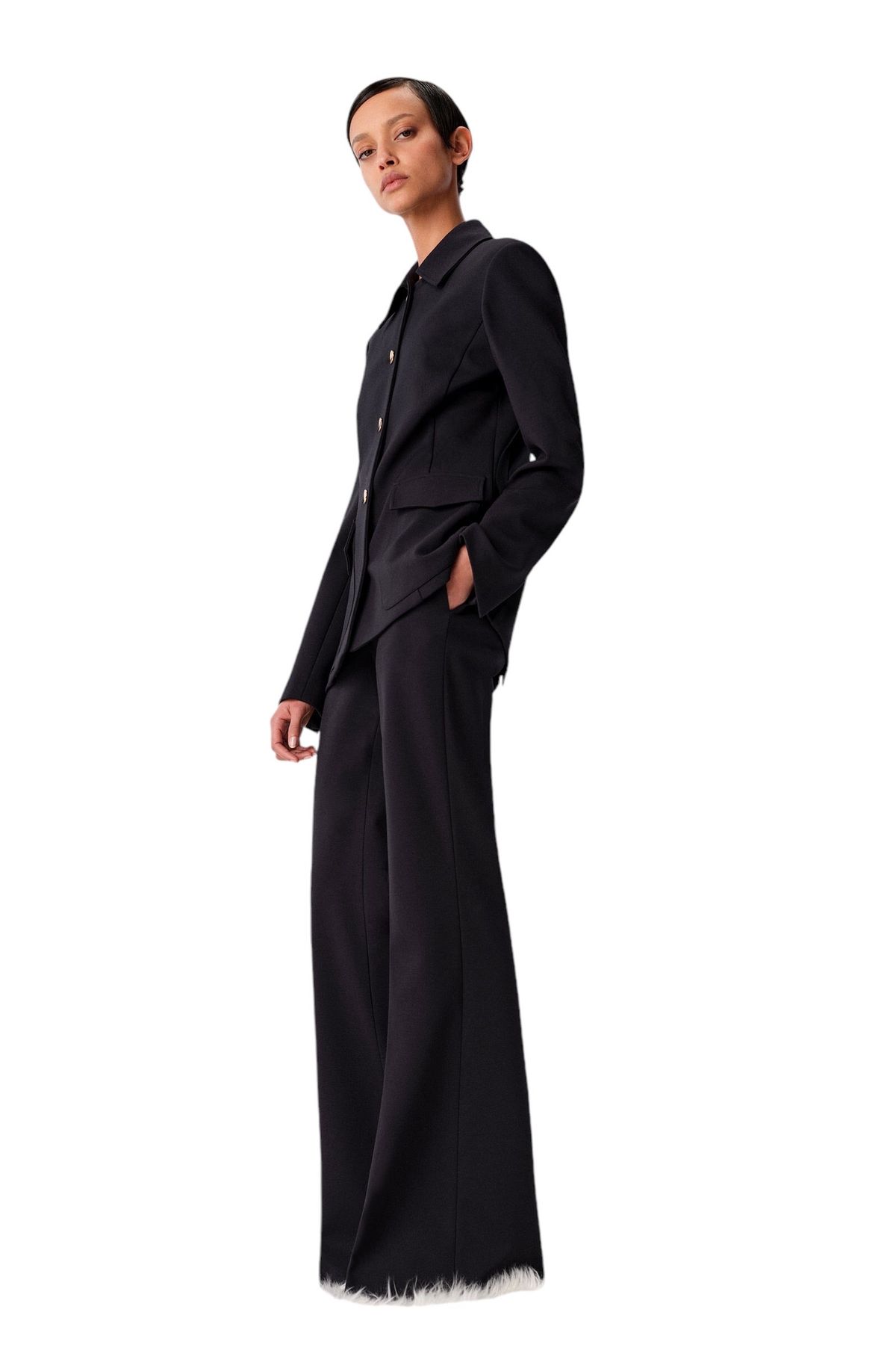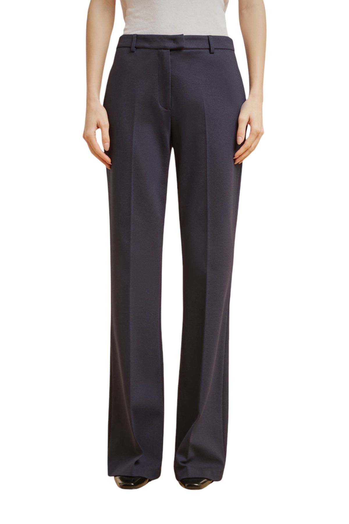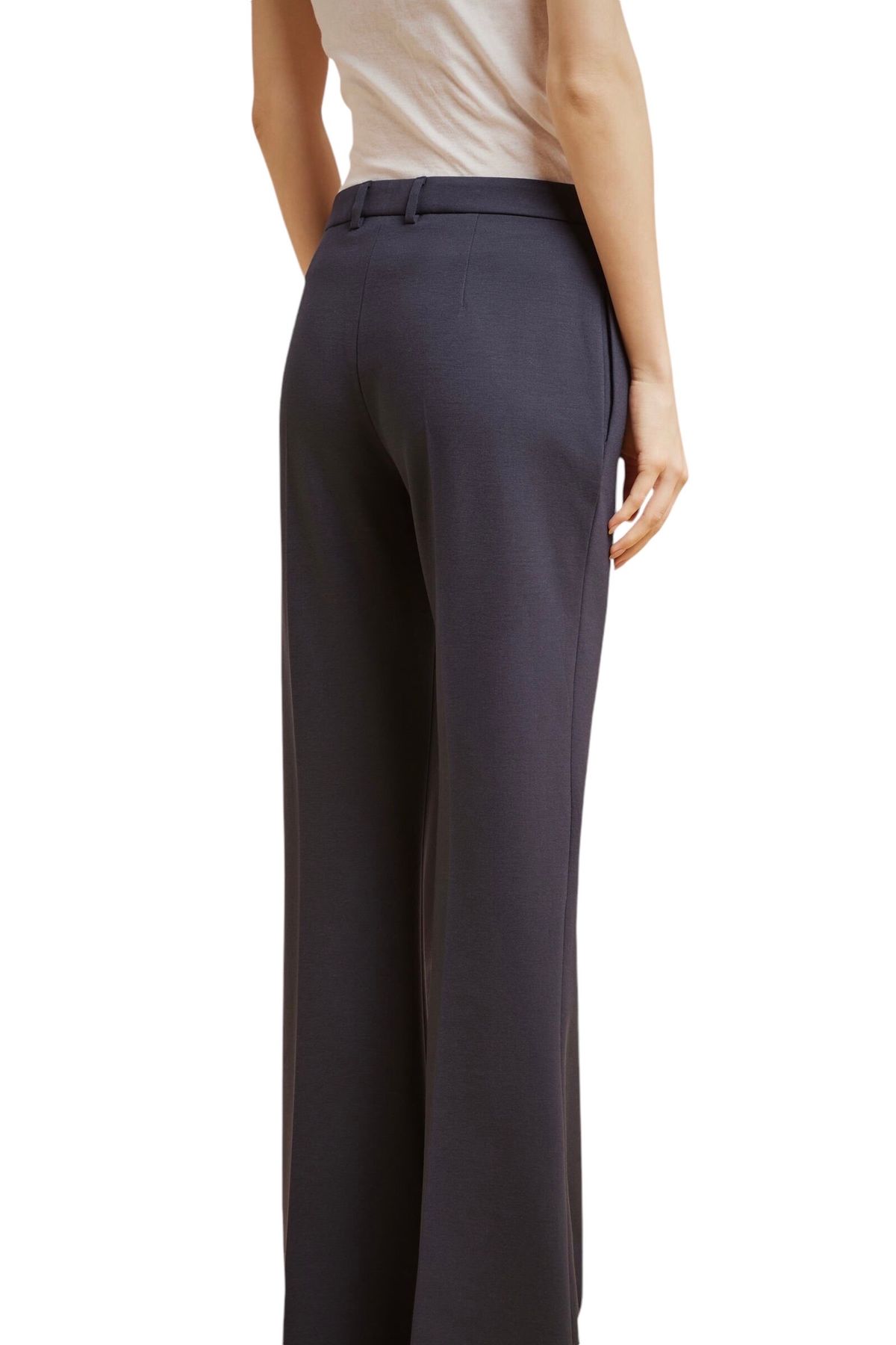Pantalone a campana, in punto Milano, chiusura nascosta frontale con zip, gancio e controbottone, cinturino in vita con passanti, tasche inserite lungo fianchi.