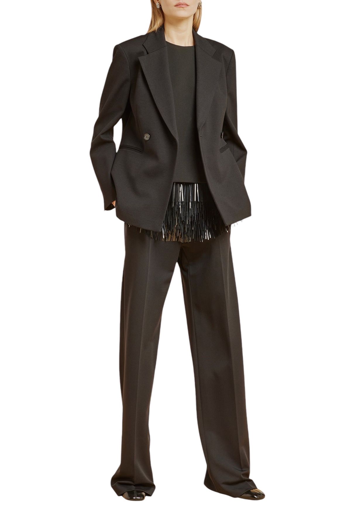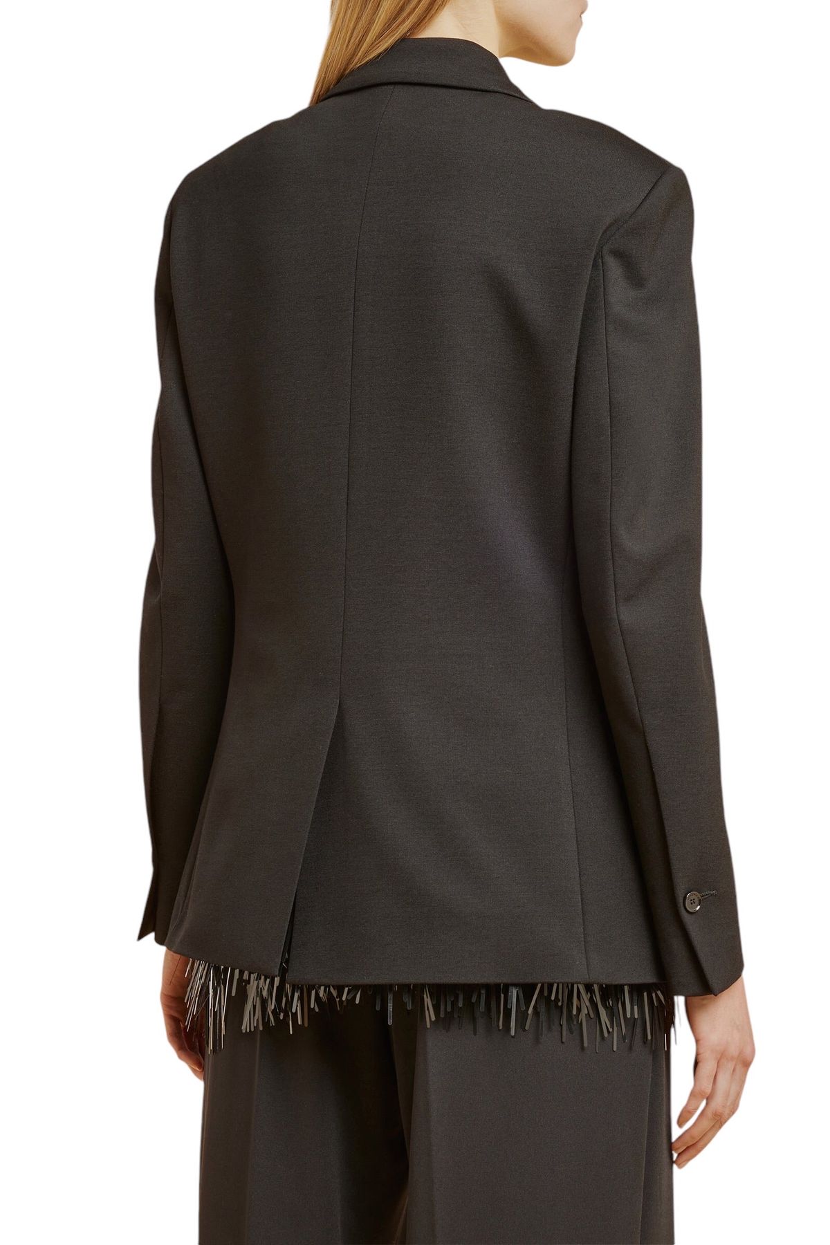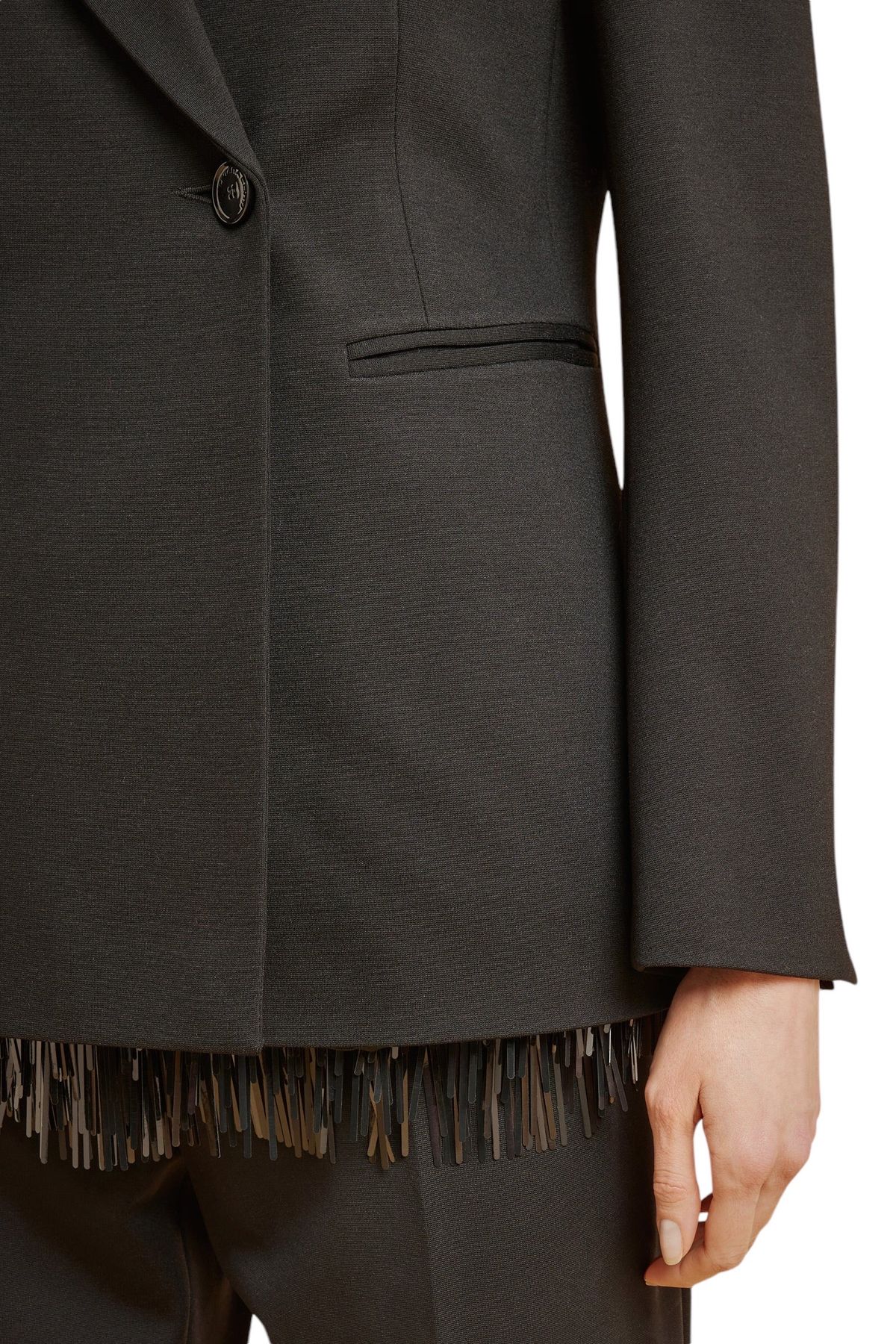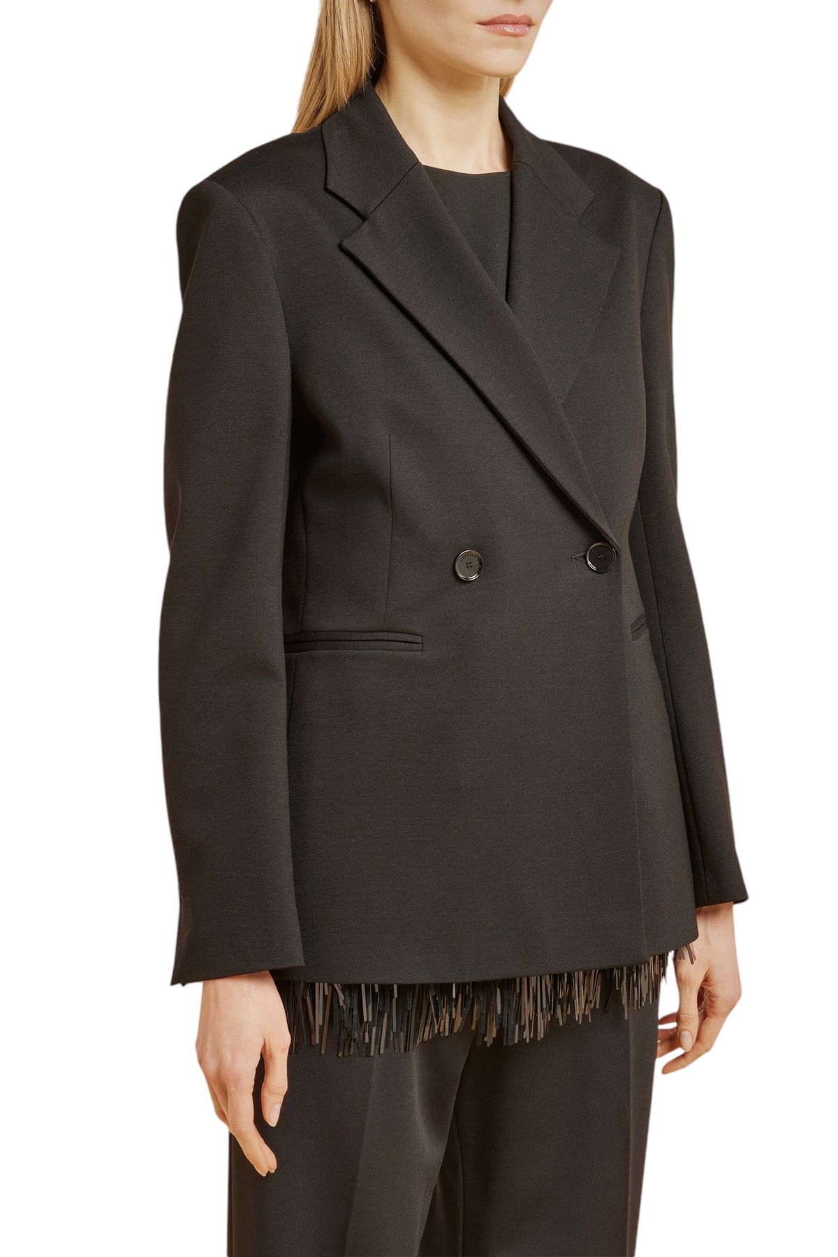 Blazer doppiopetto in punto Milano,foderata, scollo con rever, pinces in vita, tasche doppio filetto, spacco sormontato al centro dietro, manica lunga con spacco al fondo chiuso con asola e bottone.