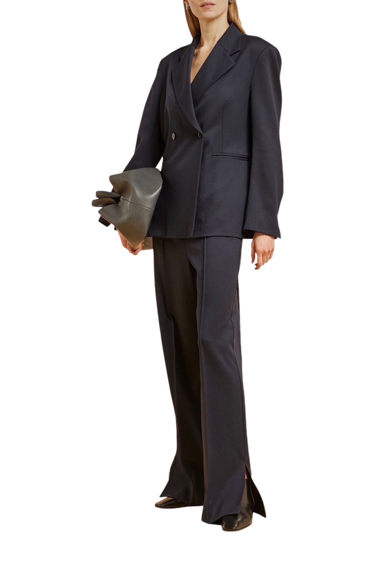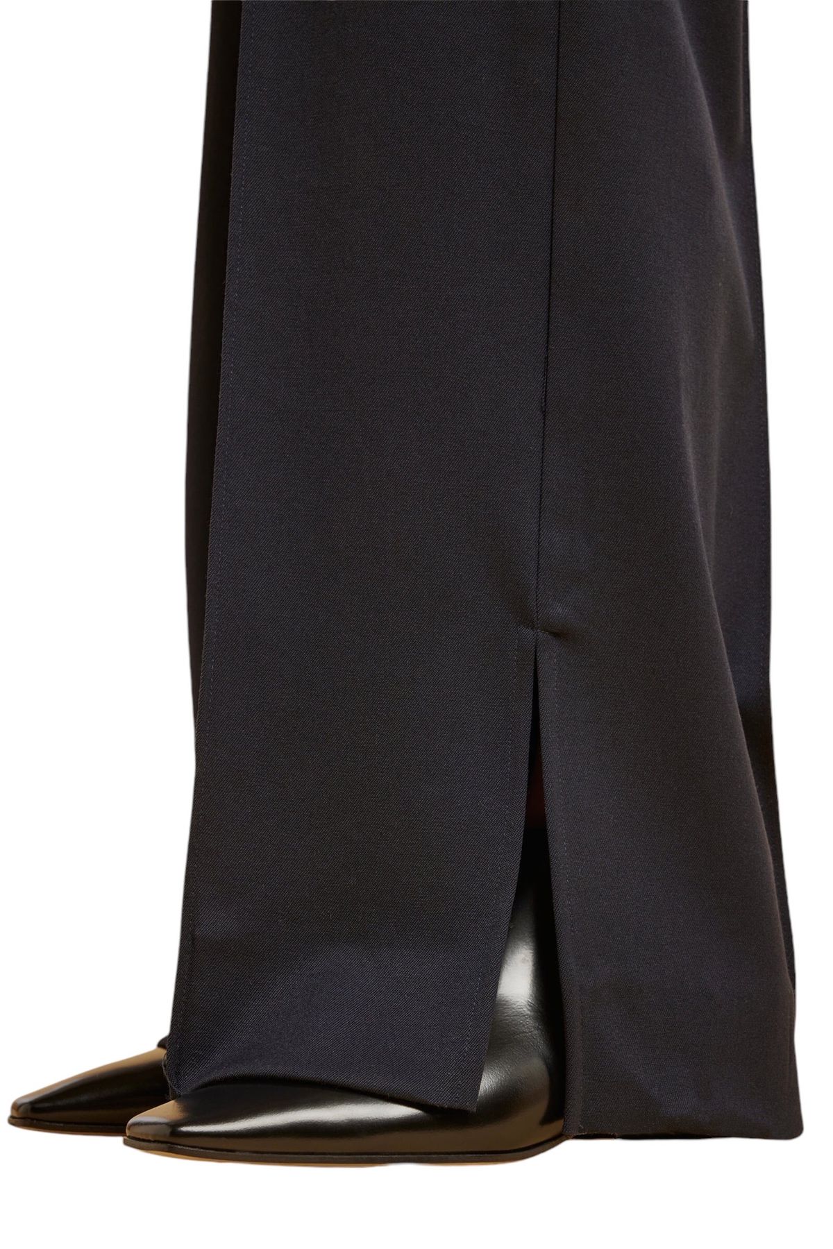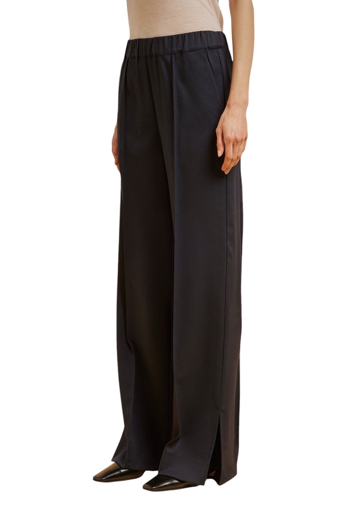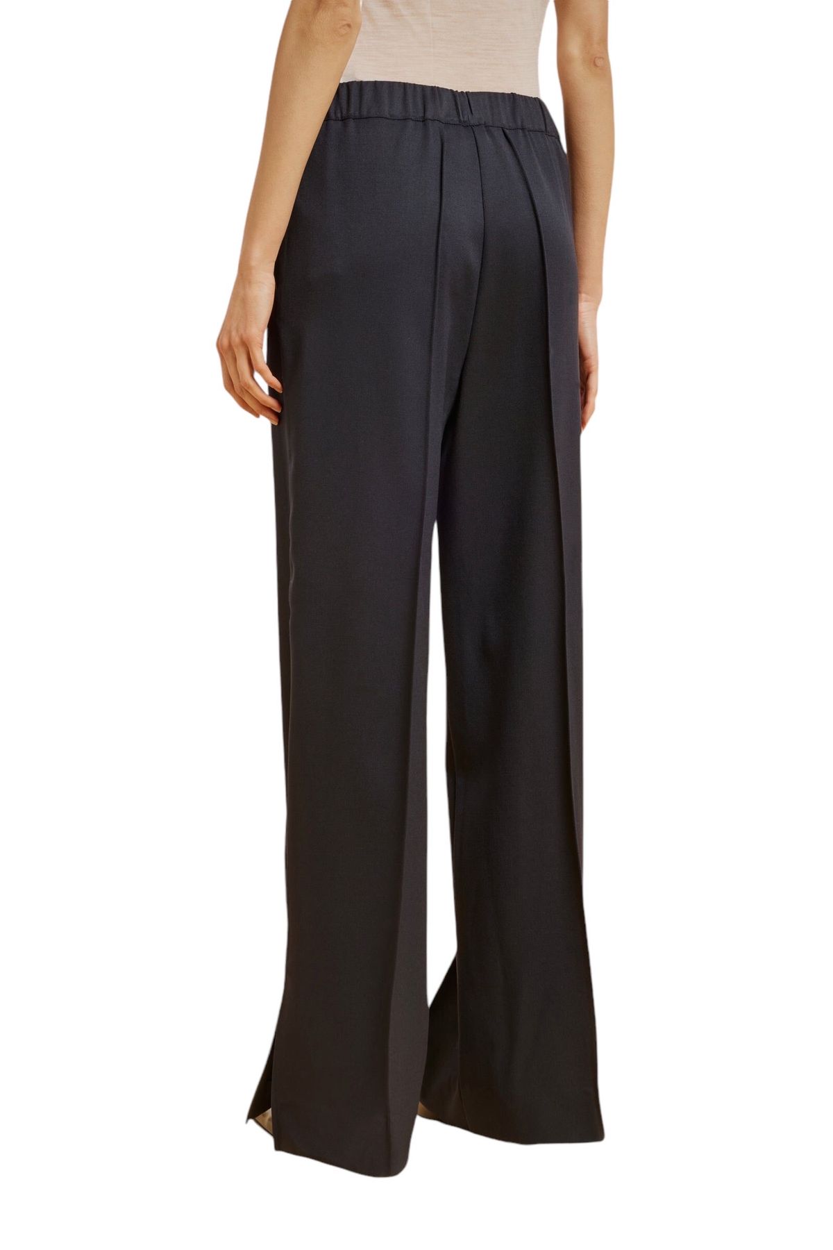 Pantalone in gabardina lana, gamba ampia e dritta, nervatura davanti e dietro, fascione in vita elasticizzato, spacco al fondo laterale, tasche alla francese. 98% LANA VERGINE 2% ELASTAN 67% ACETATO 33% POLIESTERE Made in ITALY