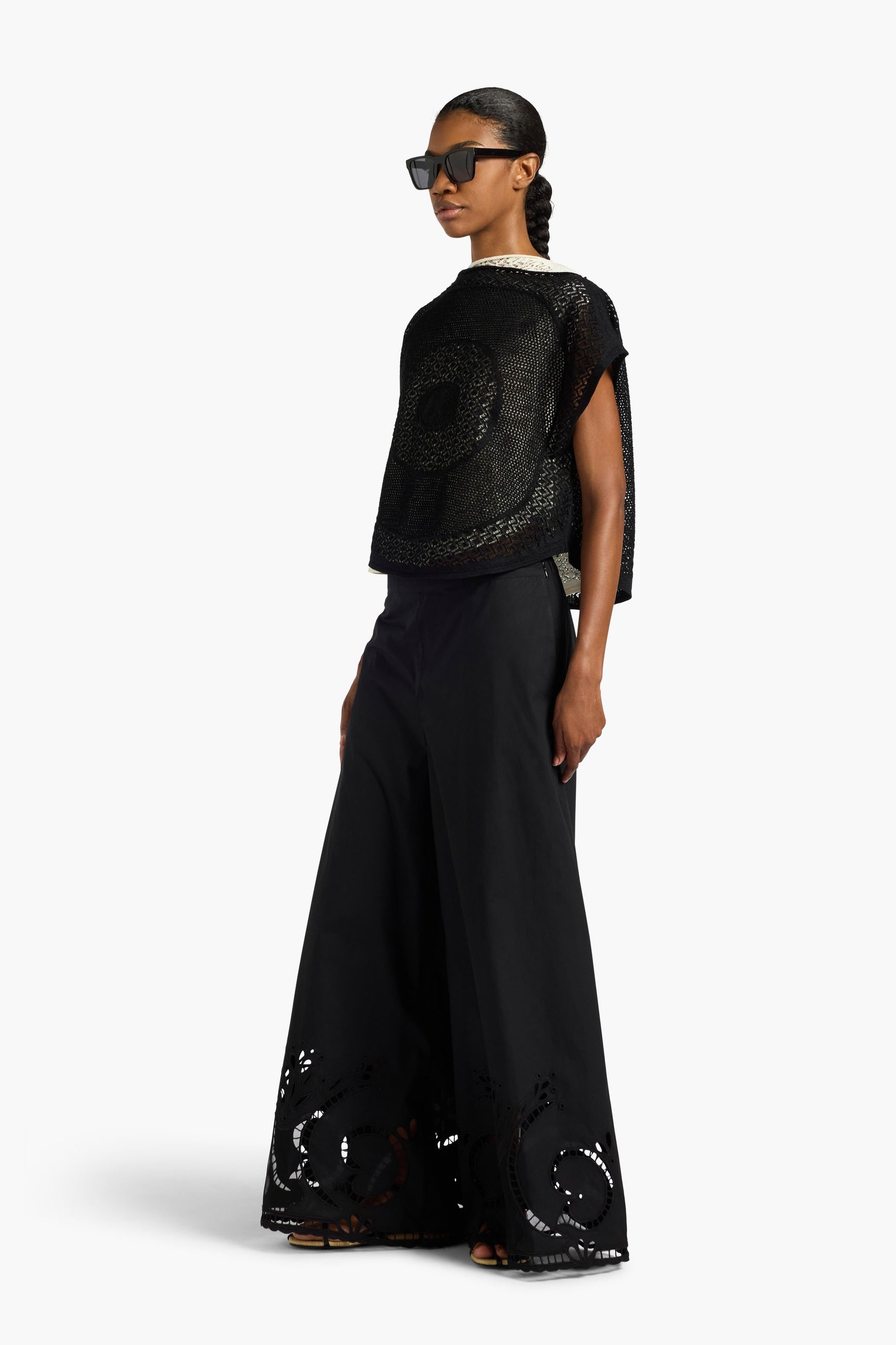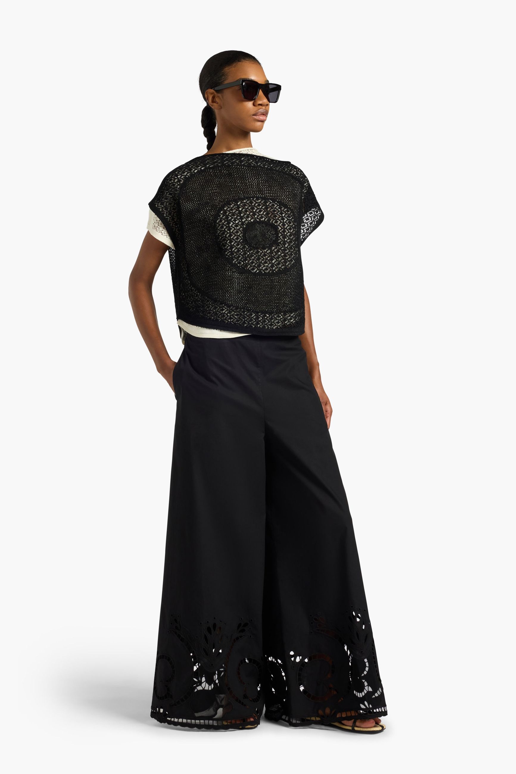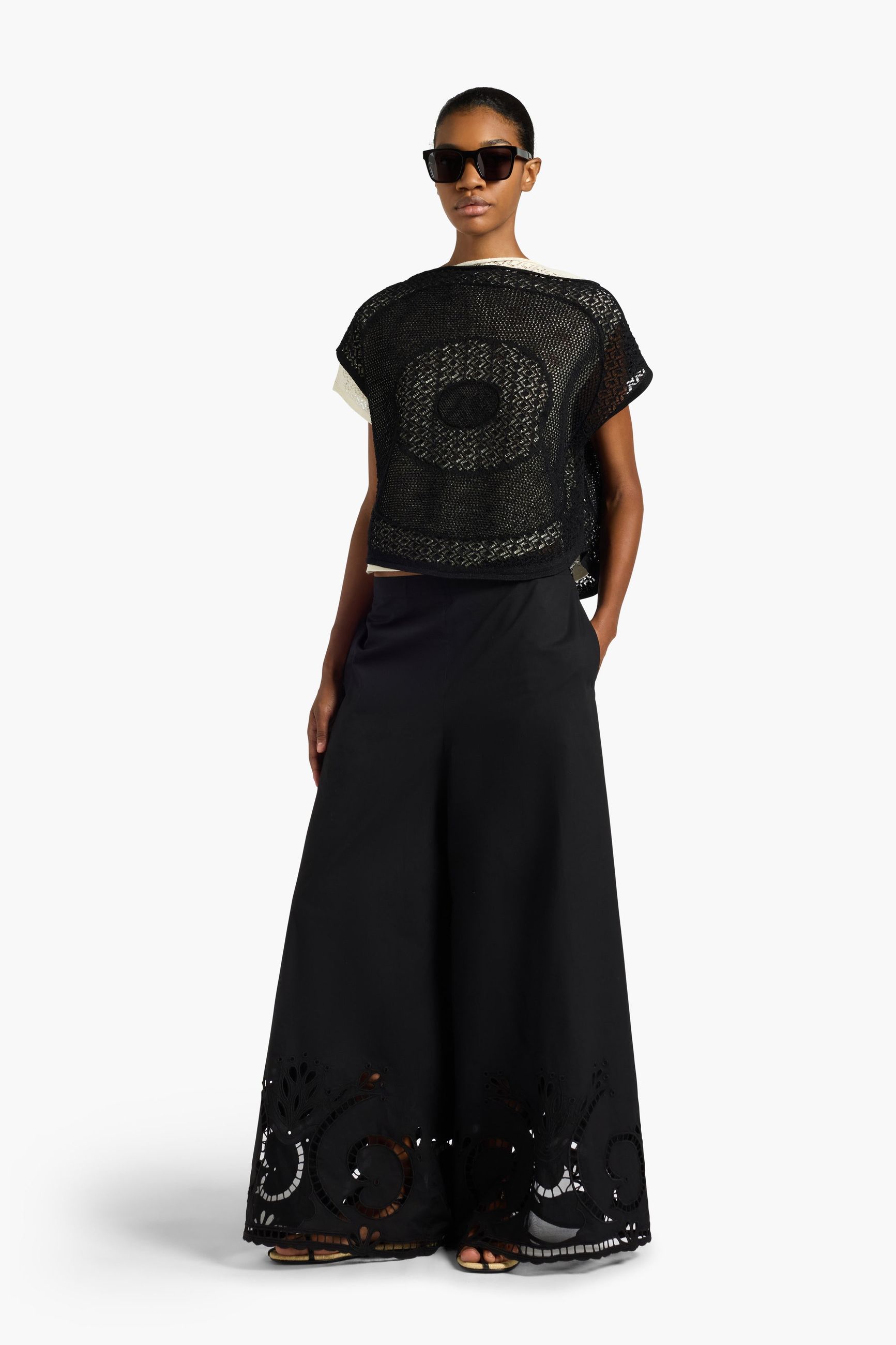 MAGLIA IN COTONE LAVORAZIONE PIZZO CON SCOLLO A BARCHETTA E MANICHE AD ALETTA. LINEA MORBIDA LEGGERMENTE STONDATA AL FONDO. LA LEGGEREZZA DELLA LAVORAZIONE CREA UN MOTIVO GEOMETRICO CON TRASPARENZE.