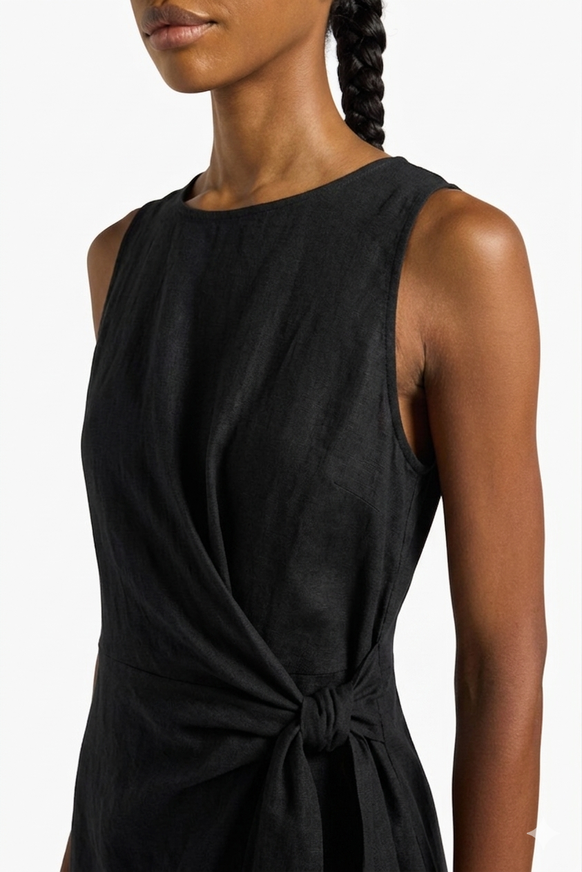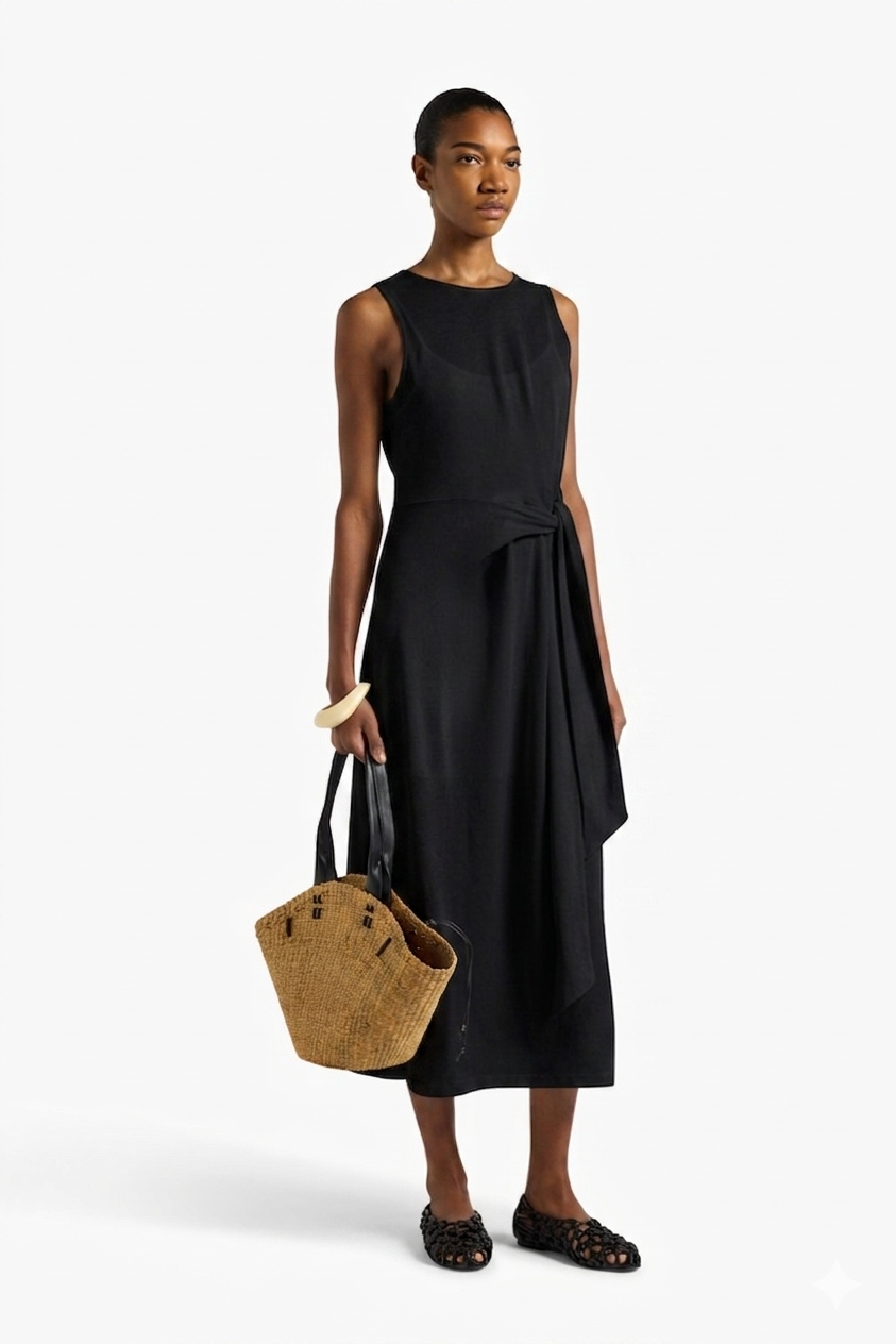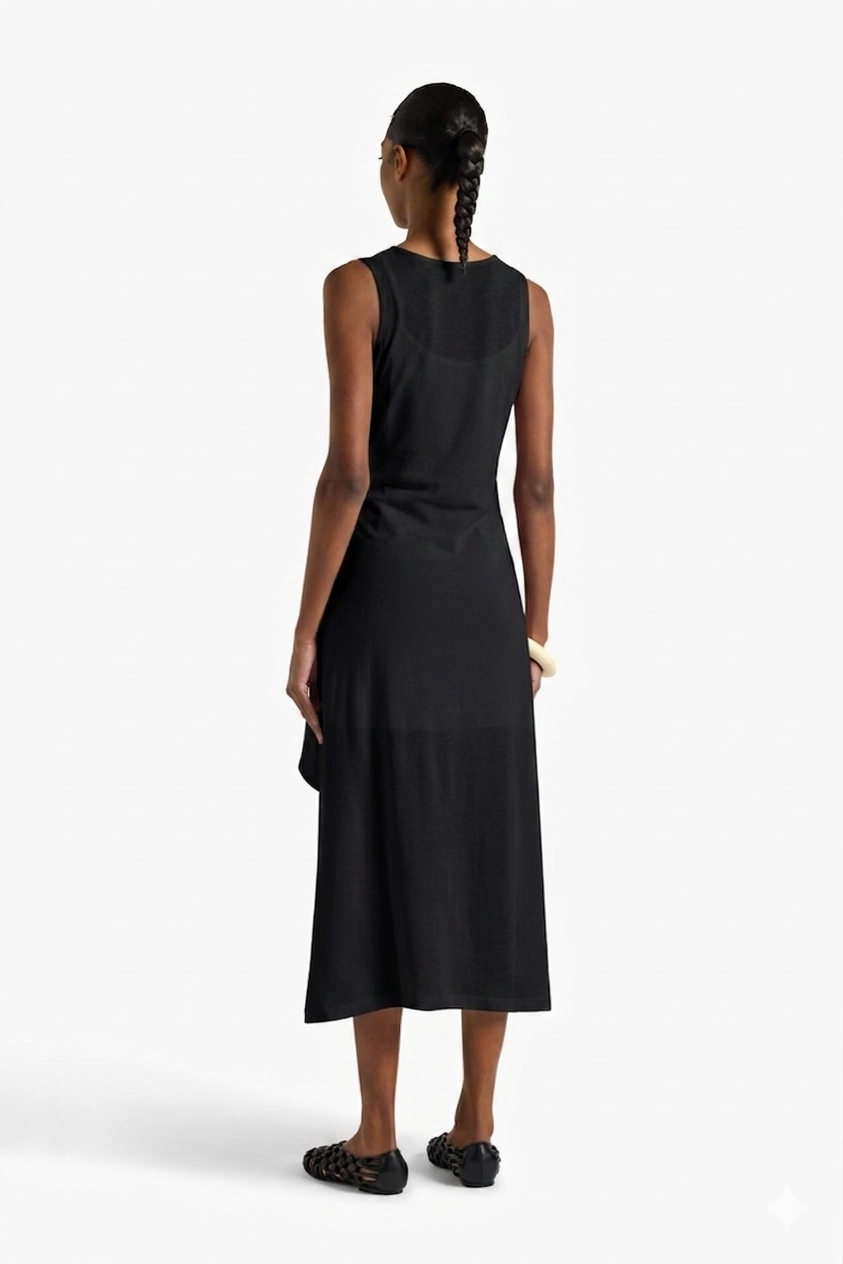 ABITO SMANICATO IN JERSEY CREPE 100% COTONE ORGANICO A CANOTTA CON NODO LATERALE SUL FIANCO SX CHE CREA UN MOTIVO DI DRAPPEGGIO SUL DAVANTI. LINEA DRITTA, LUNGHEZZA AL POLPACCIO. SOTTOVESTE INCLUSO.