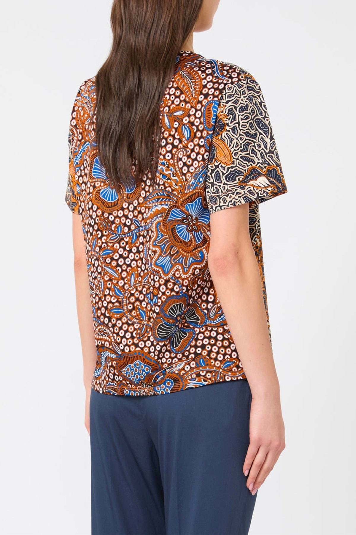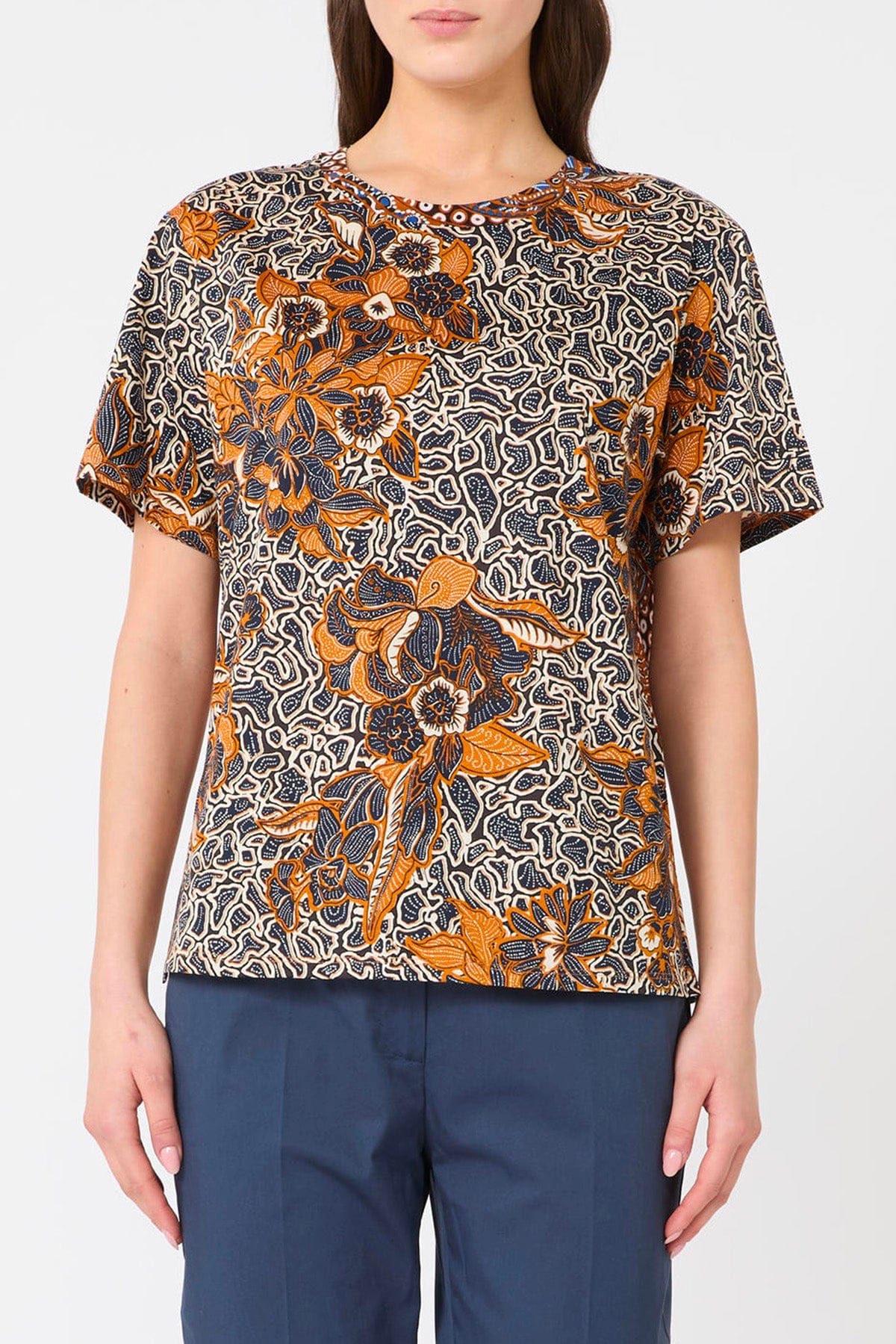T-shirt in jersey di puro cotone che unisce comfort e stile. Il girocollo classico e le maniche corte la rendono perfetta per la stagione calda, mentre la stampa all-over e il logo ricamato su una manica aggiungono un tocco di personalità. La linea dritta garantisce una vestibilità moderna e versatile, ideale per look casual e sofisticati. Caratteristiche principali: - Jersey di puro cotone - Linea dritta - Girocollo - Maniche corte - Logo ricamato Un essenziale da avere nel guardaroba, perfetto da indossare da sola o stratificata con altri capi.