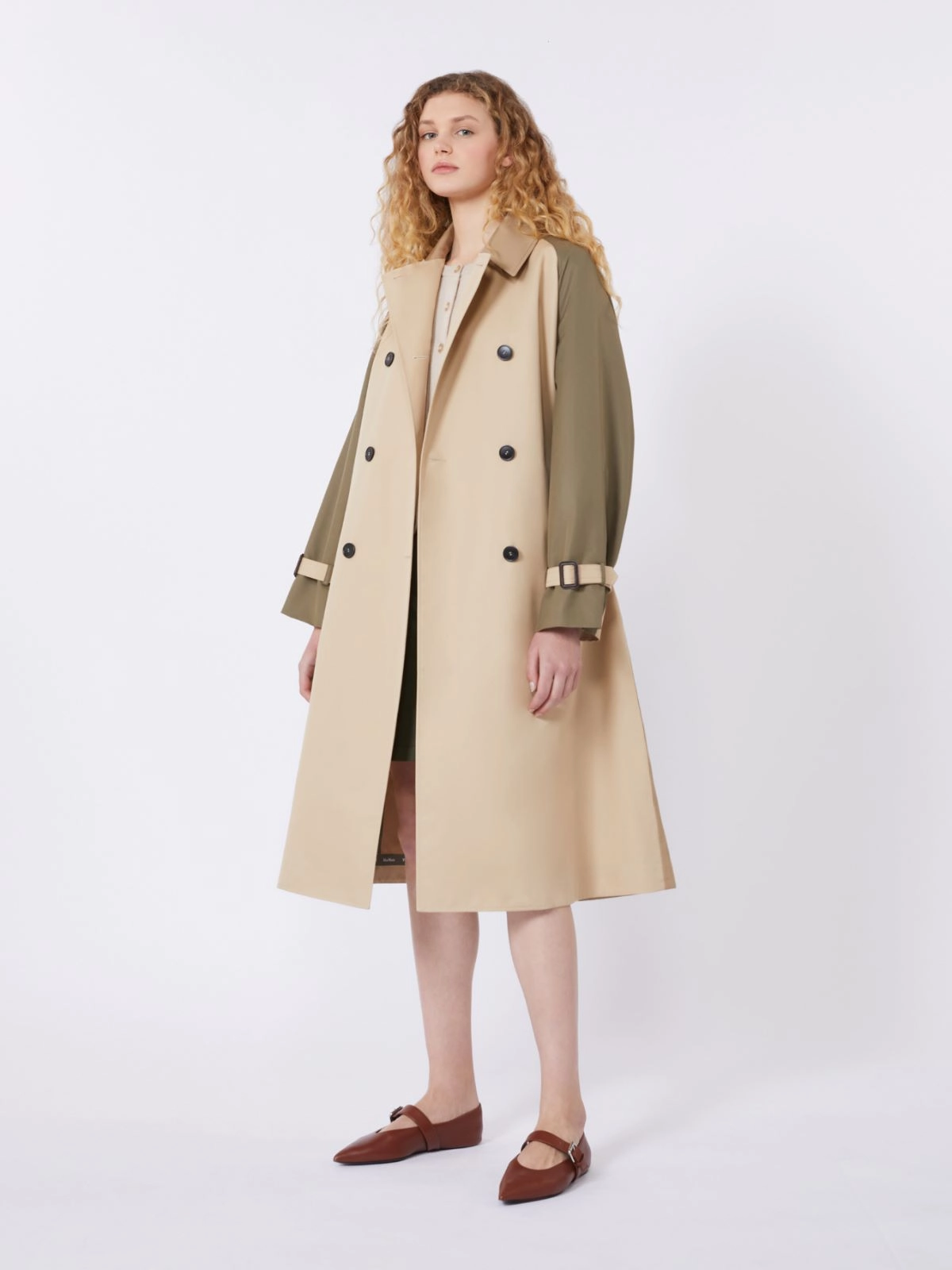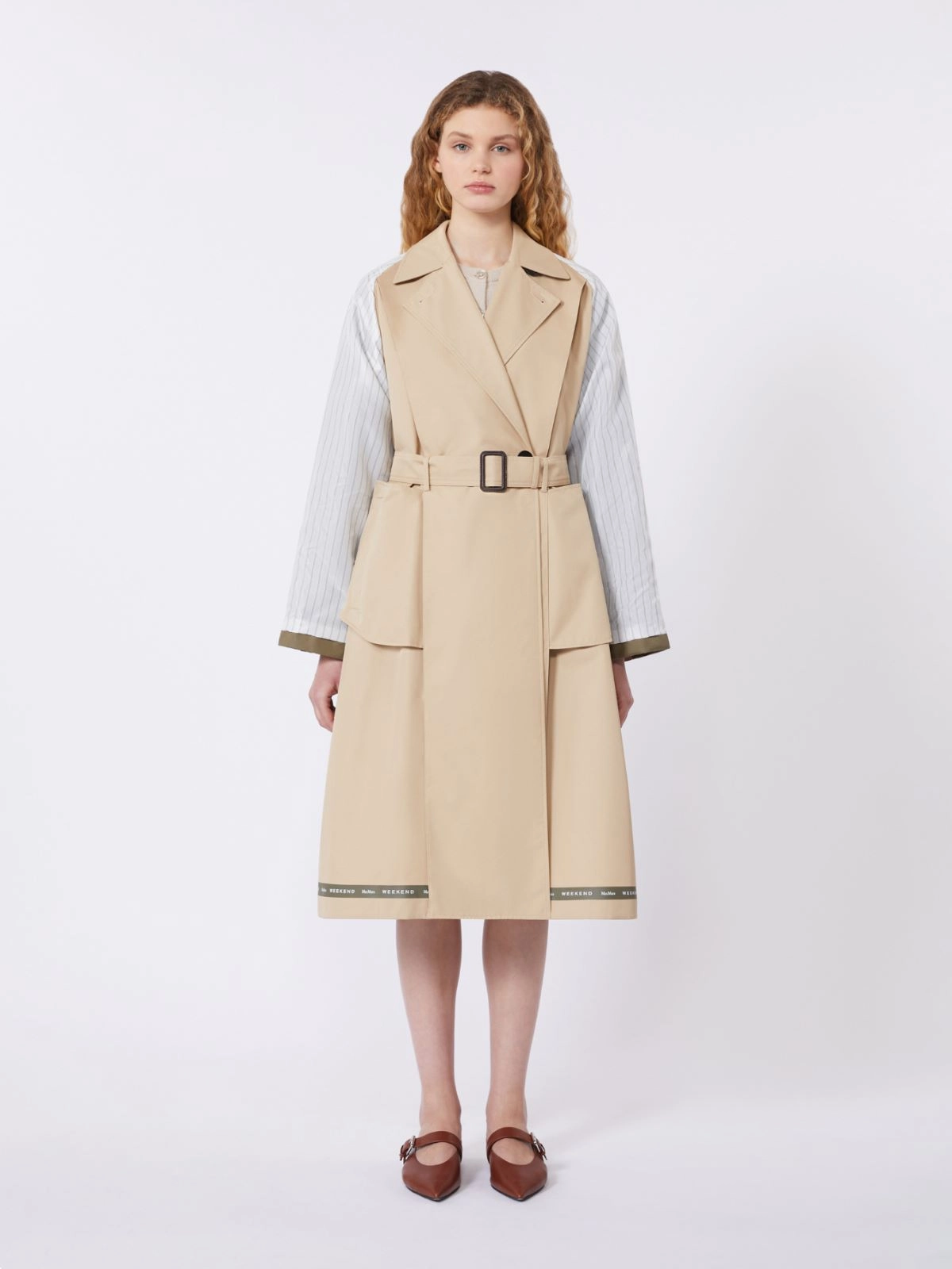 Trench in gabardina di cotone antigoccia Colletto a camicia doppio uso Maniche raglan con alamari regolabili sui polsi Chiusura con bottoni e cintura abbinata con fibbia in pelle Un lato ha tasche a filettone, l'altro tasche effetto inside-out Logo Weekend Max Mara stampato nella fodera interna dello sprone Semifoderato e nastrature tecniche