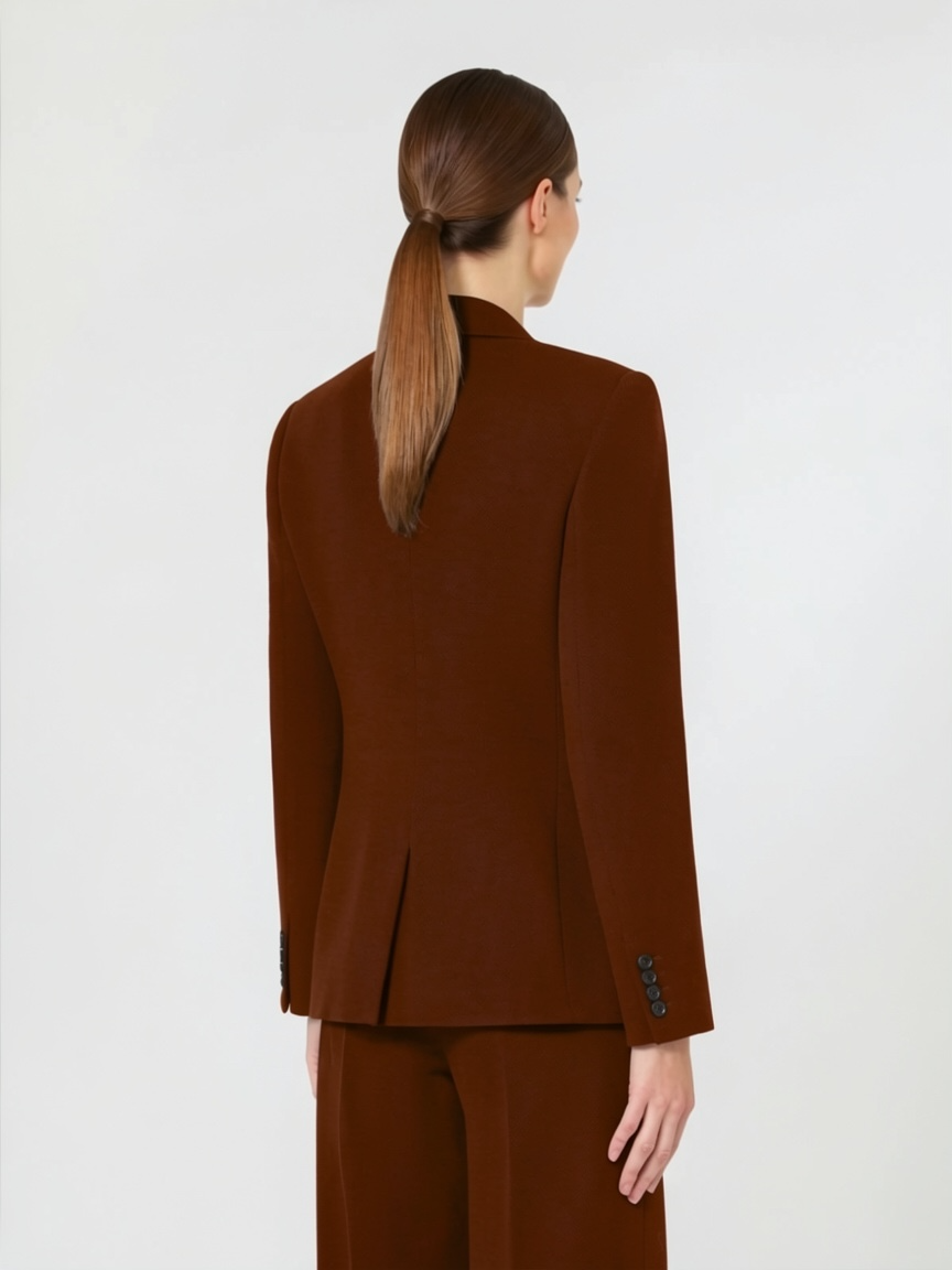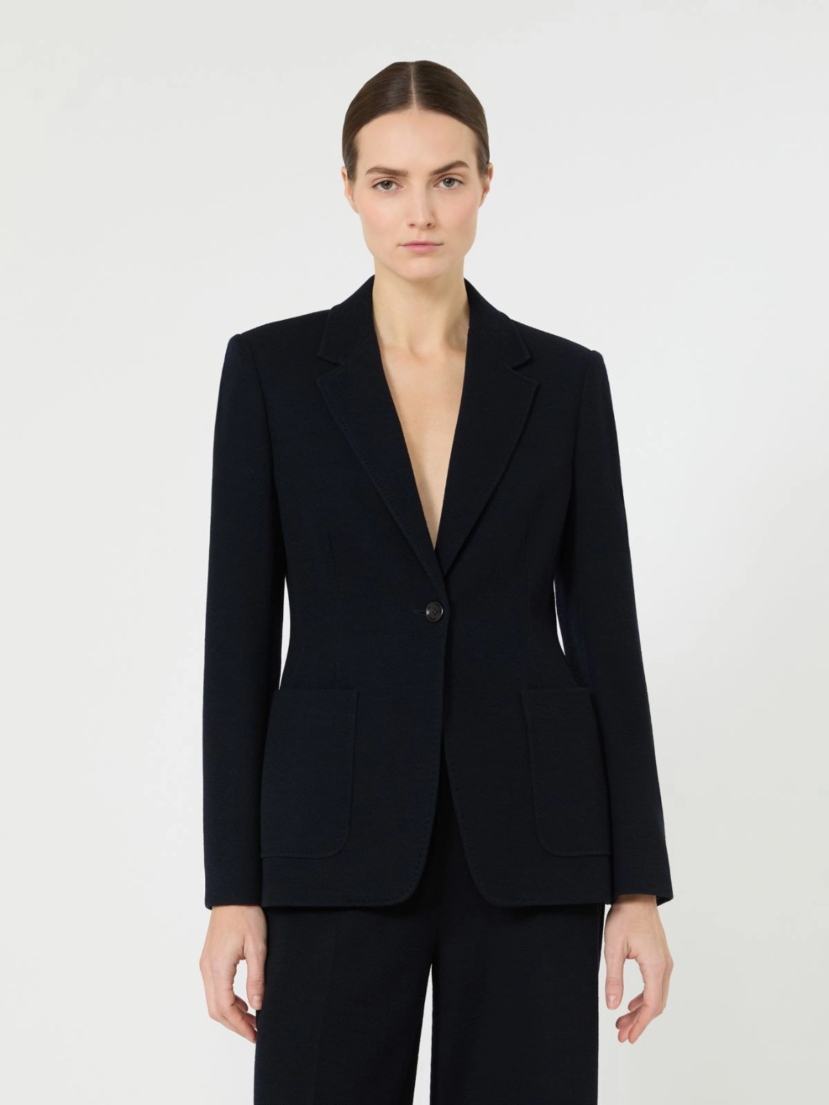 Blazer in jersey double di cotone Collo a rever Maniche lunghe a giro Chiusura frontale con due bottoni Taschino sul petto e tasche a filetto con patta applicata Foderato