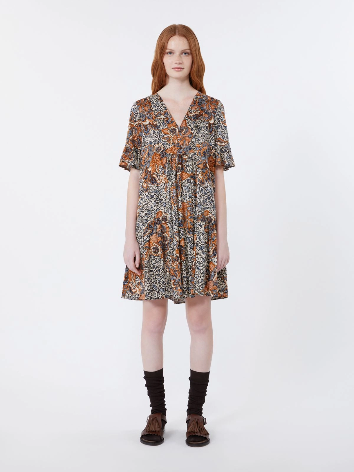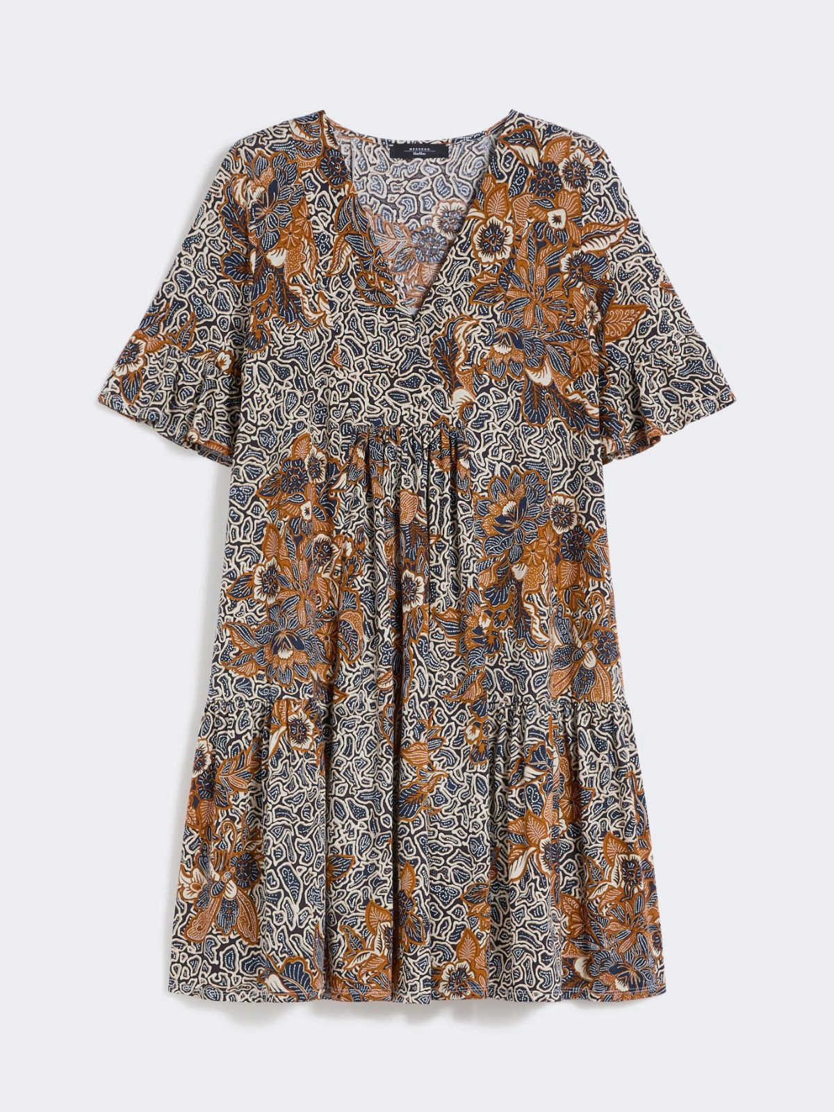 Abito kaftano corto con gonna a balze e motivo di collezione stampato all over.