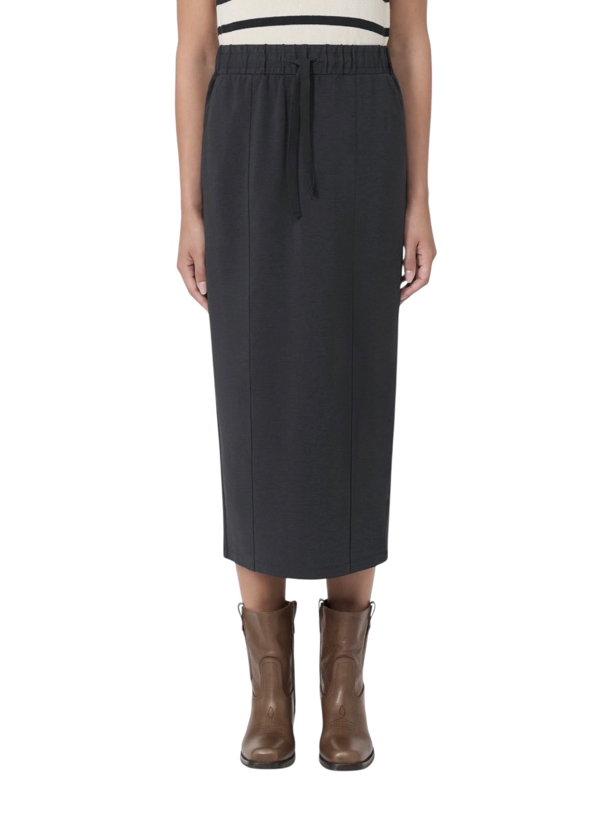 Gonna in jersey di cotone e lyocell a punto Milano Linea dritta Vita elasticizzata in popeline con coulisse Tasche alla francese sui fianchi Sfoderata Taglia e vestibilità La modella veste la taglia M ed è alta 180 cm. Le sue misure sono: vita 63 cm e fianchi 90 cm