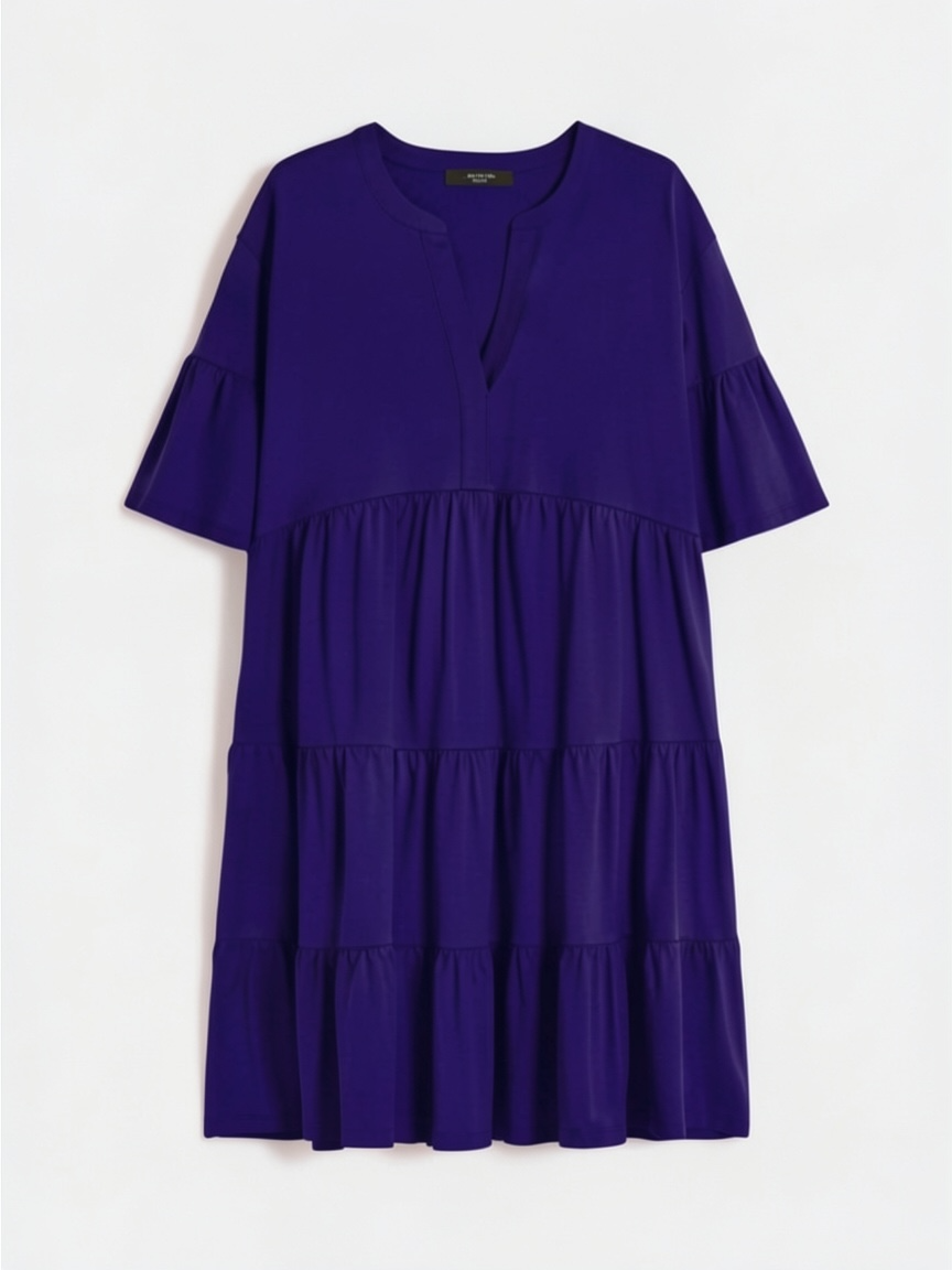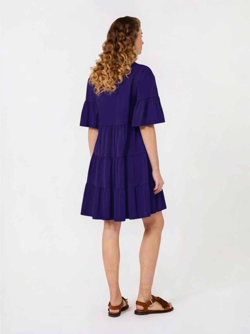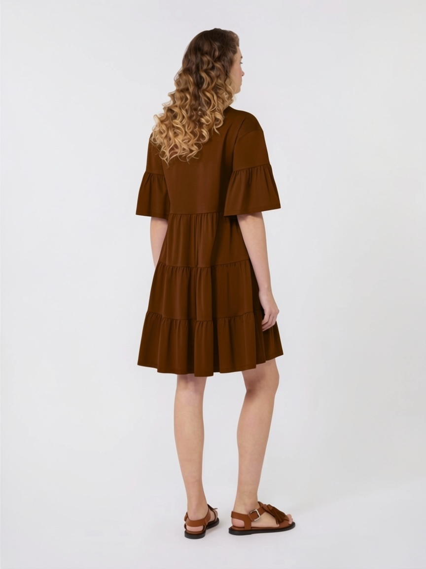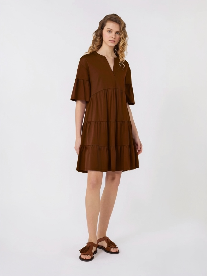 Abito kaftano corto, caratterizzato da gonna a balze che dona volume e movimento al capo.