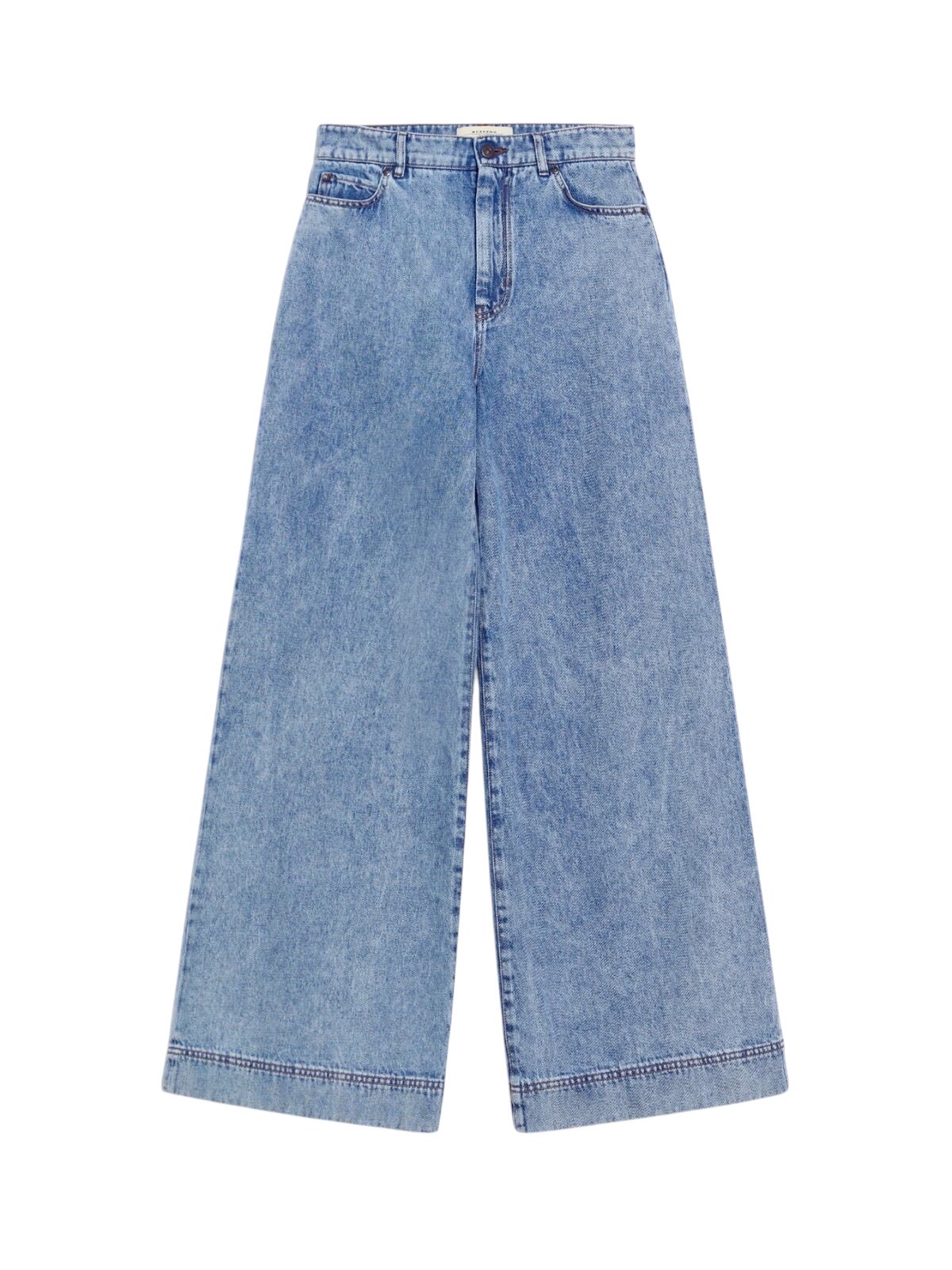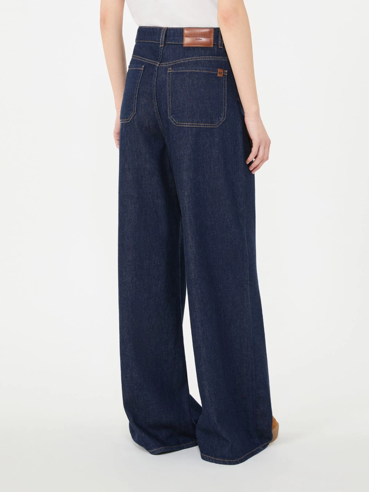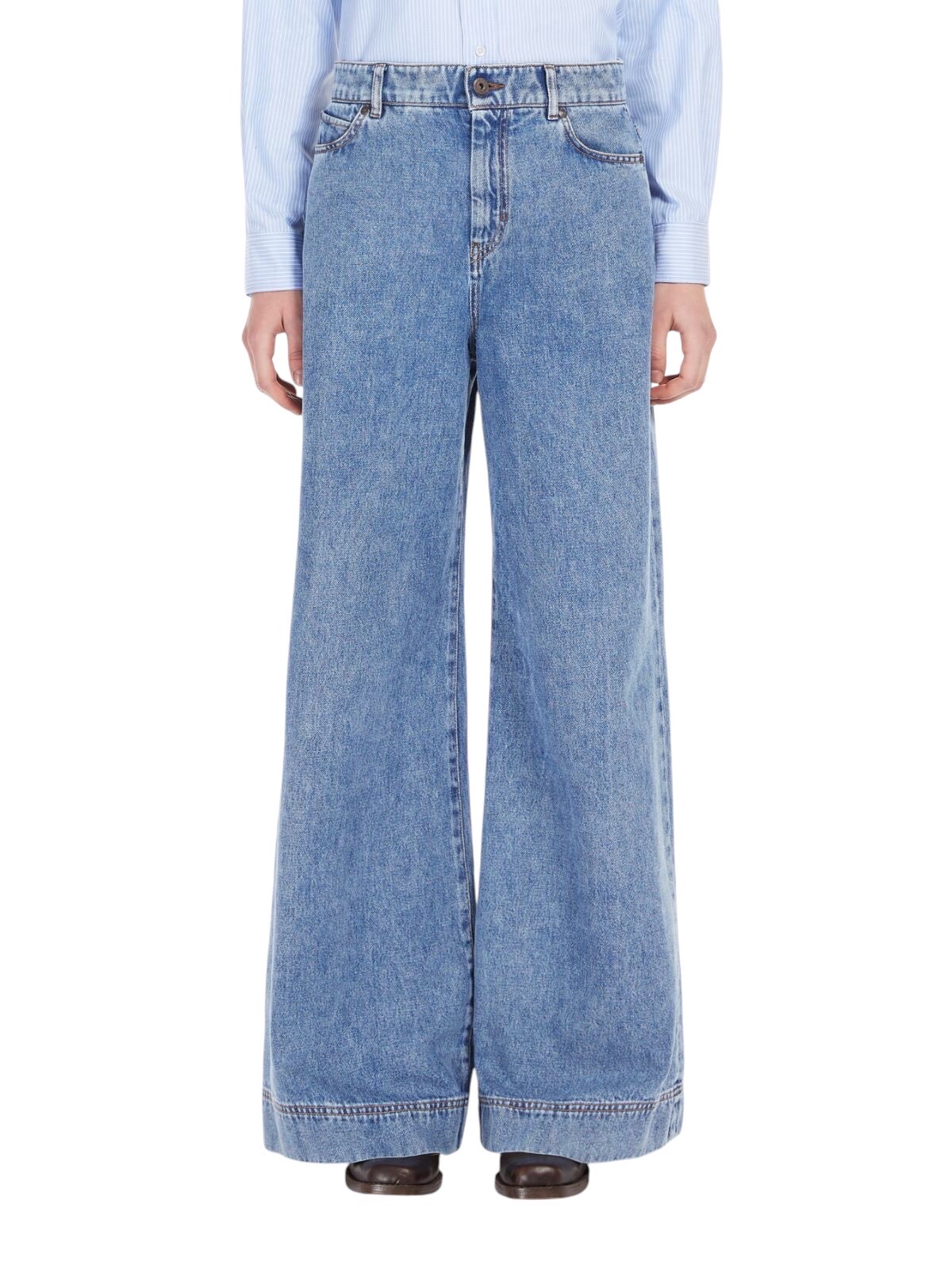 Jeans a gamba larga in autentico tessuto denim di puro cotone. Il modello a 5 tasche vanta un profondo dettaglio di impunture sull'orlo, oltre a passanti per cintura in vita e tasche posteriori applicate. Chiusura con cerniera coperta da patta e bottone a chiodo.