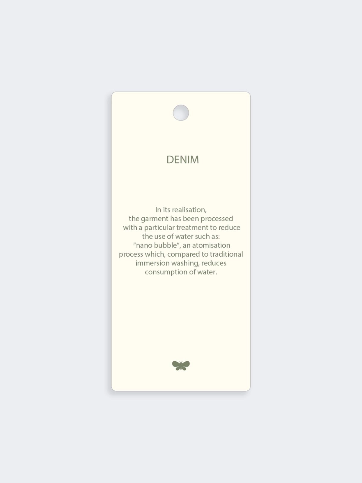 Lavare in lavatrice a freddo con ciclo delicato; non candeggiare; non asciugare in asciugatrice; asciugare all'ombra; stirare a bassa temperatura; non lavare a secco; non stirare le etichette; fare attenzione quando si indossano capi o accessori chiari perché, con il calore del corpo, il tessuto indaco potrebbe scolorire e macchiarsi. fare attenzione quando si è seduti su superfici di colore chiaro, soprattutto se bagnate. lavare i capi separatamente e sempre al rovescio. appendere il capo al rovescio evitando di esporlo alla luce diretta del sole. evitare di rimuovere macchie isolate; contiene parti non tessili di origine animale.