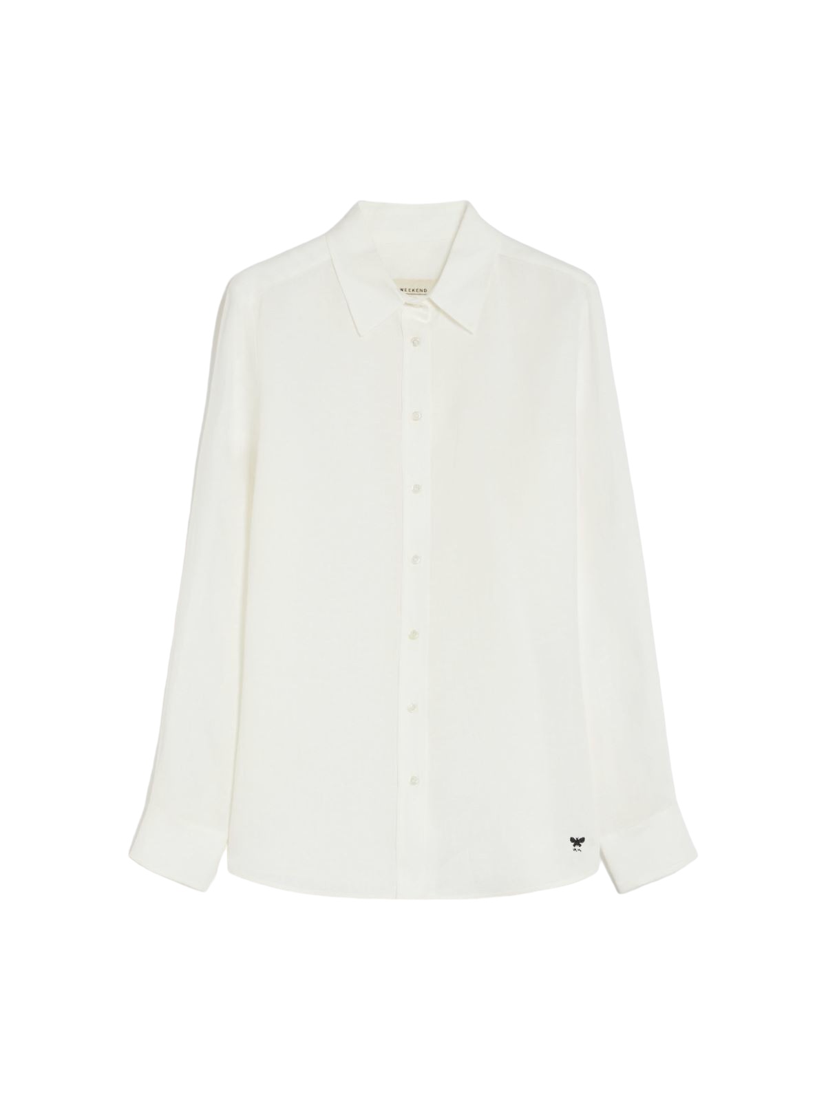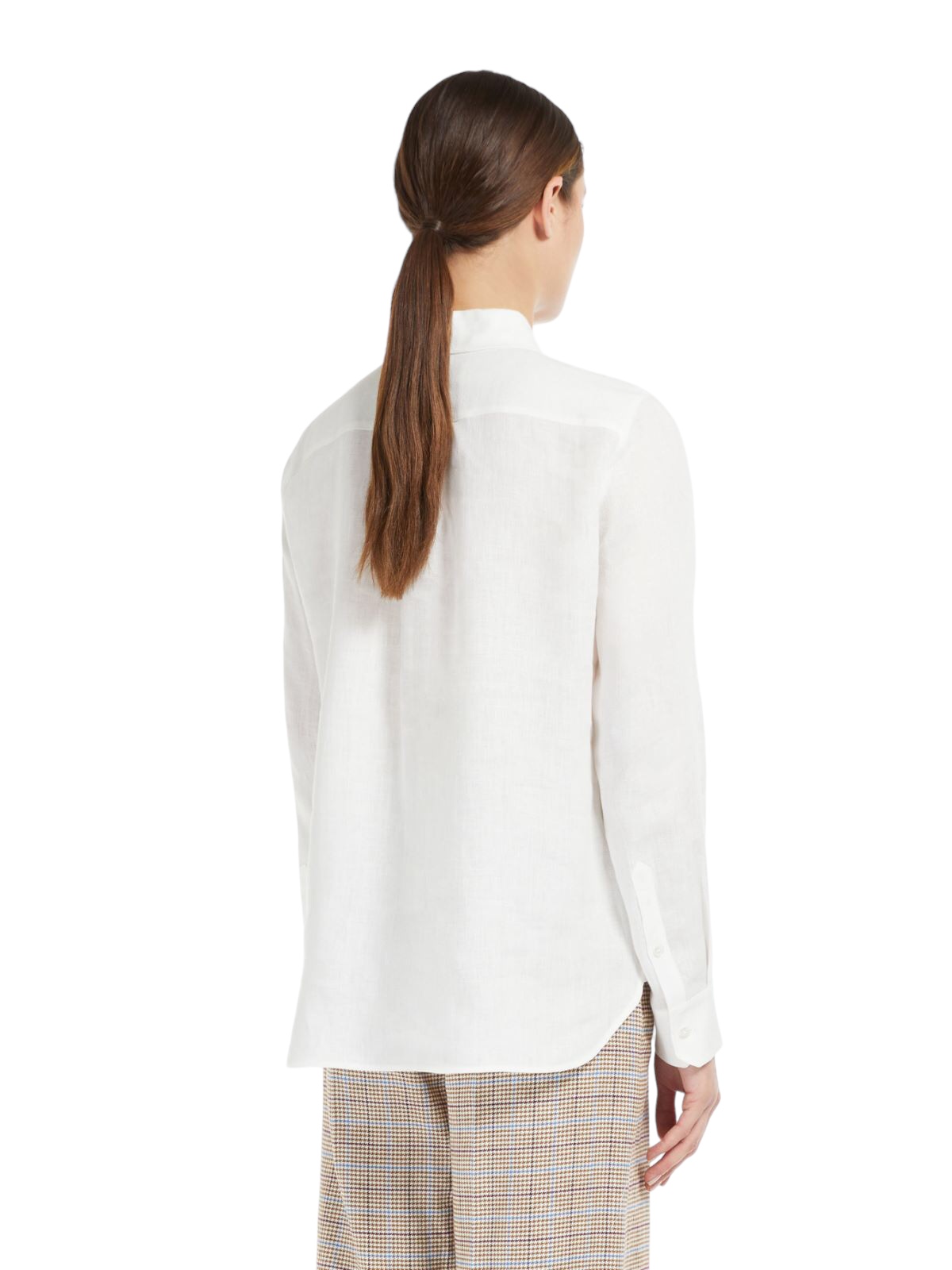 Camicia dal taglio classico realizzata in leggero tessuto di puro lino tinto filo, con colletto a punta e maniche lunghe a giro. Rifinita con piccolo logo ricamato sul fondo, lato sinistro indossato, e taglio carré con cannoncino sul retro. Chiusura frontale con bottoni a vista.
