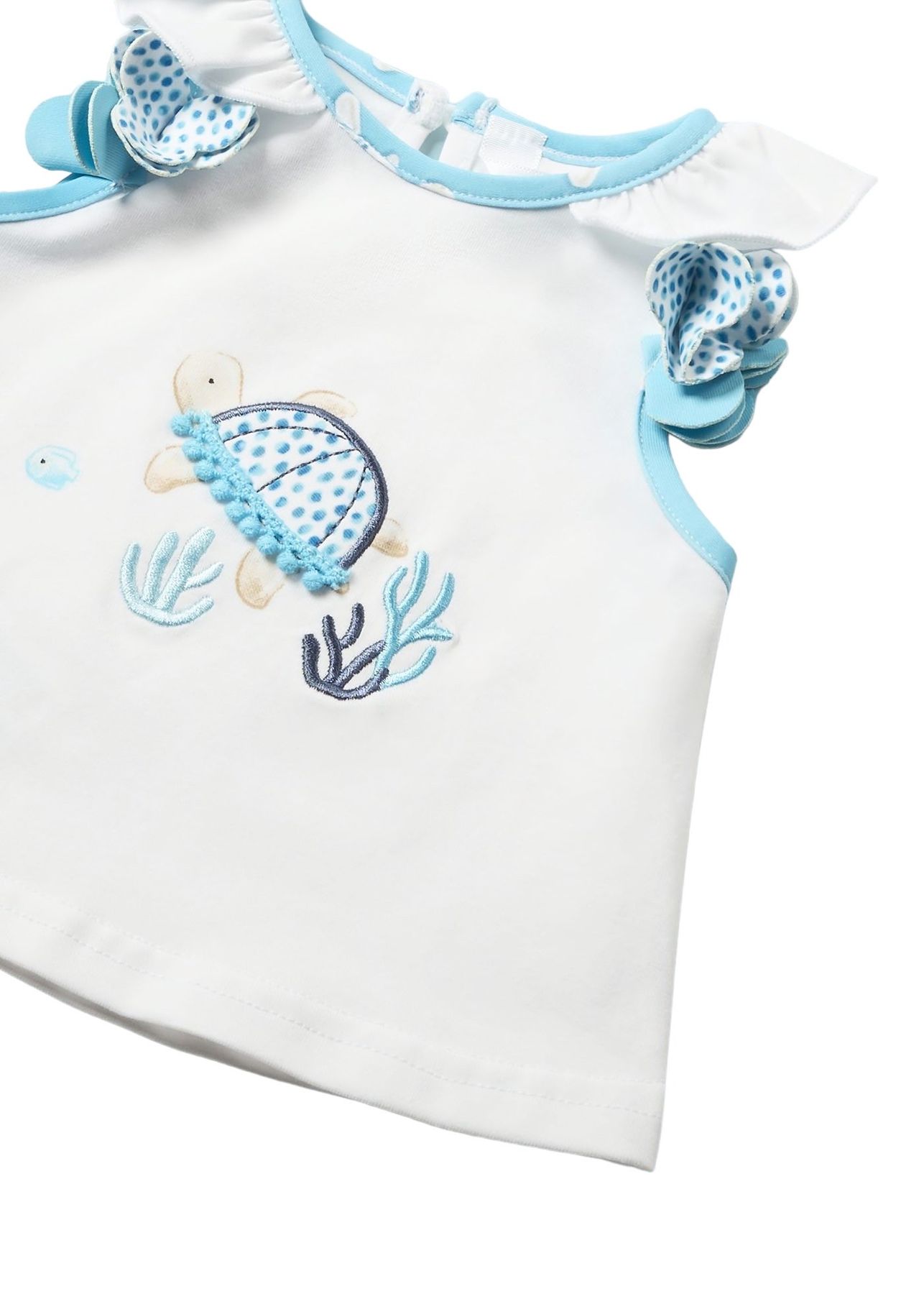 Maglietta con bretelle per neonata. Girocollo. Piccola apertura sulla schiena con chiusura con bottone per facilitare la vestibilità del capo. Design stampato.