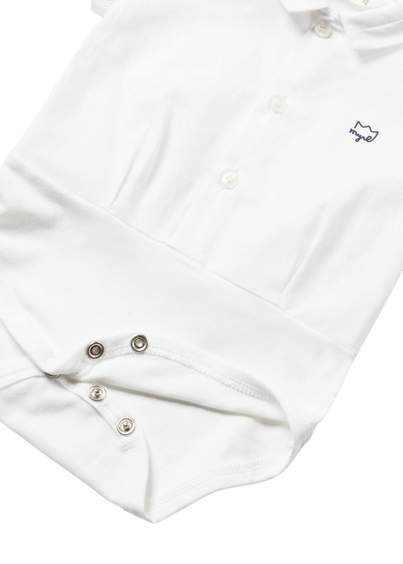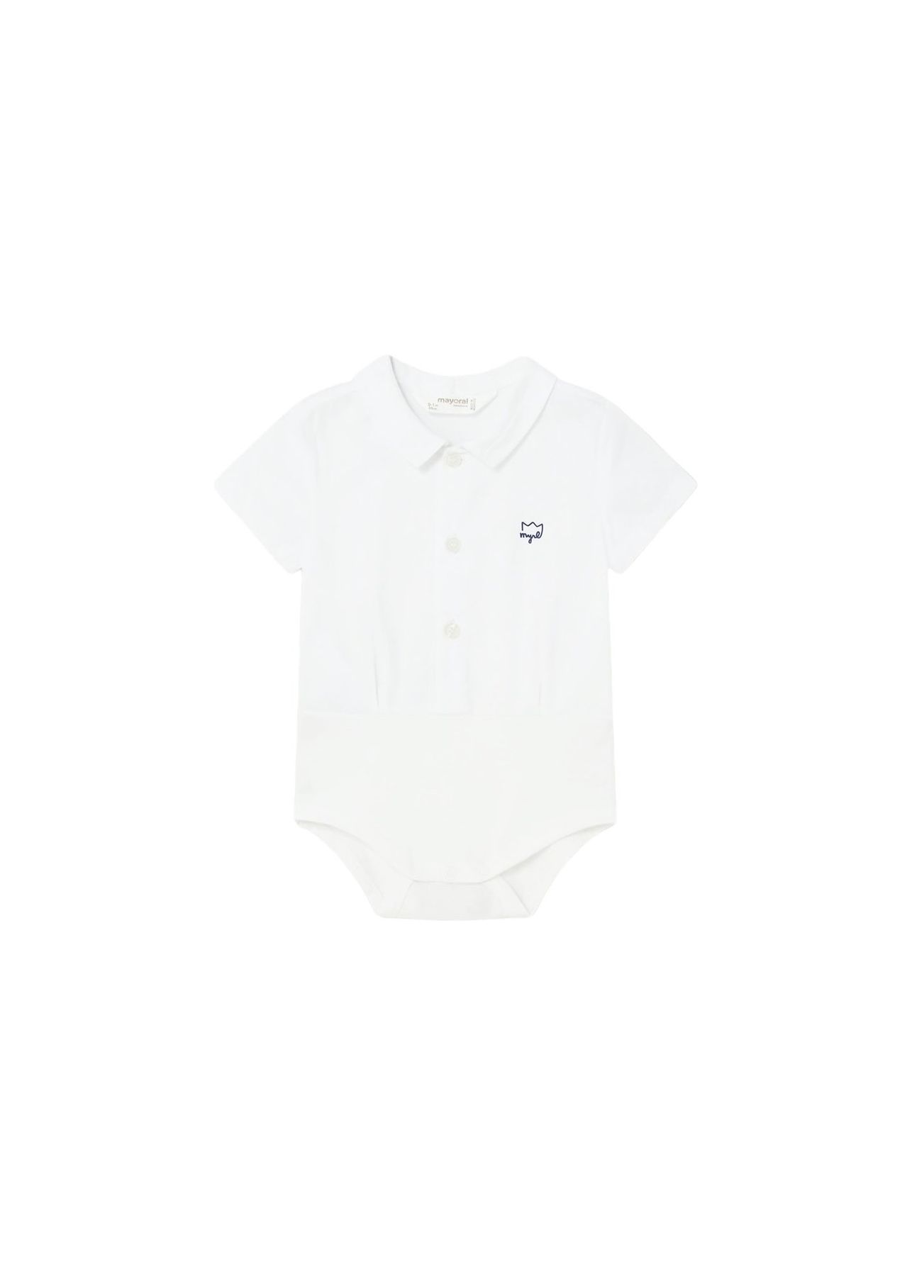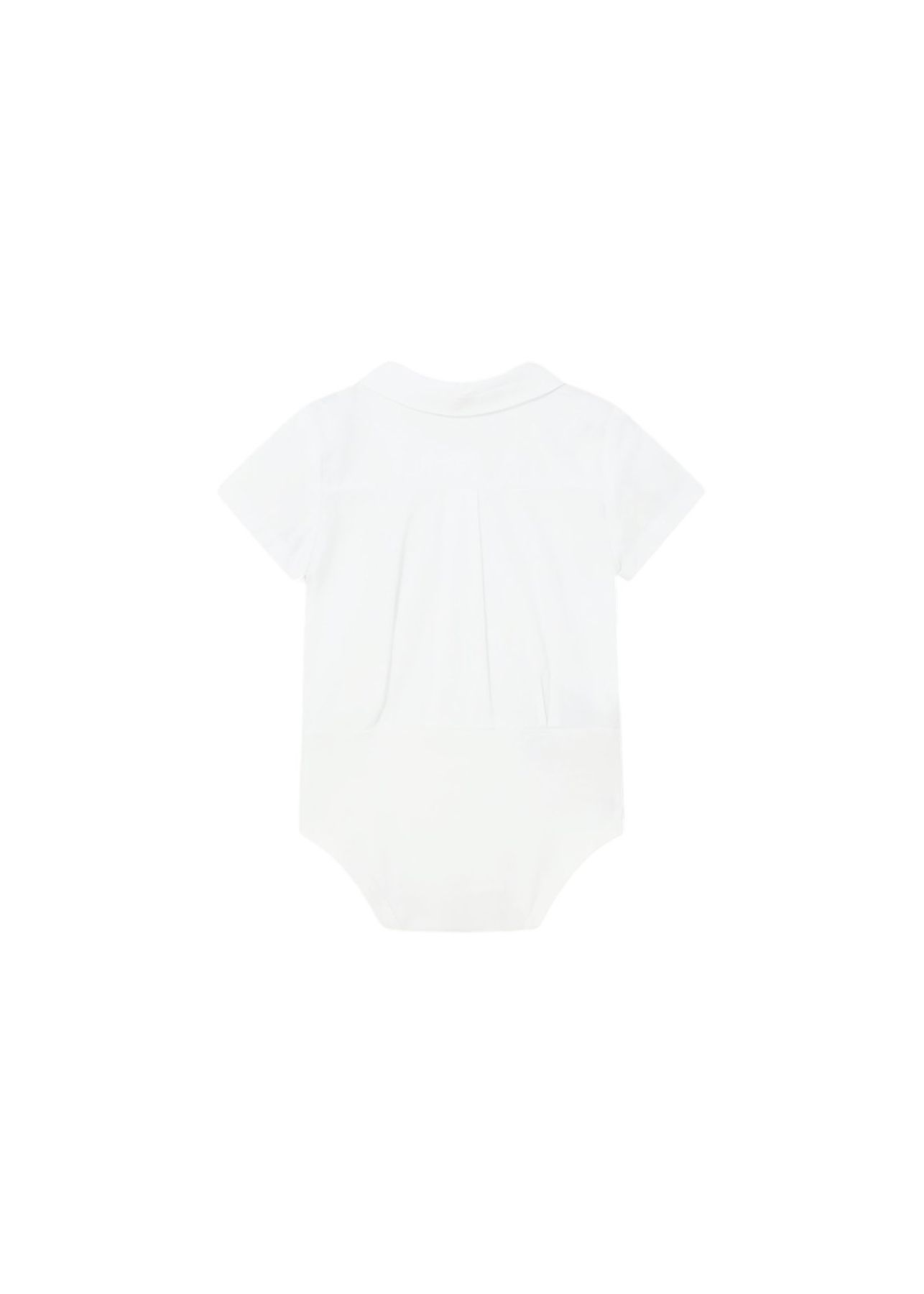 Body a maniche corte per neonati. Colletto modello camicia. Chiusura con bottoni a pressione nell'interno cosce per agevolare la vestibilità. Chiusura con bottoni nella parte anteriore.