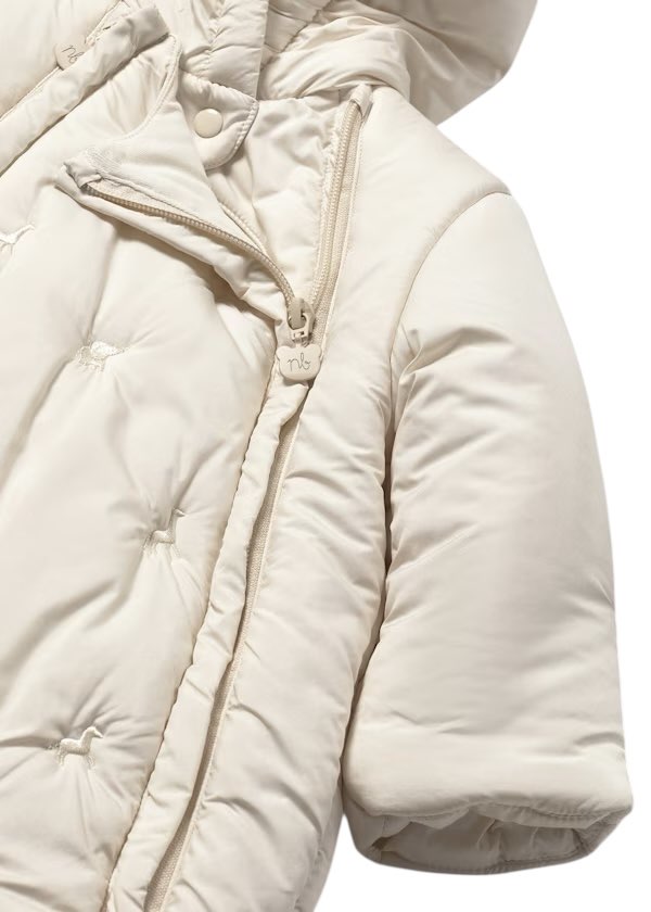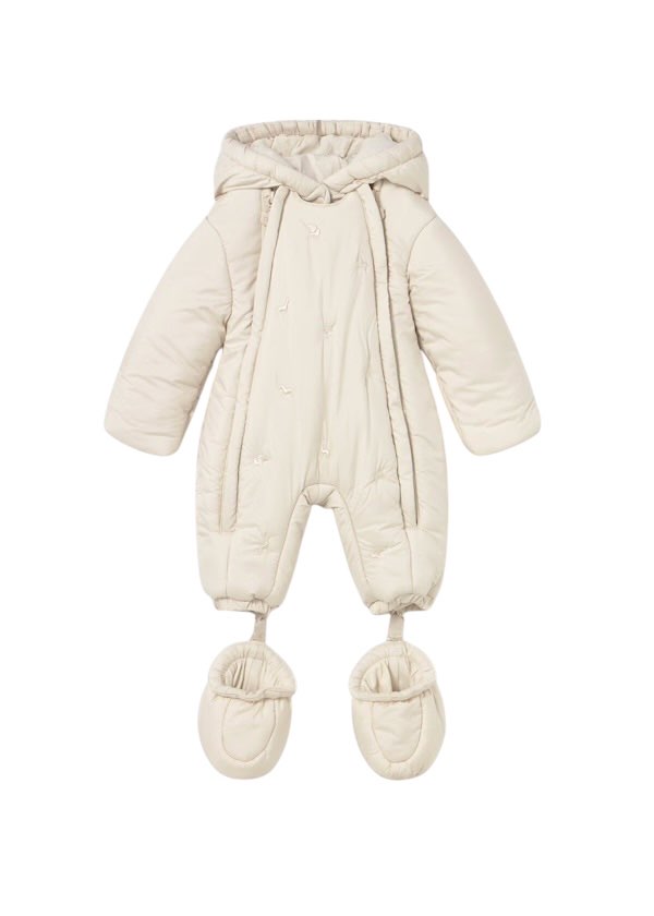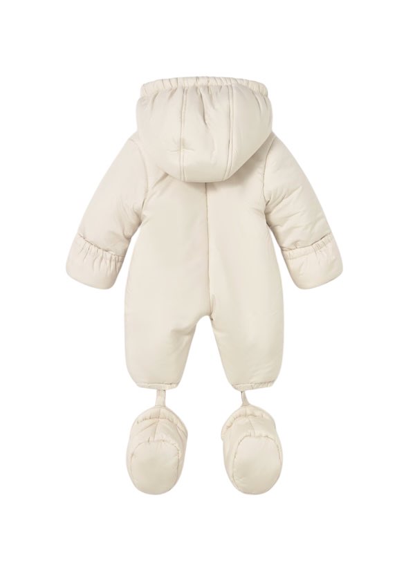 Tuta termica manica lunga per neonato. Colletto con cappuccio. Chiusura centrale con cerniera.