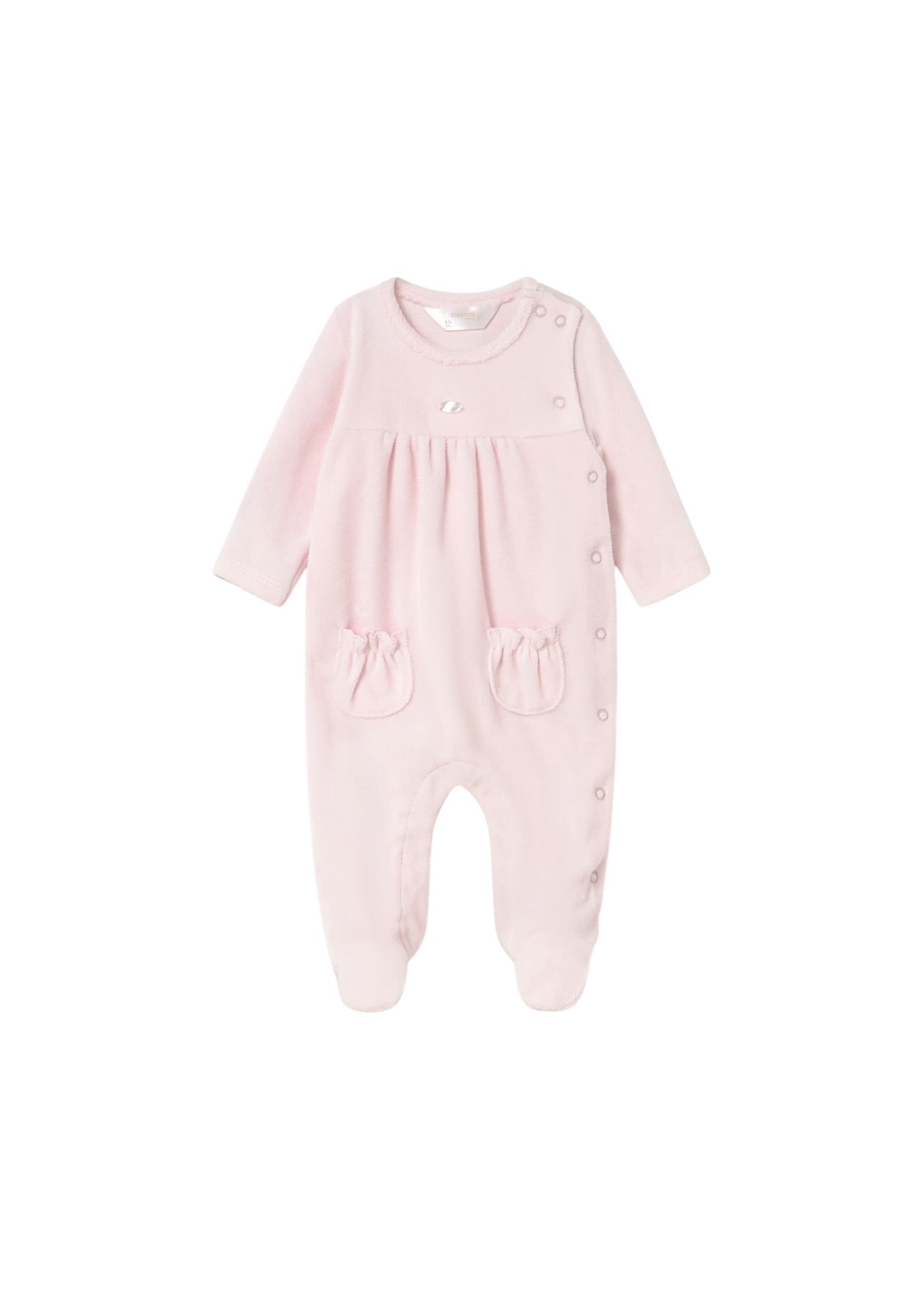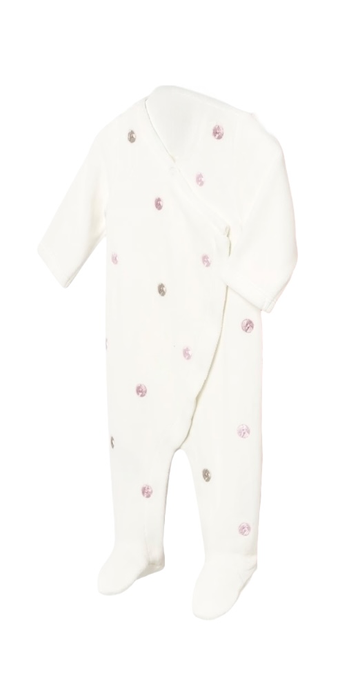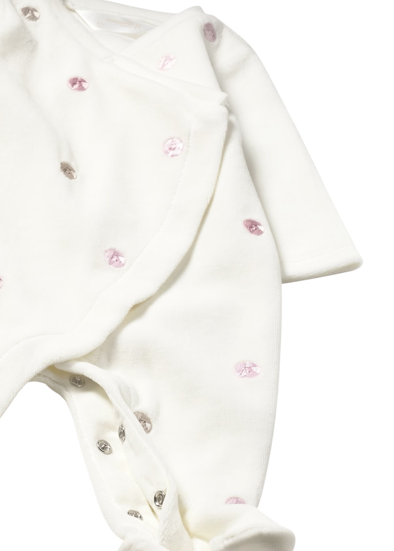 Pigiama manica lunga per neonata. Girocollo. Chiusura laterale con bottoni a pressione. Chiusura con bottoni a pressione nell'interno cosce per agevolare la vestibilità. Elementi decorativi: applicazione decorativa, ricamo