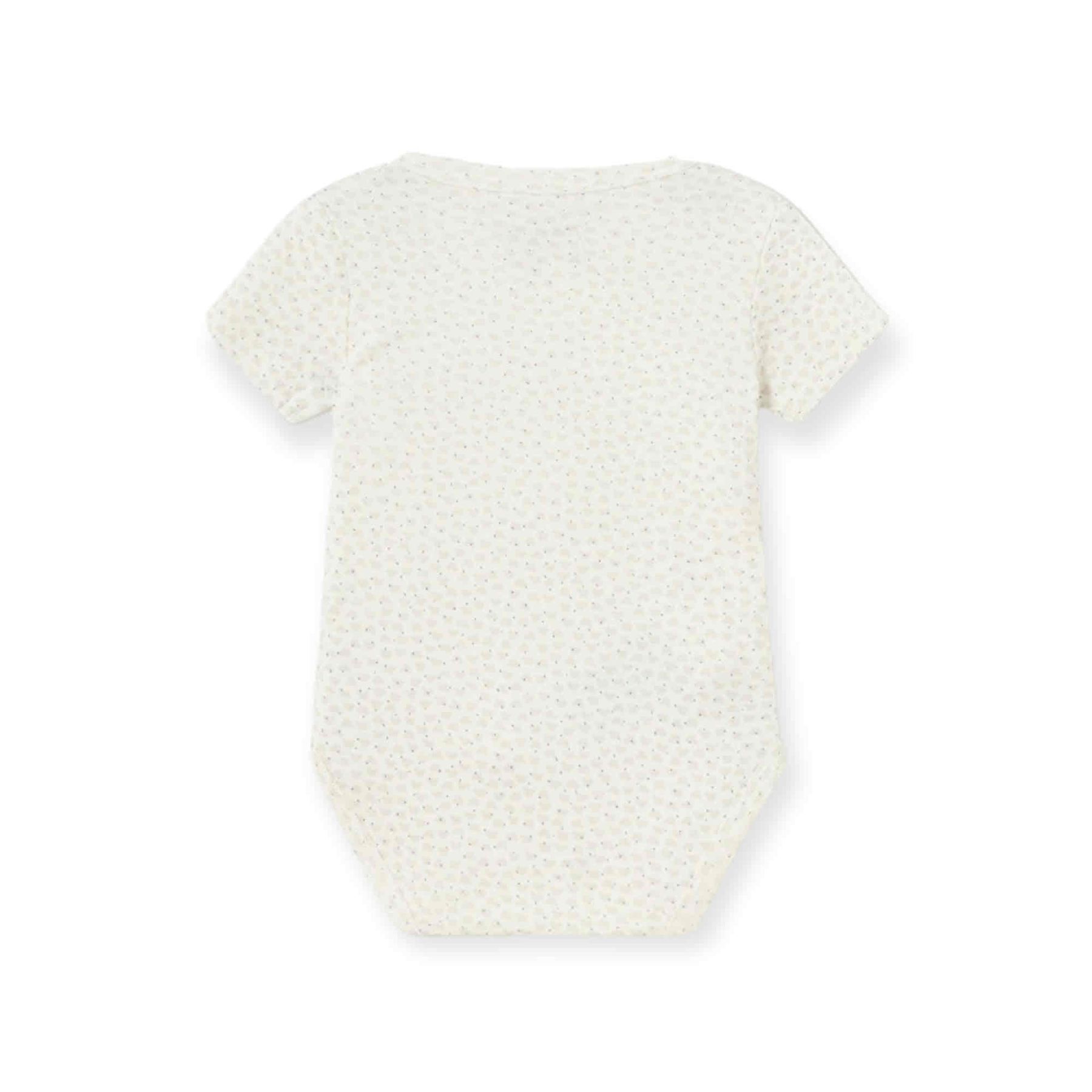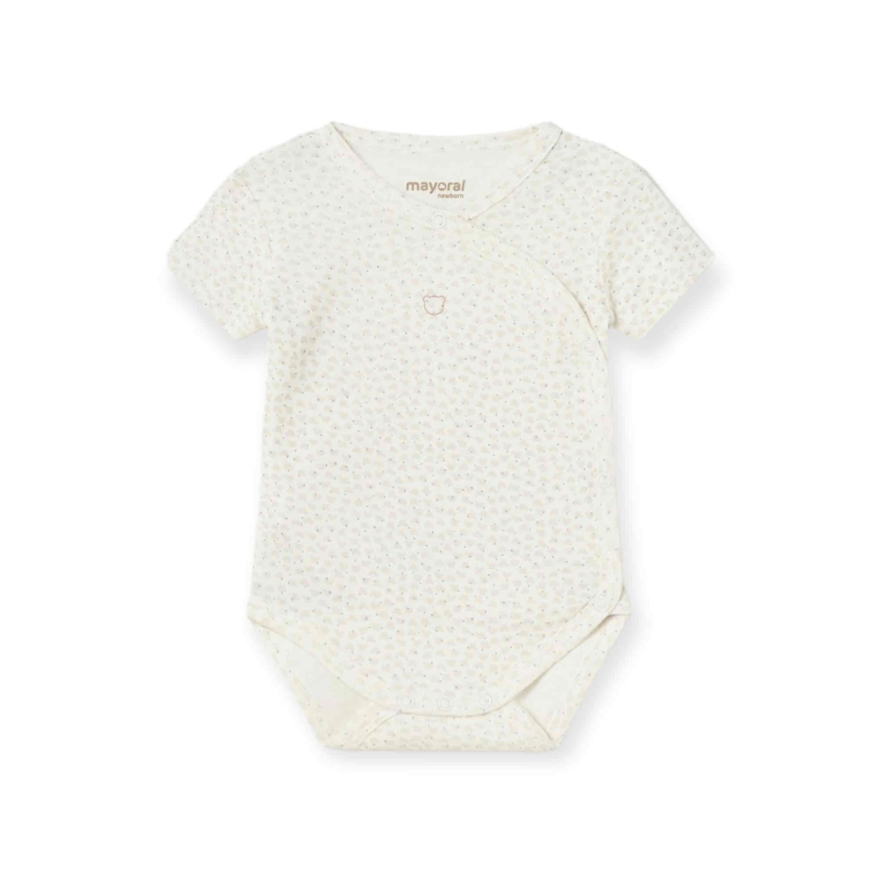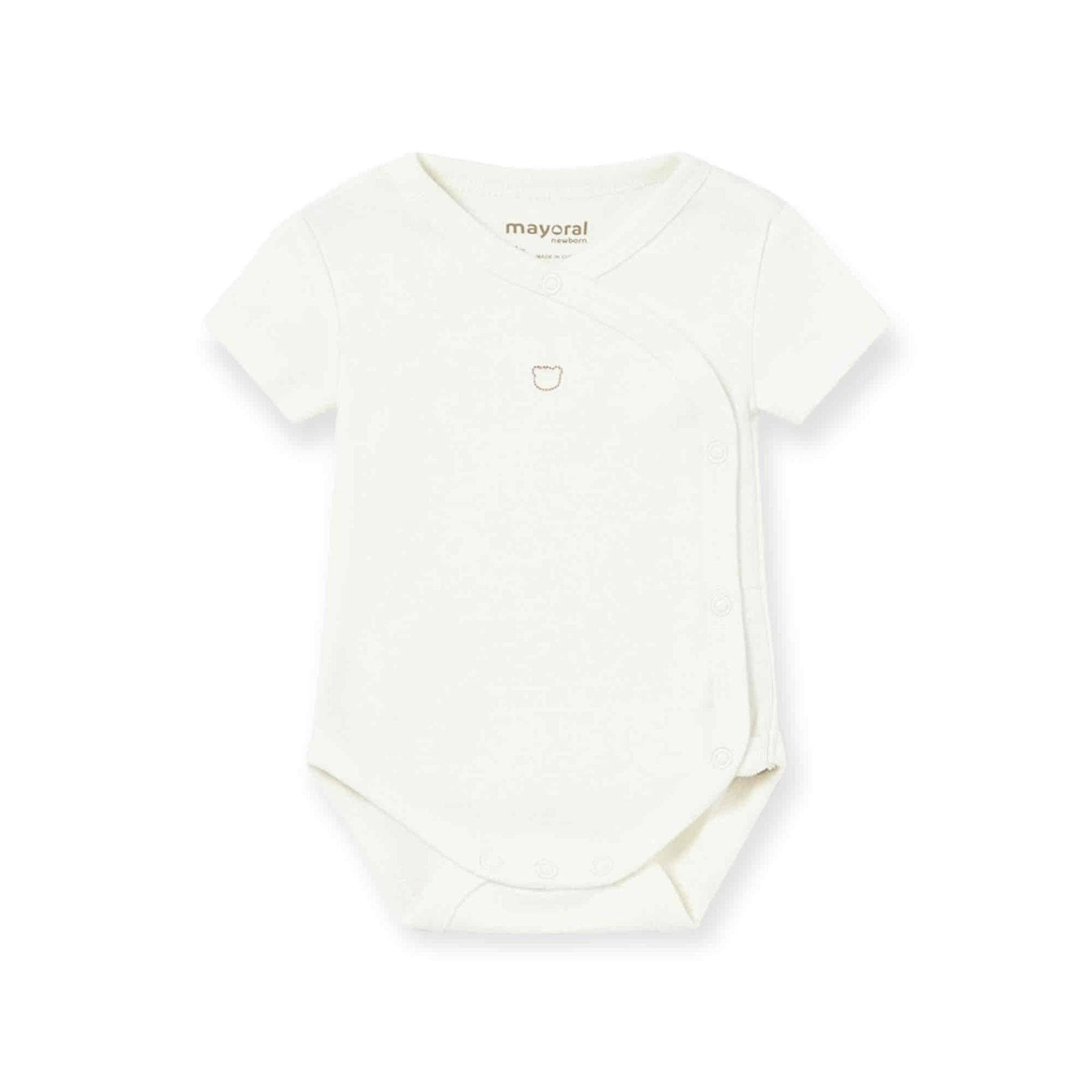 Body manica corta per neonato. Scollo incrociato e apertura laterale completa con bottoni a pressione per facilitare la vestibilità del body. Chiusura con bottoni a pressione nell'interno cosce per agevolare la vestibilità. Tessuto 100% cotone. Per agevolare la vestibilità del body, nelle taglie piccole (dalla 0-1 alla 2-4 mesi) l'apertura sulla spalle è sostituita dall' apertura laterale completa con bottoncini e scollo ad incrocio.