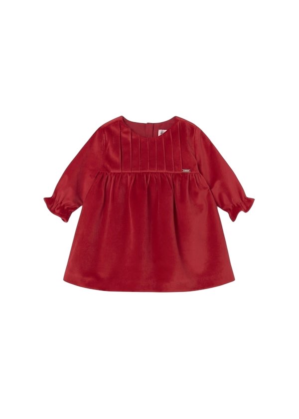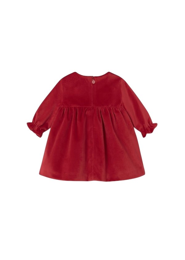Vestito manica lunga per neonata con polsini elasticizzati. Girocollo. Apertura posteriore con cerniera invisibile. Confezione in velluto elegante e classico. Modello con riccio.