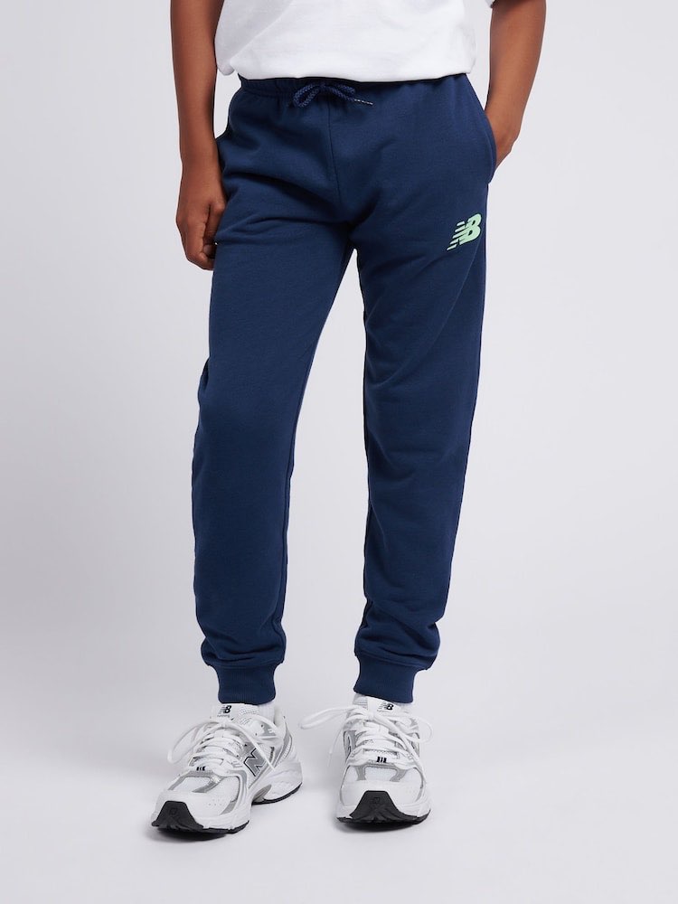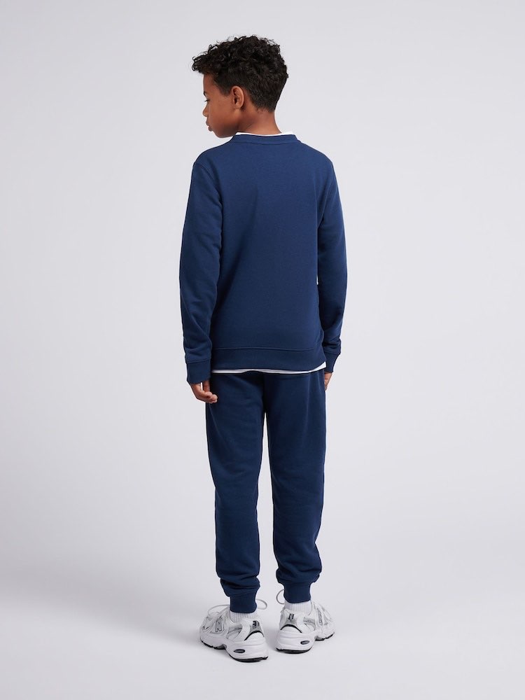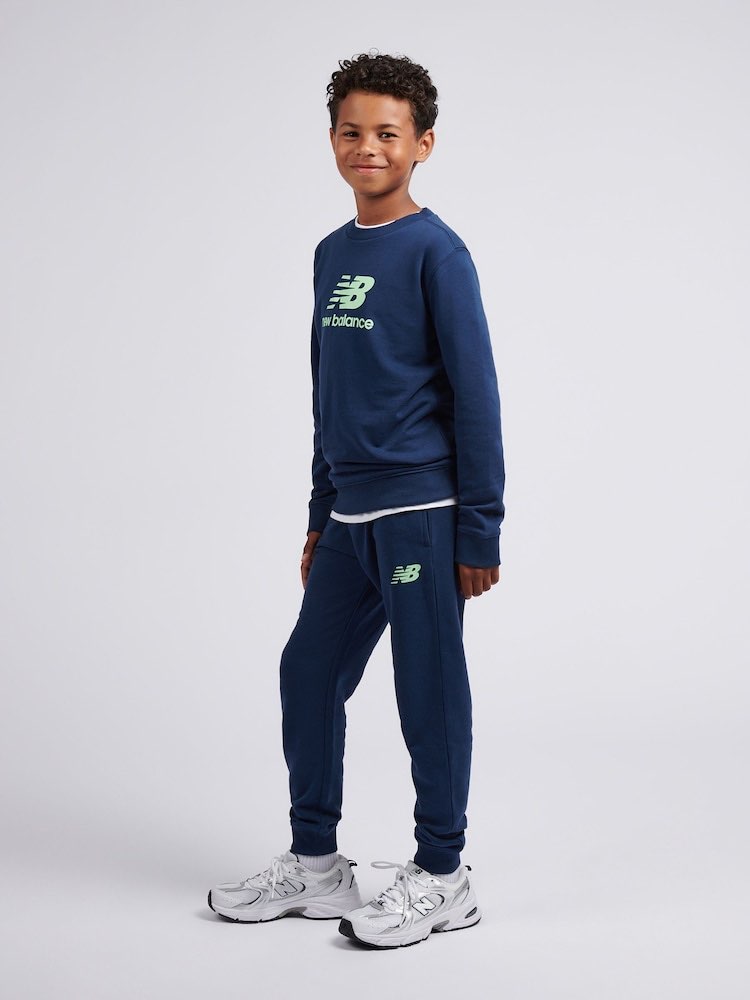 Completo sportivo in cotone garzato New Balance composto da felpa girocollo e pantaloni coordinati in blu intenso. La felpa presenta bottoni automatici sul collo per una vestibilità pratica e profilo a costine su collo, polsini e fondo. Il fronte è animato dal logo NB con scritta new balance running a contrasto nei toni dell’azzurro. I pantaloni abbinati hanno vita elasticizzata con coulisse in cordoncino e piccolo logo NB stampato sulla gamba. L’insieme di volumi morbidi e dettagli logati crea un set dall’estetica sportiva essenziale.