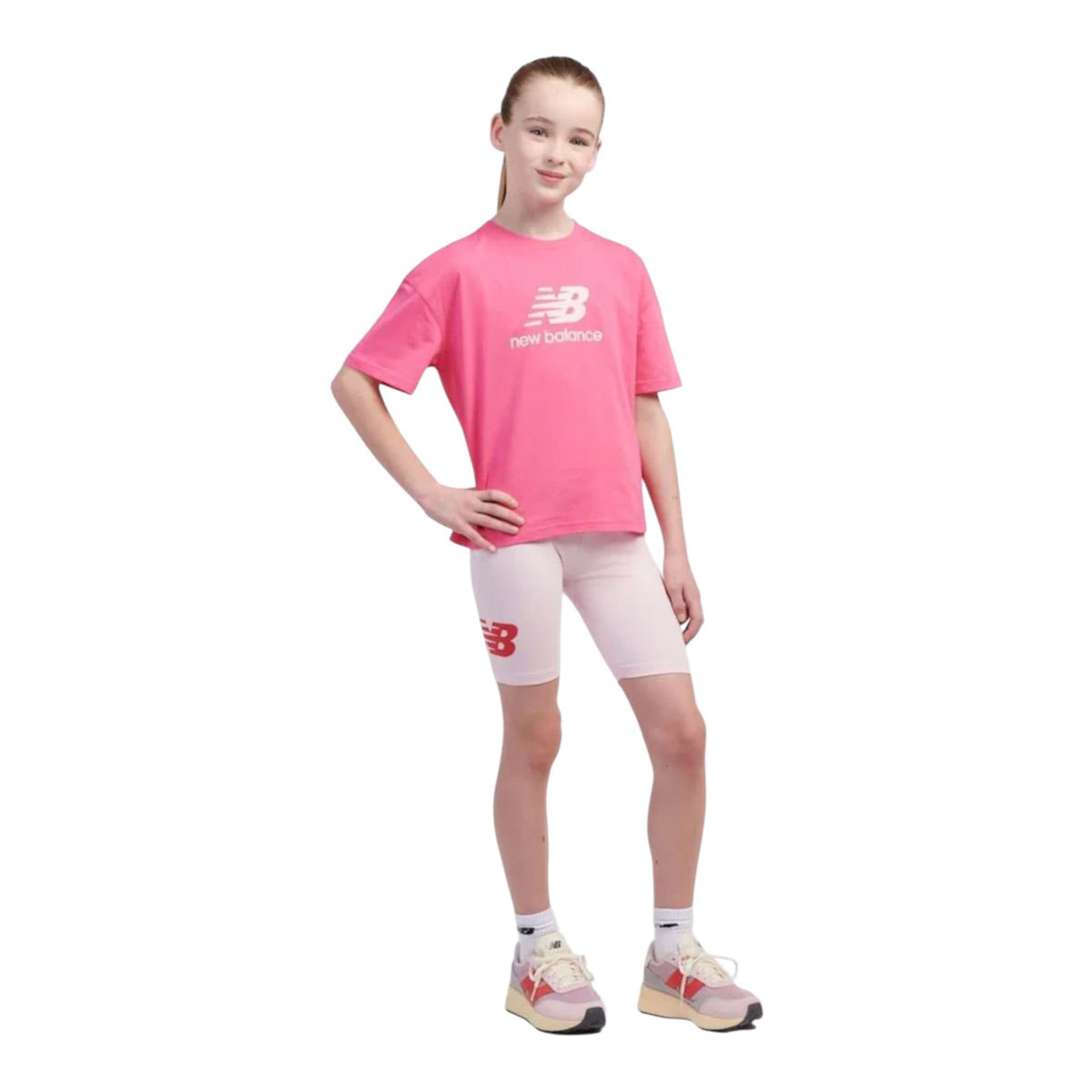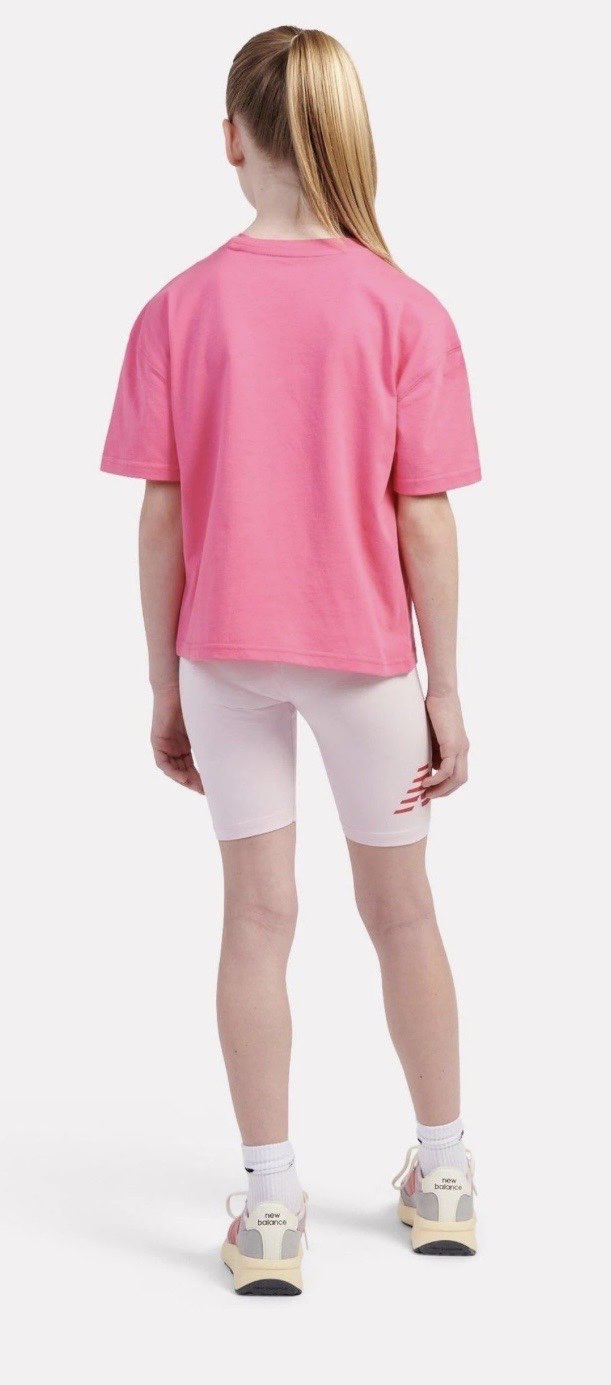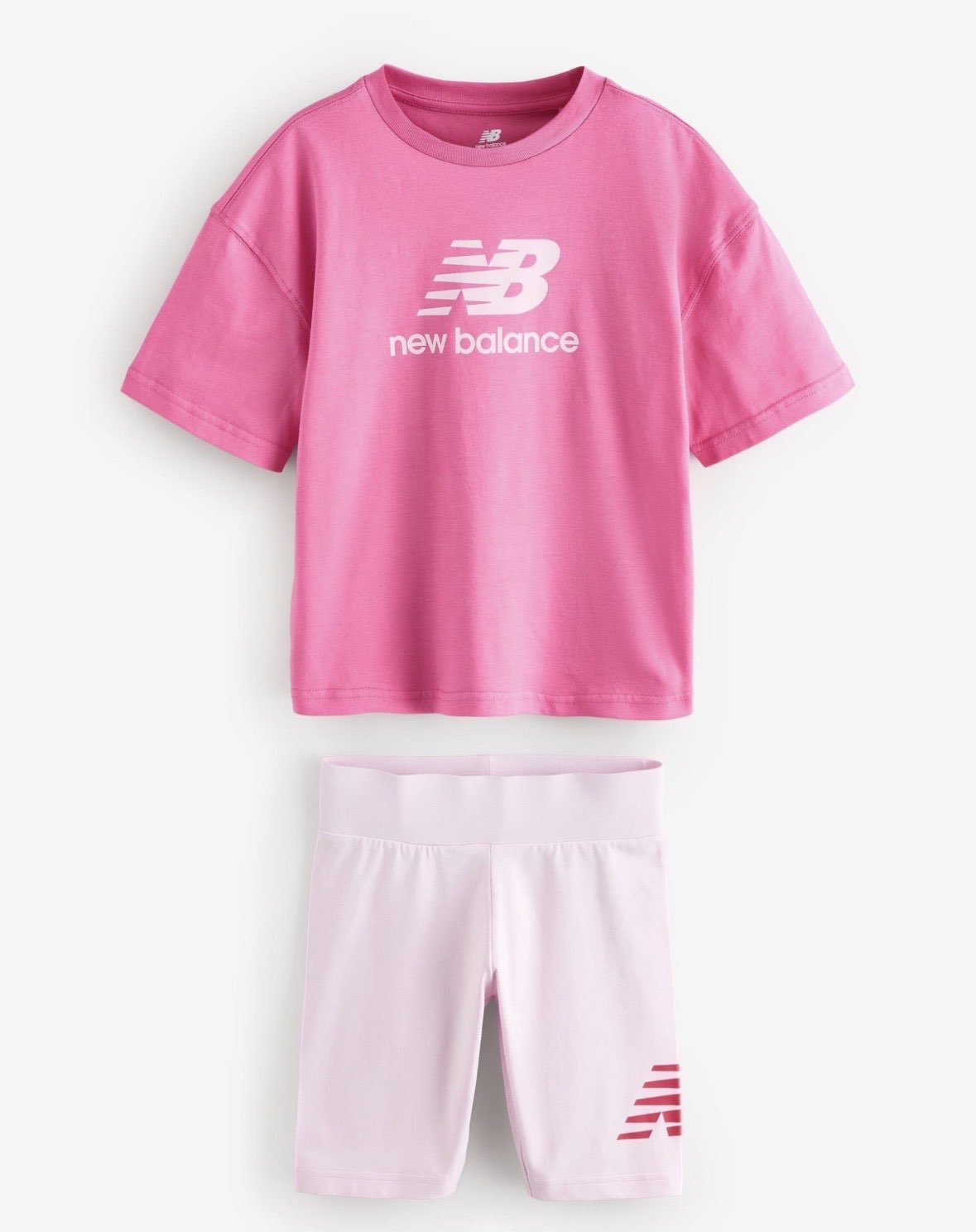Completo sportivo corto in jersey di cotone New Balance composto da T-shirt bianca e shorts blu navy. La maglia presenta girocollo a coste e maxi logo frontale NB a contrasto che richiama l’estetica heritage running del brand. I pantaloncini hanno vita elasticizzata con coulisse esterna e piccolo logo stampato sulla gamba sinistra. Linee essenziali e volumi morbidi creano un insieme dal look sportivo pulito e bilanciato.