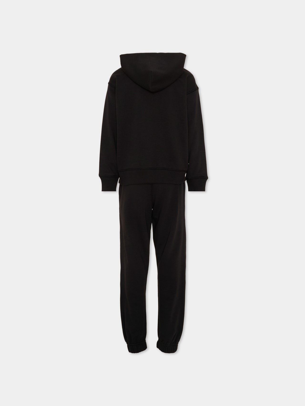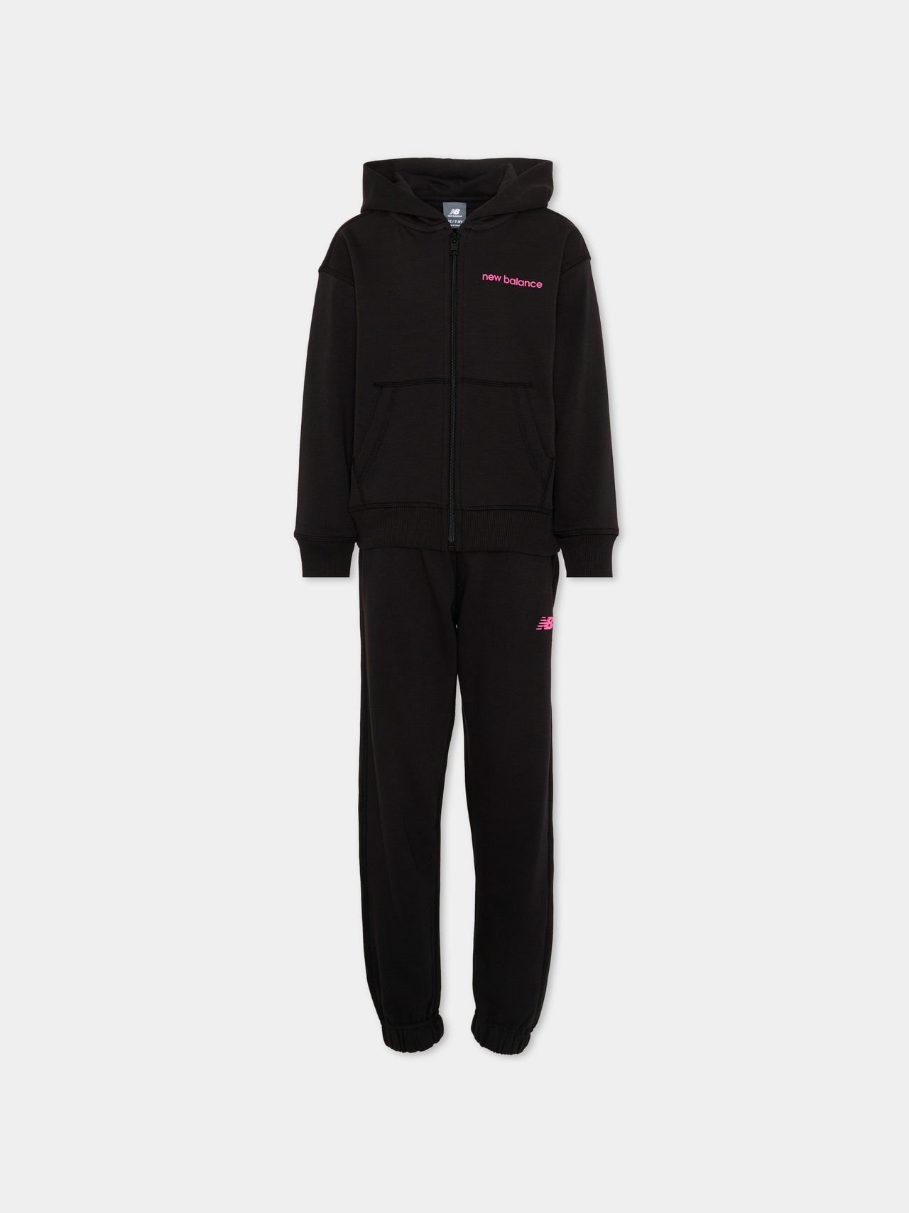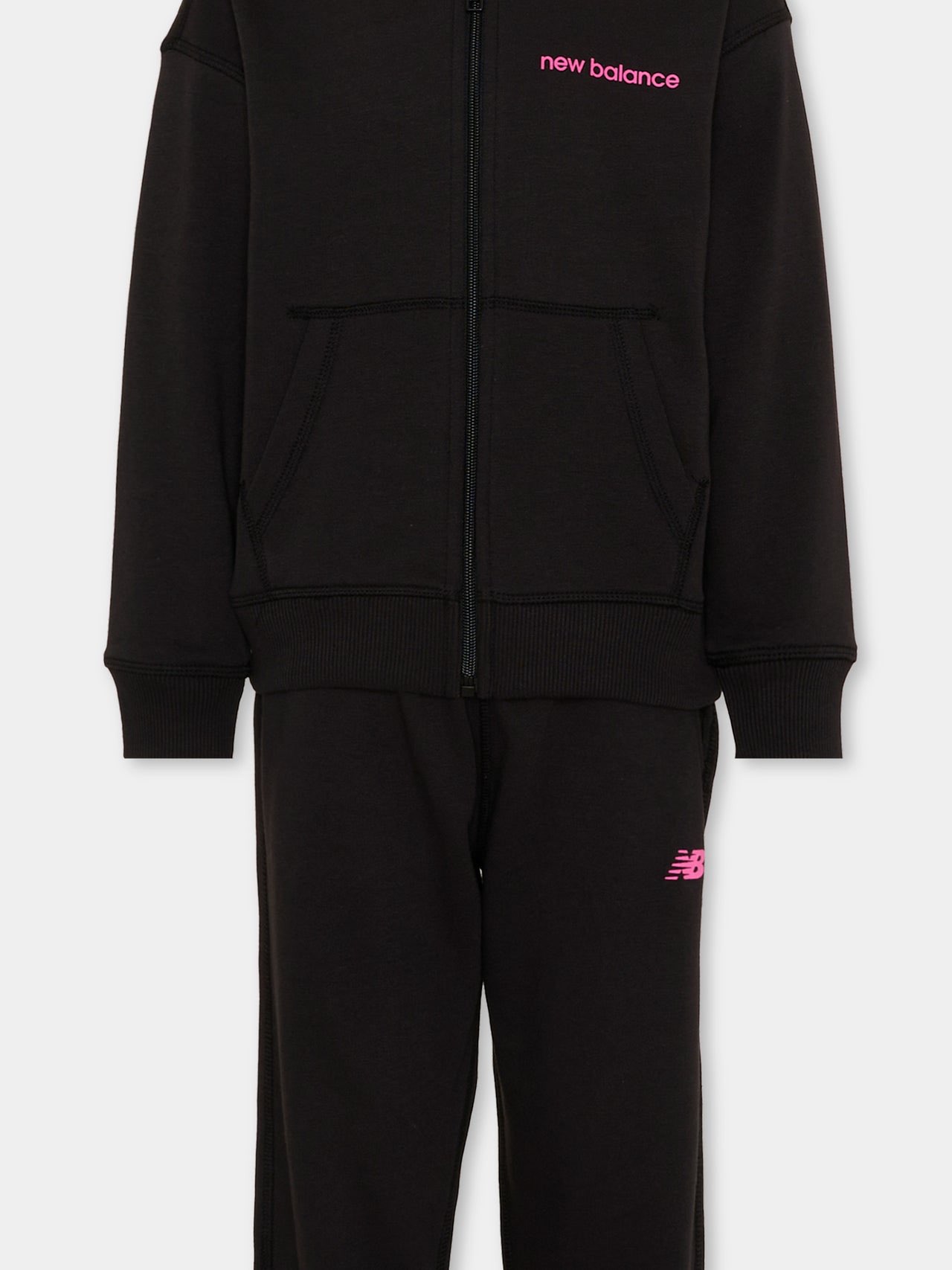 Tuta sportiva lunga in cotone spazzolato firmata New Balance, in tinta unita nera, con interno morbido e avvolgente. La felpa con cappuccio e zip integrale presenta tasche a marsupio e logo New Balance ricamato sul petto in rosa acceso. I pantaloni coordinati, con elastico in vita e polsini a costine alle caviglie, riprendono il logo a contrasto sulla coscia. Linee pulite e volumi rilassati creano un completo essenziale dall'impatto grafico definito dai dettagli del brand.