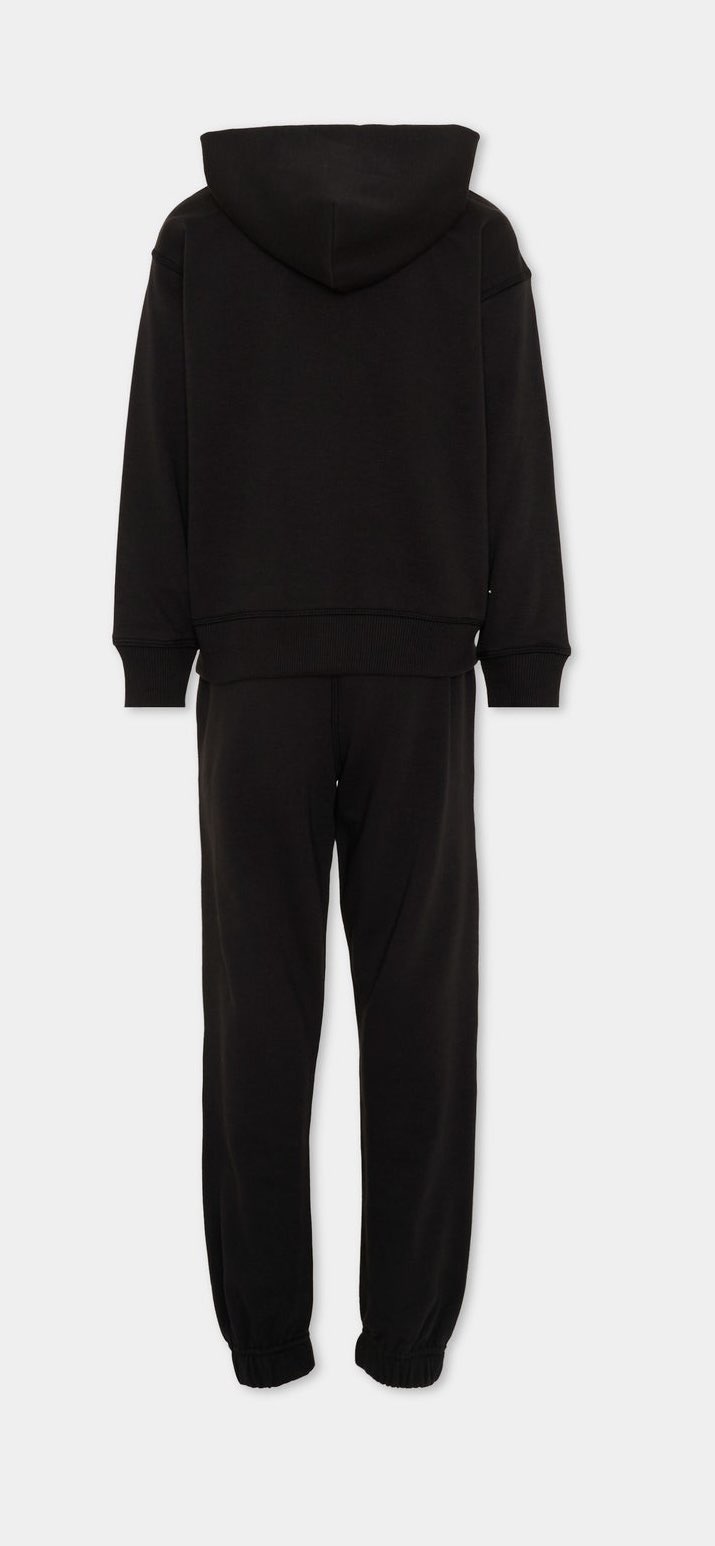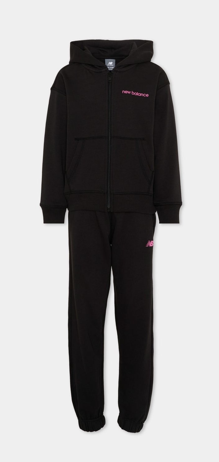 Tuta sportiva lunga in cotone spazzolato firmata New Balance, in tinta unita nera, con interno morbido e avvolgente. La felpa con cappuccio e zip integrale presenta tasche a marsupio e logo New Balance ricamato sul petto in rosa acceso. I pantaloni coordinati, con elastico in vita e polsini a costine alle caviglie, riprendono il logo a contrasto sulla coscia. Linee pulite e volumi rilassati creano un completo essenziale dall'impatto grafico definito dai dettagli del brand.