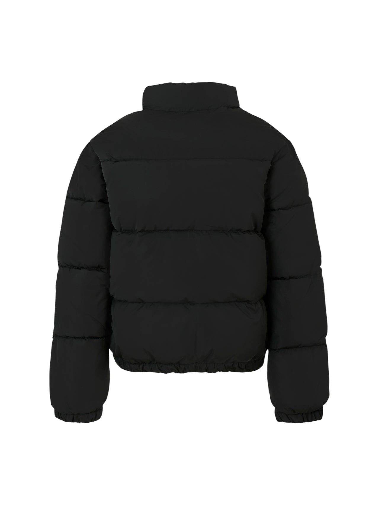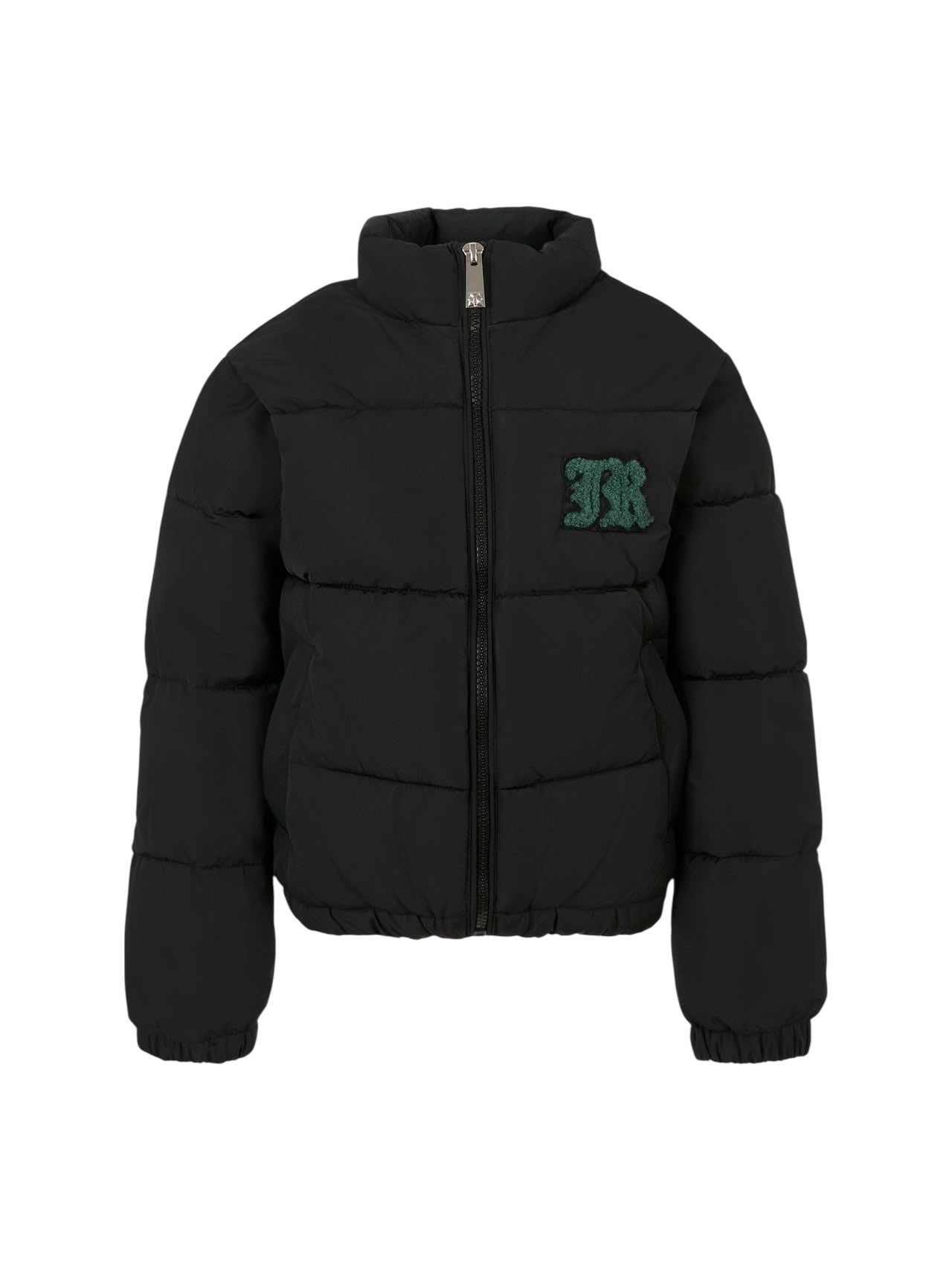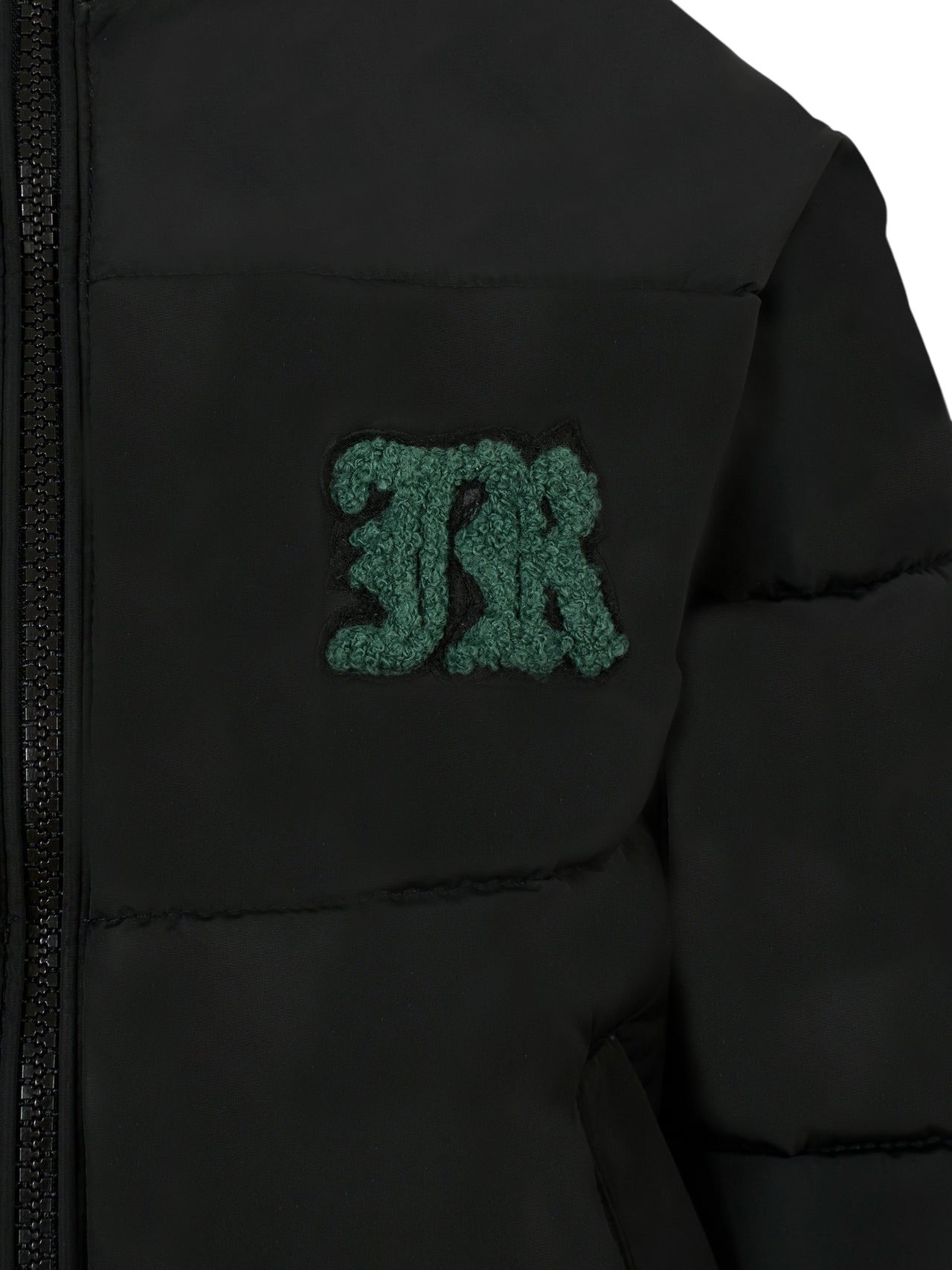 Piumino nero pesante, imbottito e trapuntato, con collo alto, chiusura frontale con zip, tasche laterali, polsini e orlo elasticizzato. È decorato con monogramma del logo in spugna sul petto.