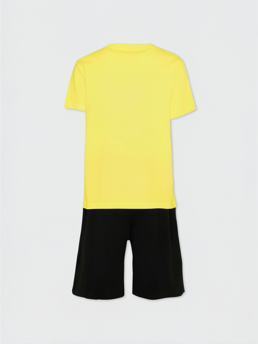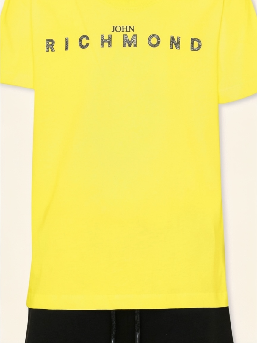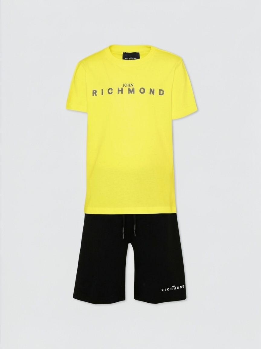 Completo sportivo corto in jersey di cotone Richmond composto da T-shirt bianca e shorts neri coordinati. La maglia presenta girocollo pulito e maxi logo frontale con effetto leggermente a rilievo che richiama l’estetica urbana del brand. I bermuda in felpa leggera con vita elasticizzata e coulisse mantengono una vestibilità confortevole, completata dal logo a contrasto sul fondo gamba. L’abbinamento grafico bianco e nero con loghi a vista crea un insieme essenziale dall’impatto deciso