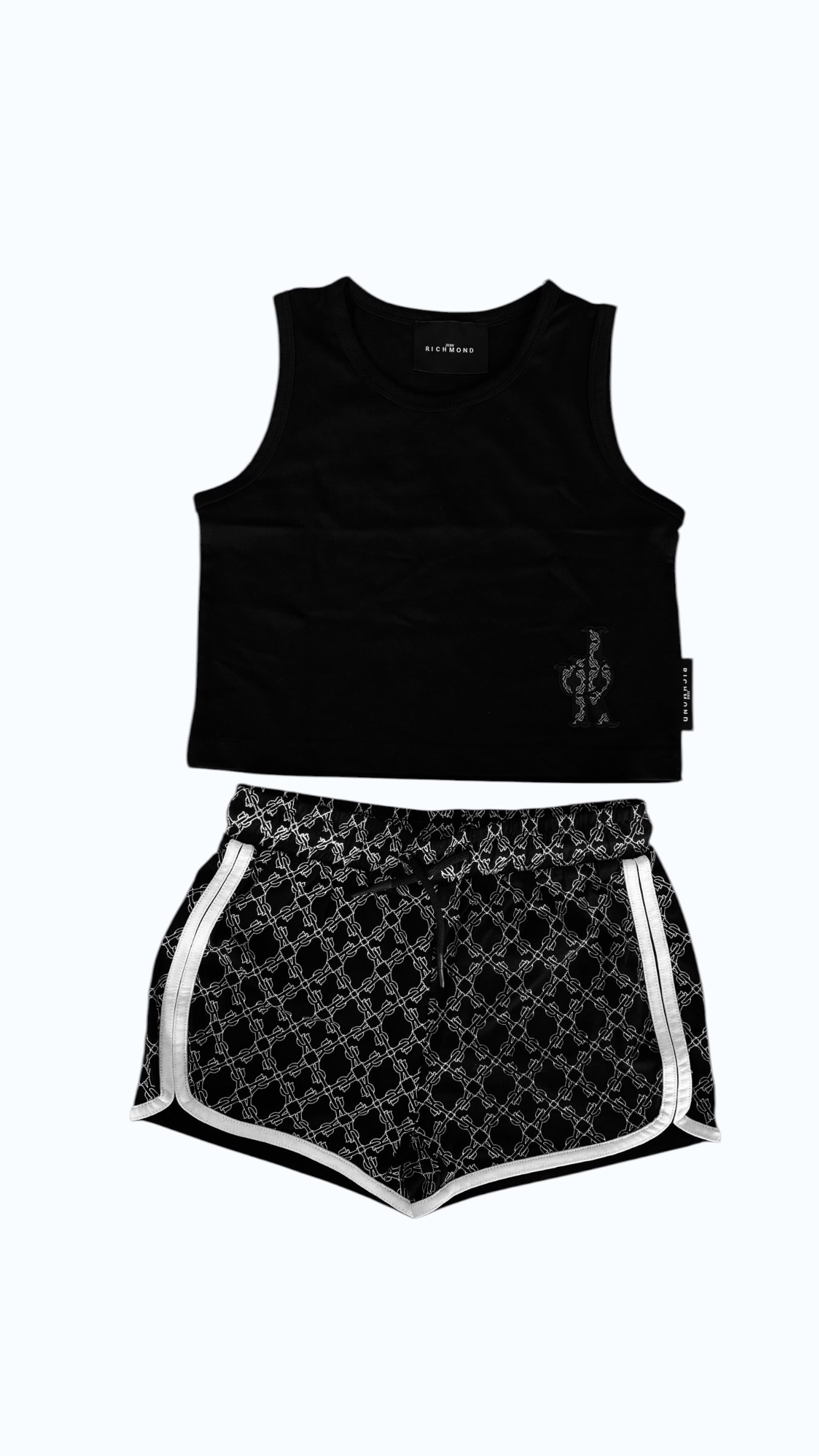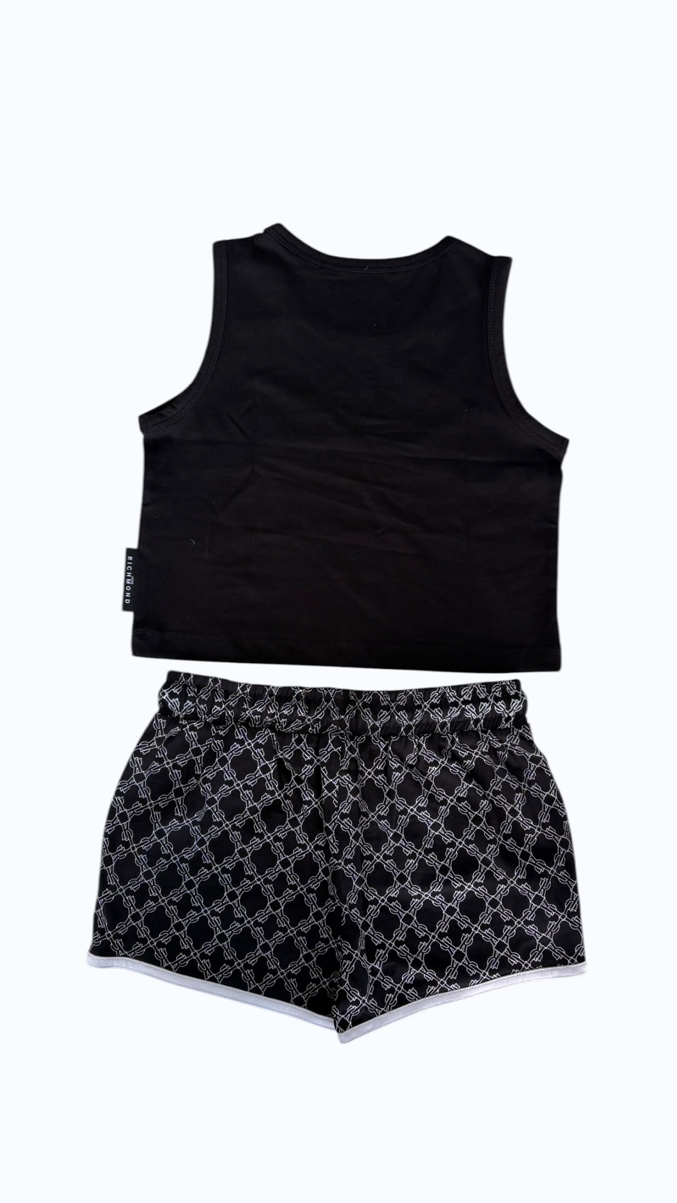 Il completo è composto da un crop top nero dal design minimal con un discreto logo sul davanti, che offre eleganza e versatilità negli abbinamenti. Gli shorts presentano un'accattivante stampa all-over con il caratteristico motivo del brand, oltre a dettagli bianchi sulle finiture che ne sottolineano il carattere sportivo. L'elastico in vita con coulisse assicura una vestibilità comoda e stabile, mentre il tessuto morbido offre libertà di movimento per tutto il giorno. Composizione: 100% cotone.