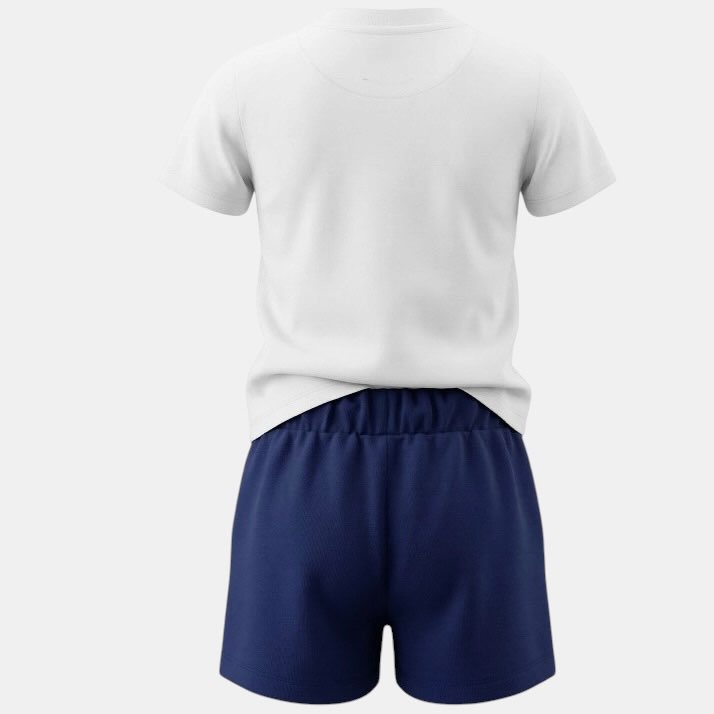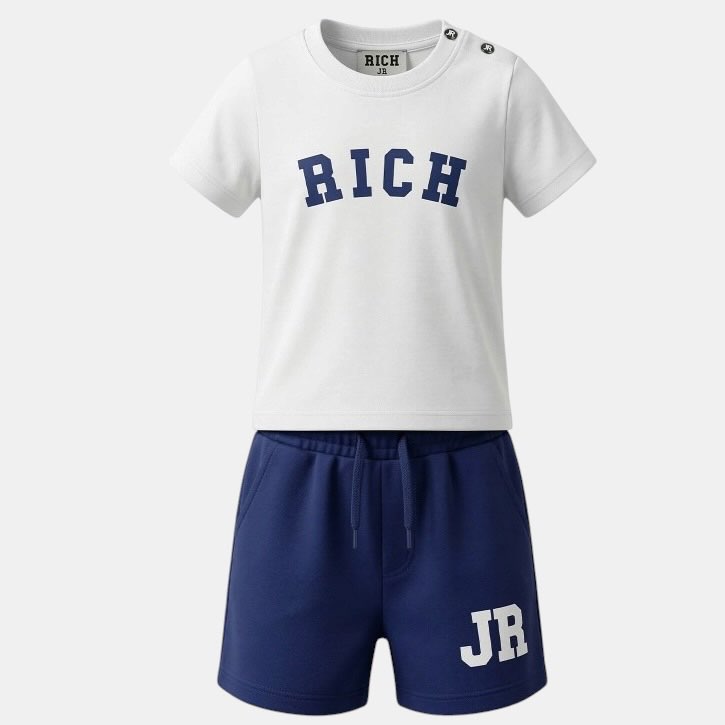 Completo sportivo corto in jersey di cotone Richmond composto da T-shirt bianca e shorts neri coordinati. La maglia presenta girocollo pulito e maxi logo frontale con effetto leggermente a rilievo che richiama l’estetica urbana del brand. I bermuda in felpa leggera con vita elasticizzata e coulisse mantengono una vestibilità confortevole, completata dal logo a contrasto sul fondo gamba. L’abbinamento grafico bianco e nero con loghi a vista crea un insieme essenziale dall’impatto deciso
