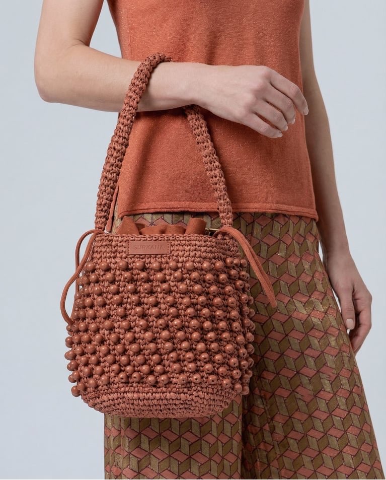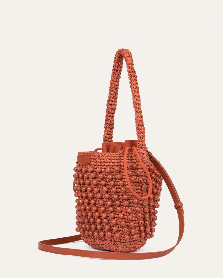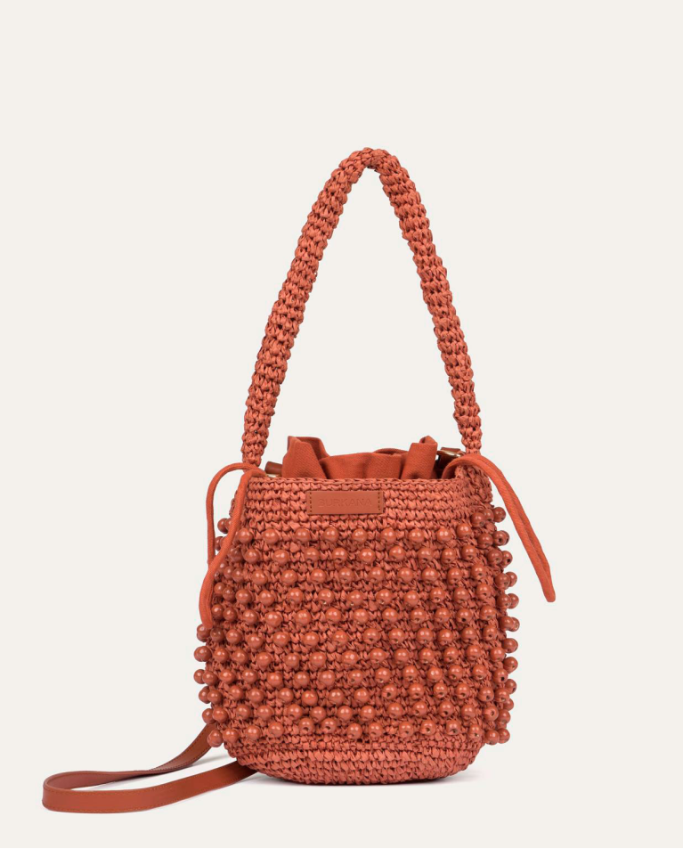 Borsa realizzata in carta rafia con una decorazione esterna a rilievo di perline di legno. Dotata di manico superiore intrecciato per il trasporto a spalla e di una lunga tracolla regolabile.