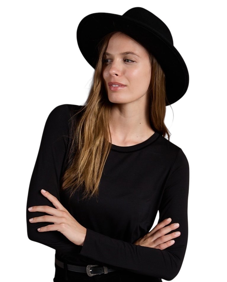 Cappello fedora in 100% lana, con tesa a punta e tesa media. Il suo design elegante e senza tempo lo rende l'accessorio perfetto per elevare qualsiasi look invernale con un'aria sofisticata.