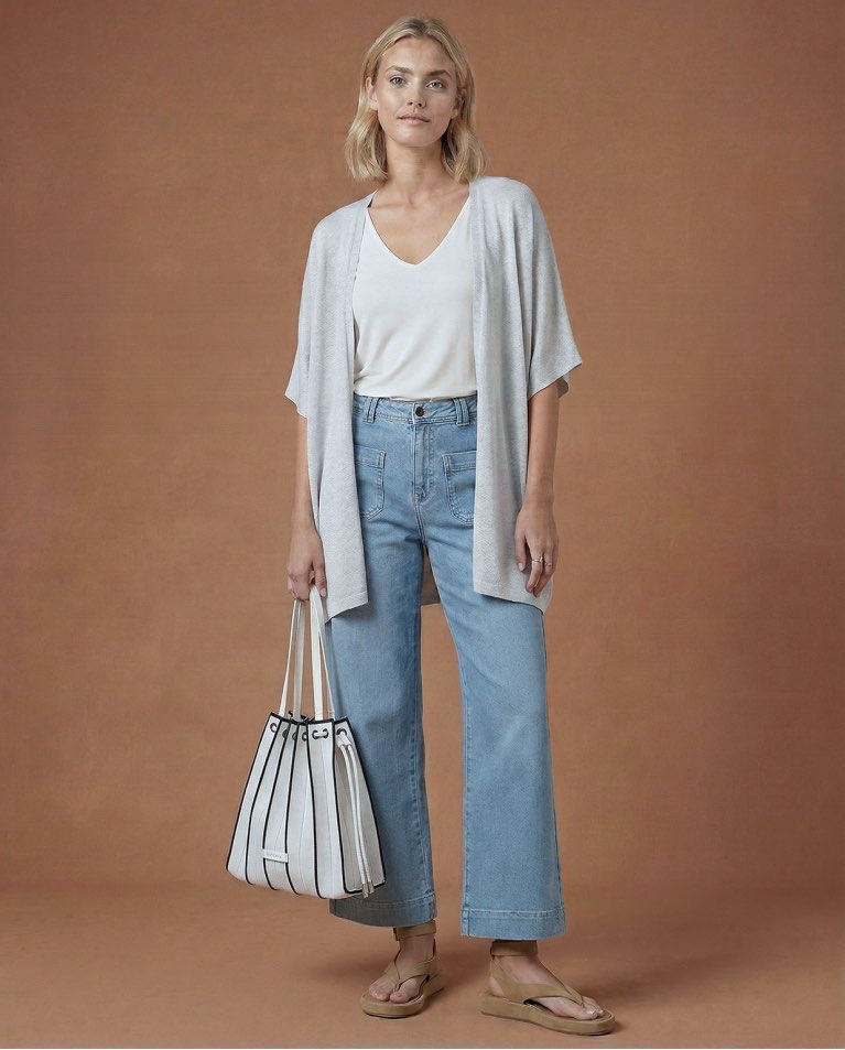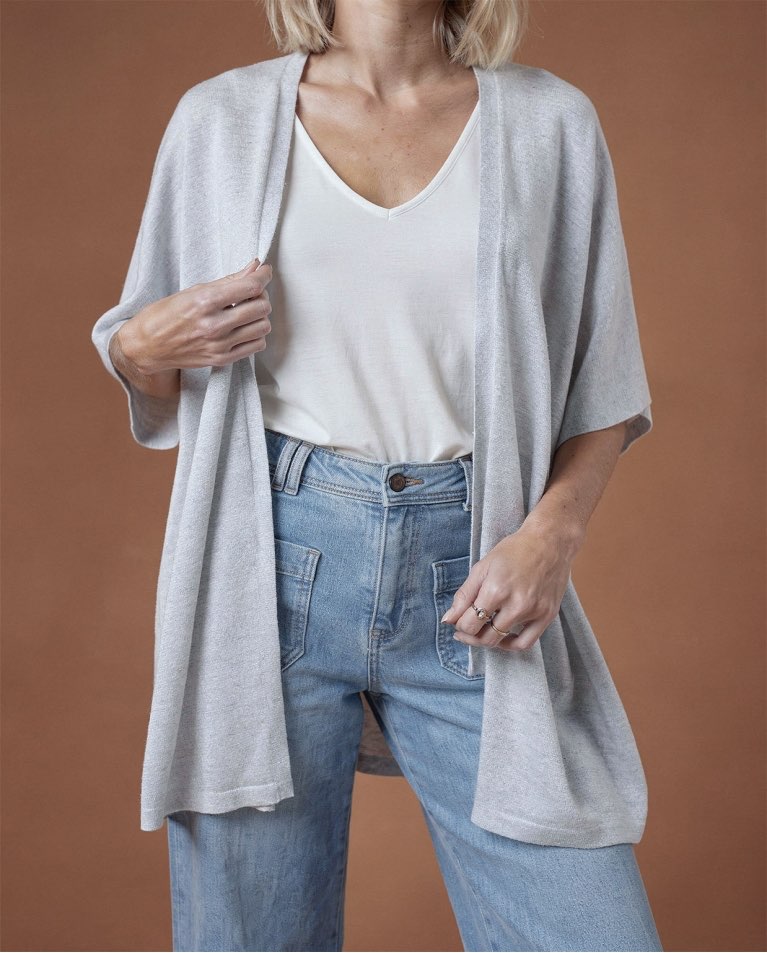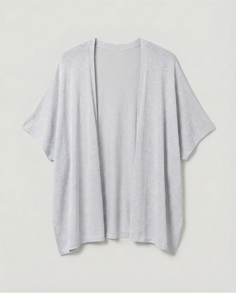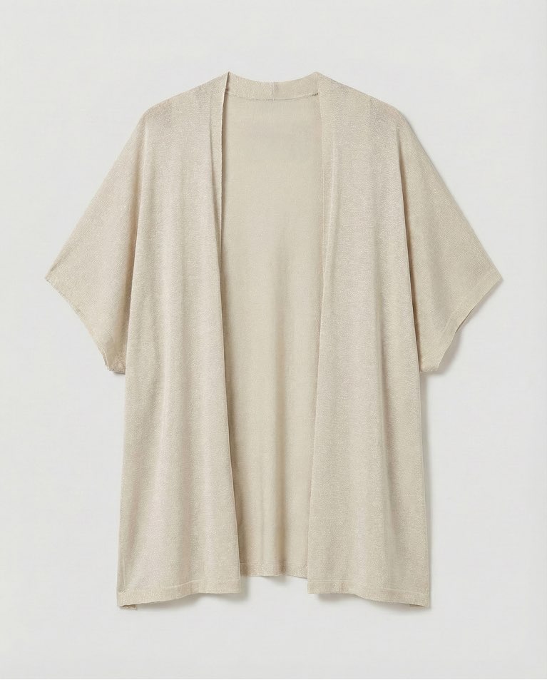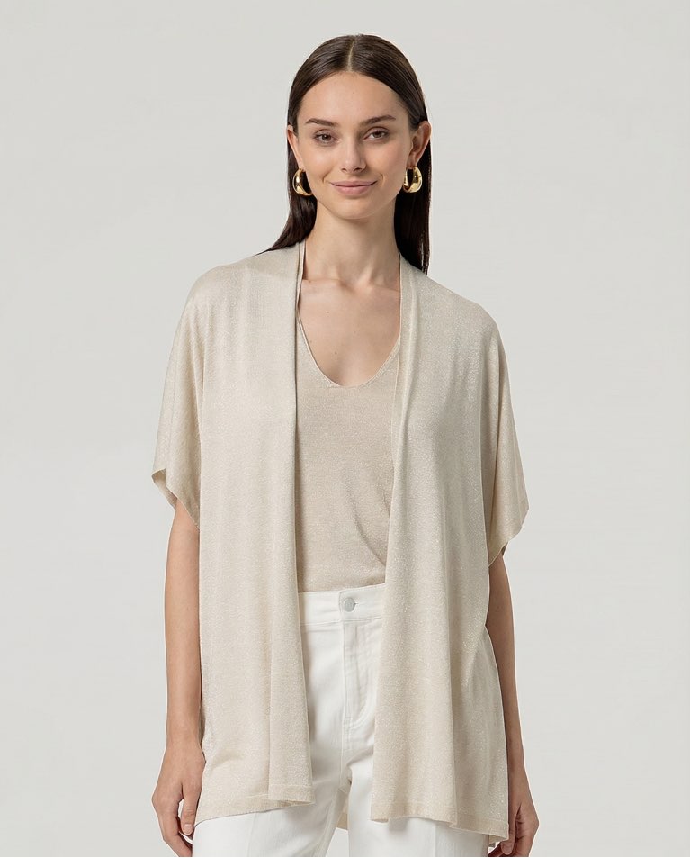 Poncho aperto con scollo a V e ampie maniche corte. Modello aperto dalla silhouette dritta e dal drappeggio morbido. Realizzato in tessuto a maglia fine con finitura lucida.