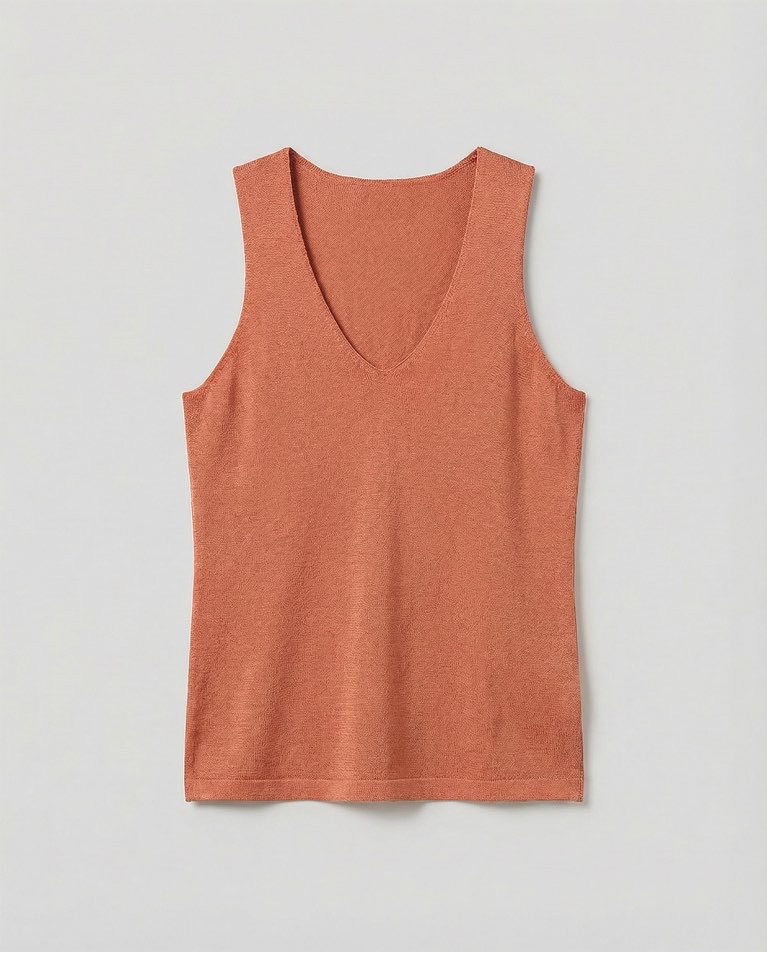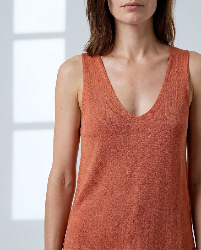Top senza maniche con scollo a V sul davanti e sul retro. Silhouette dritta dalle linee pulite e dalla struttura semplice. Realizzato in un tessuto liscio a maglia fine con filo lurex.