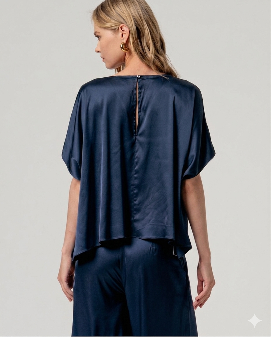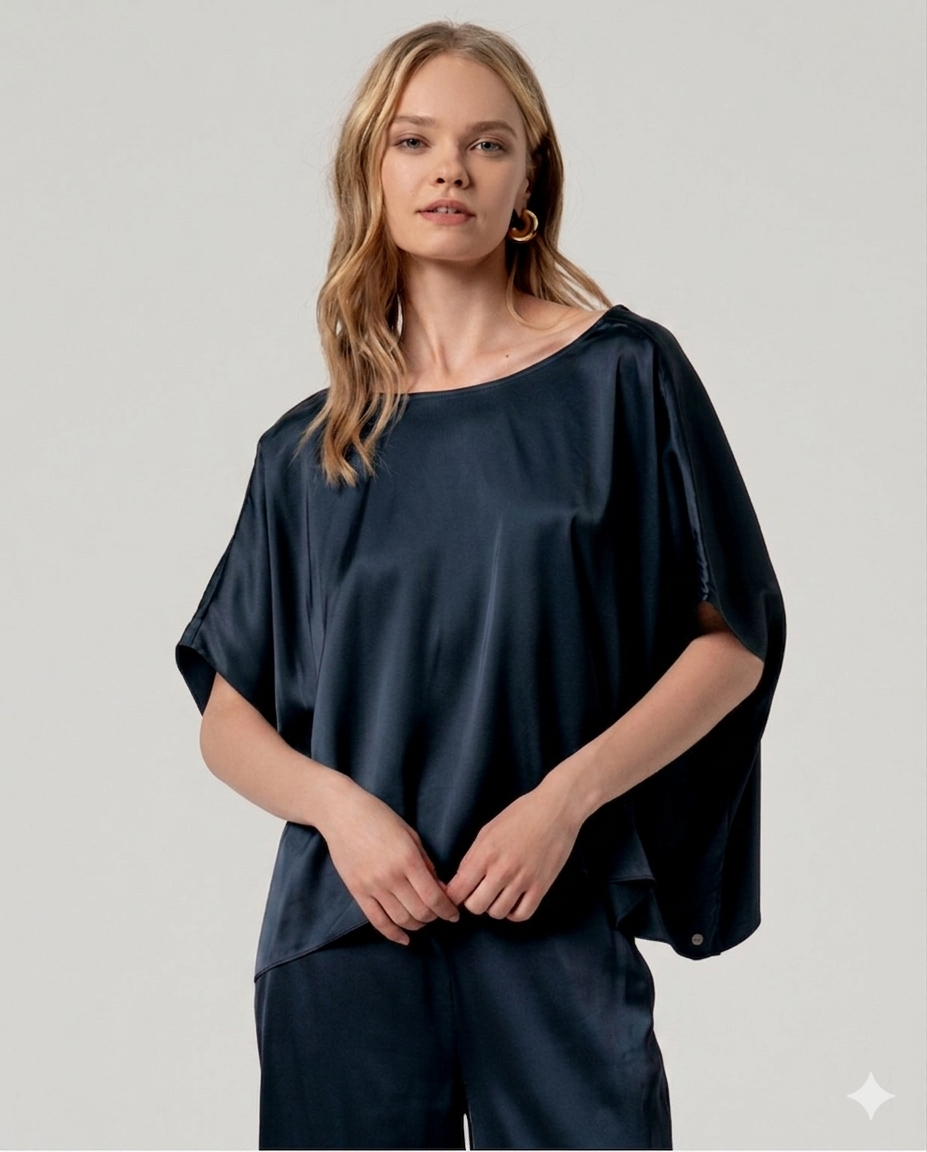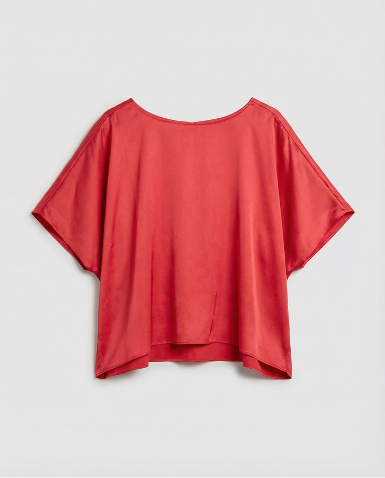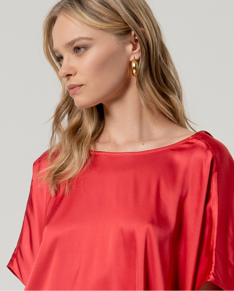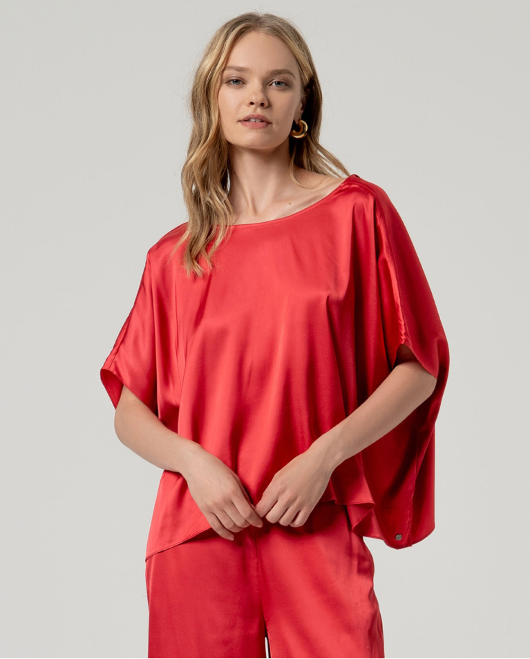 Camicetta a girocollo con maniche corte, ampie e a mantellina. Modello dalla vestibilità morbida con drappeggio fluido e orlo dritto. Presenta un frontale pulito e senza cuciture con maggiore ampiezza sui lati. Realizzata in tessuto leggero.