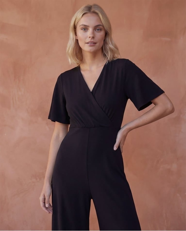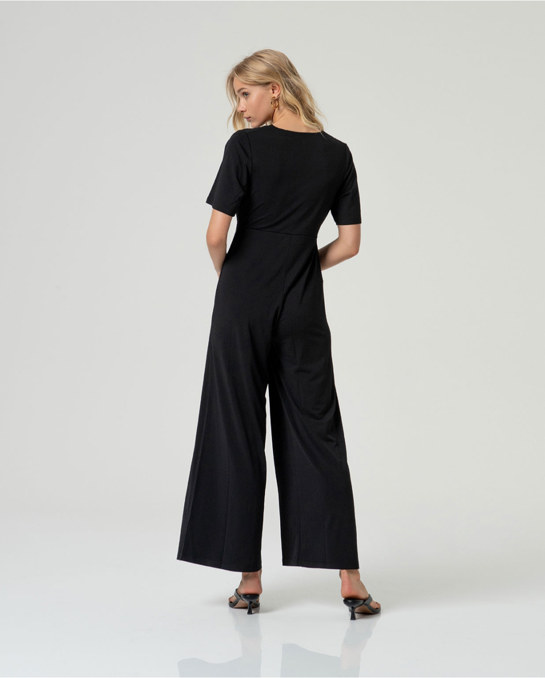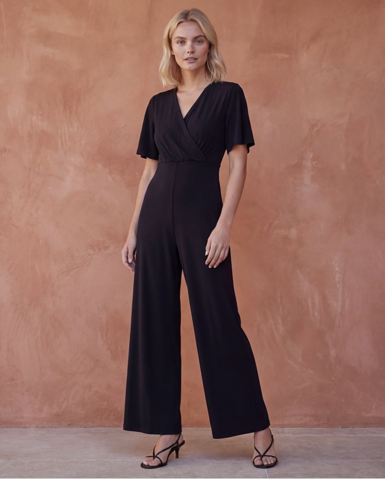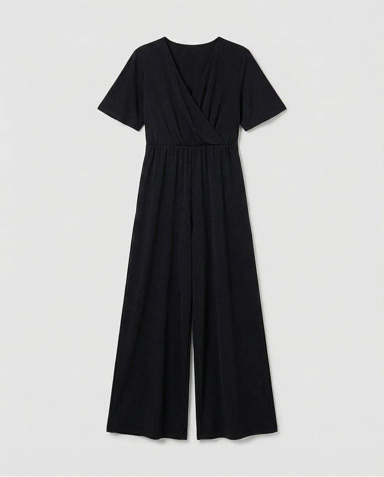 Tuta a vita alta con gamba ampia e dritta. Scollo a V incrociato e maniche corte e fluide. Dettaglio aderente in vita con cucitura elasticizzata e arricciatura. Realizzata in un tessuto fluido misto di poliestere riciclato ed elastan.