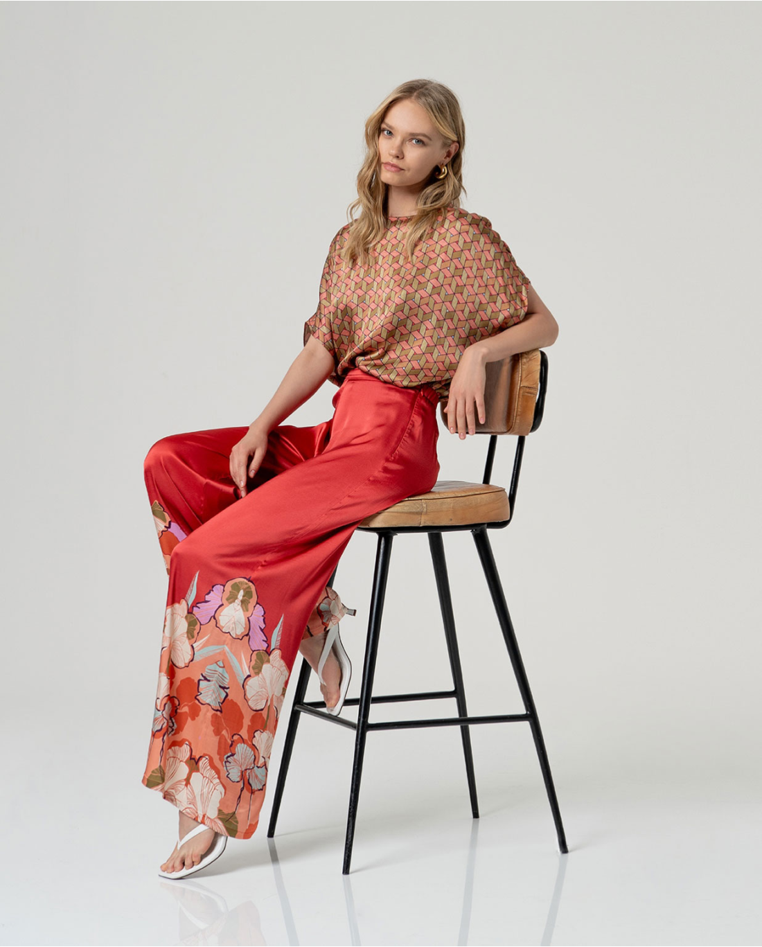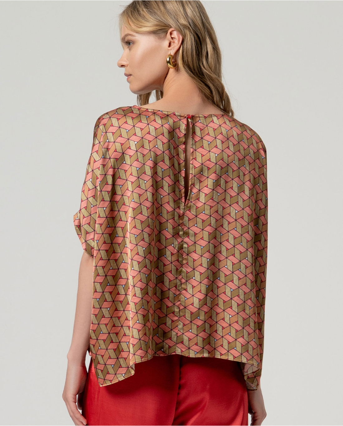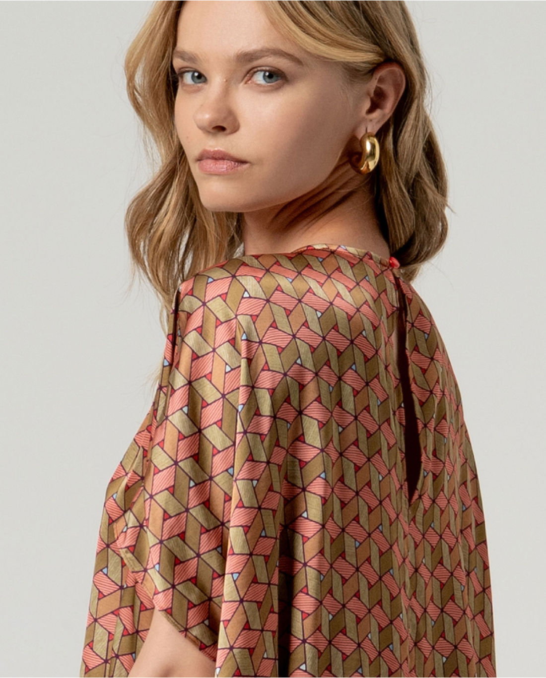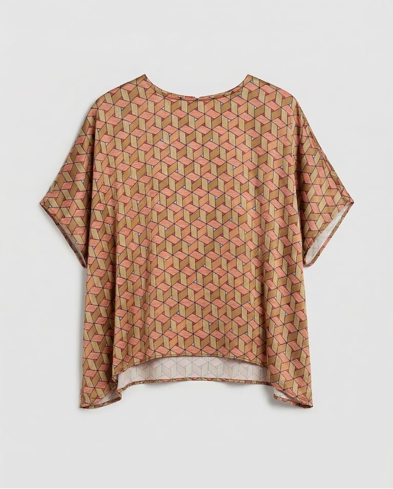 Camicetta a mantella con scollo rotondo e maniche incorporate. Vestibilità ampia con drappeggio morbido e orlo asimmetrico. Realizzata in un leggero tessuto stampato misto viscosa, rayon ed elastan.